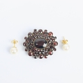 A Victorian bohemian style brooch, designed as a styled cluster brooch with fancy cut garnets set throughout, hinge pin to reverse, 4cm wide, with a pair of cultured pearl stud earrings, 7mm diameter (3)