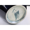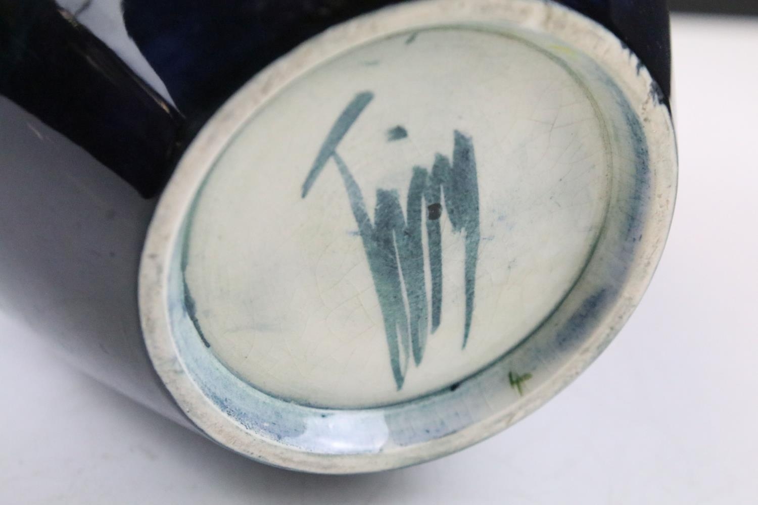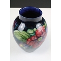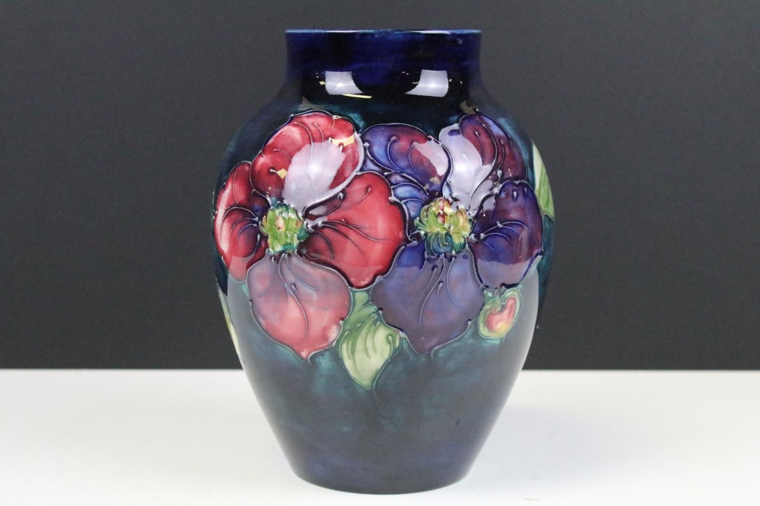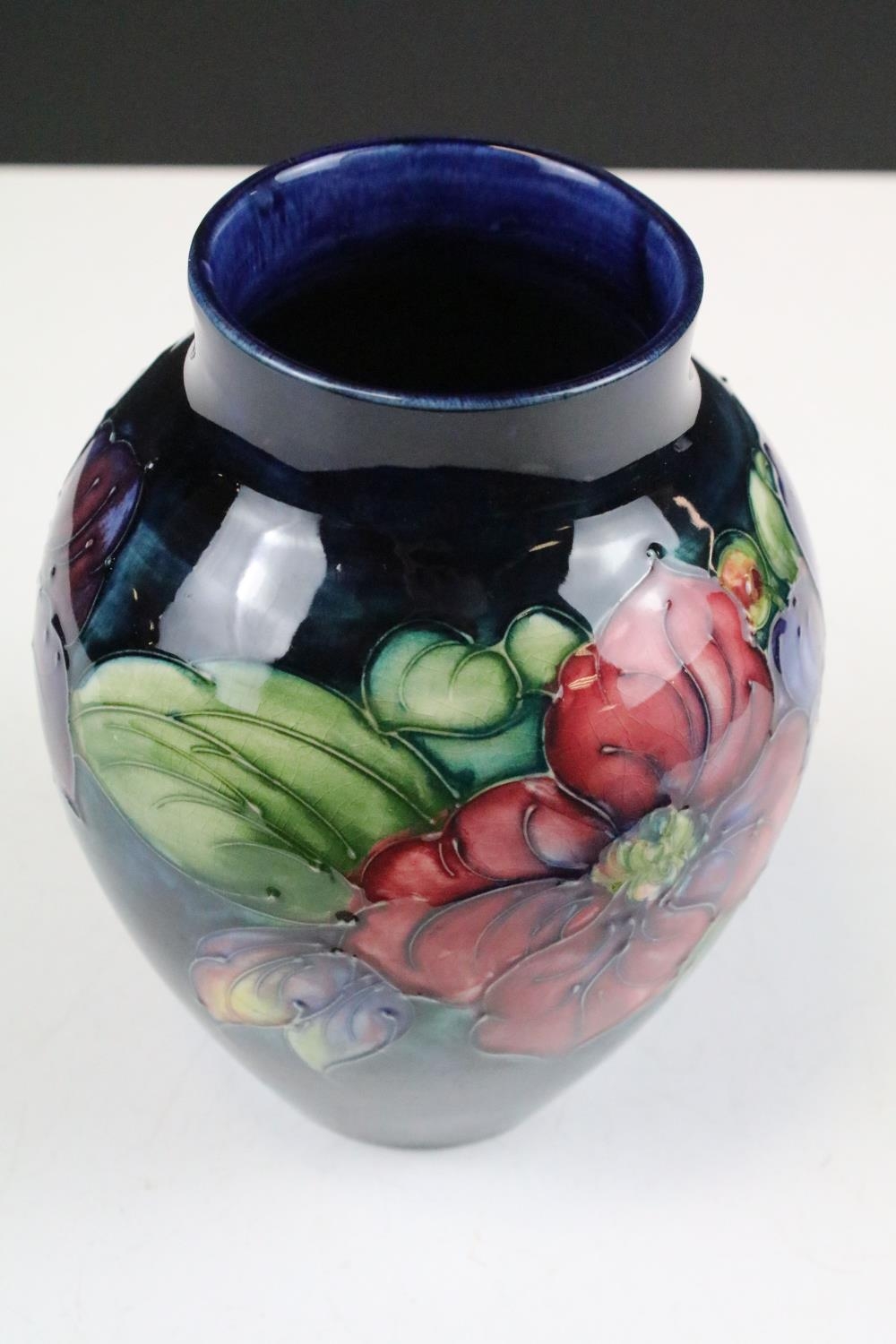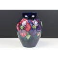 Moorcroft Clematis vase having a navy blue ground with tube lined florals. painted signature to base. Measures 18cm tall.