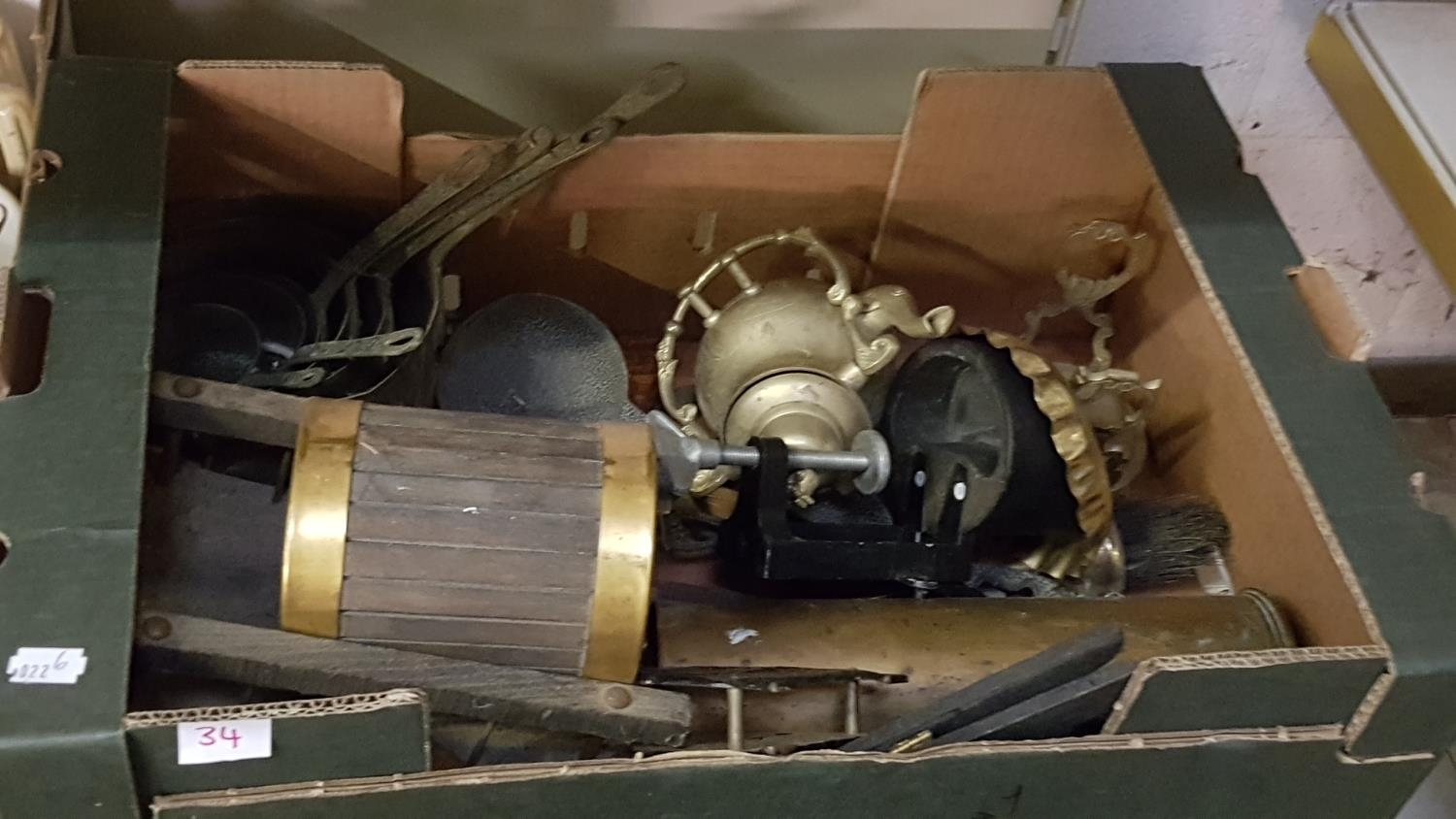 Box of Assorted Brassware Including Graduated Pans, Shell Casing, Kettle on Burner Stand etc.