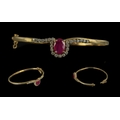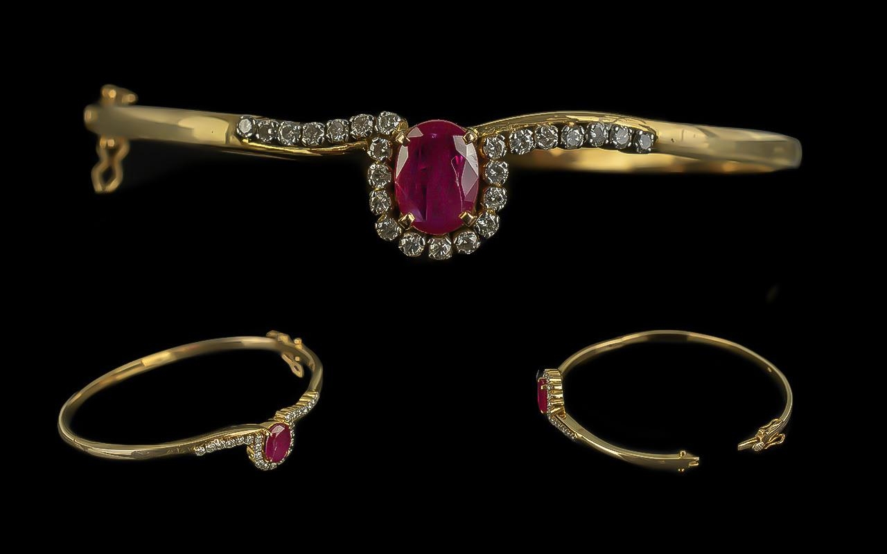 A Fine Quality - Attractive 9ct Gold Ruby and Diamond Set Hinged Bangle. Marked 9ct. The Large Faceted Ruby of Good Colour, Est Weight 3.00 cts, Surrounded by 12 Brilliant Cut Diamonds and a Further 12 Brilliant Cut Diamonds to Sides. Est Diamond Weight 1.44 cts. Excellent Condition In All Aspects. Weight 18,8 grams.