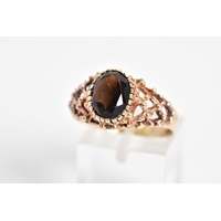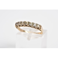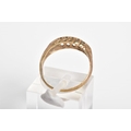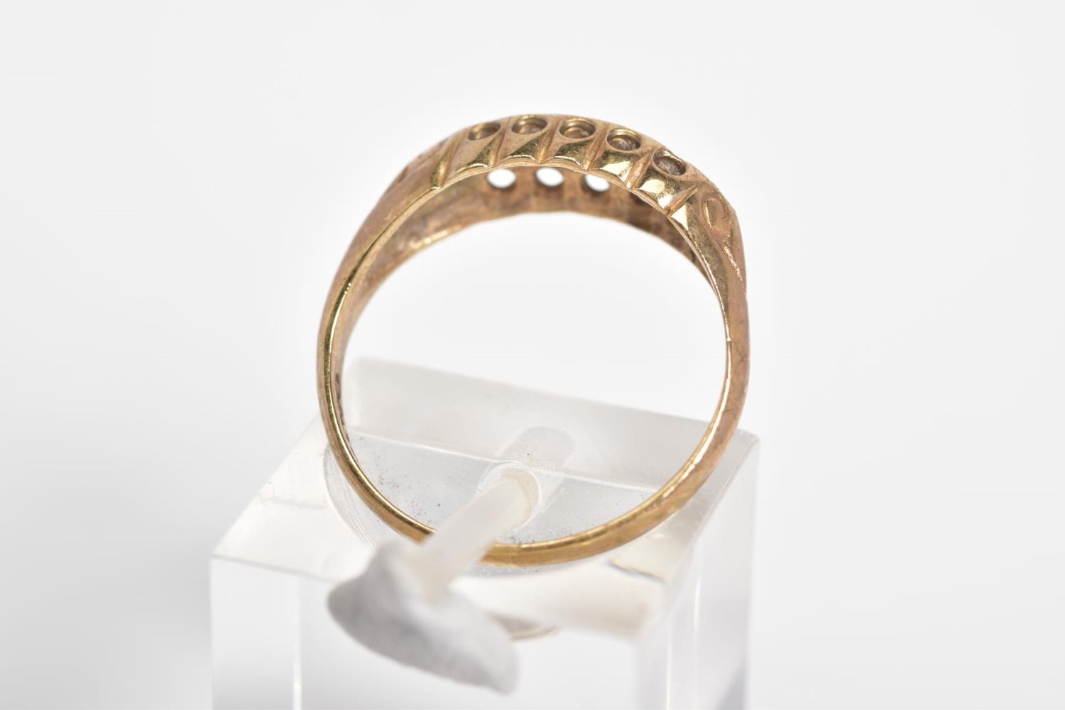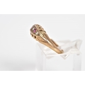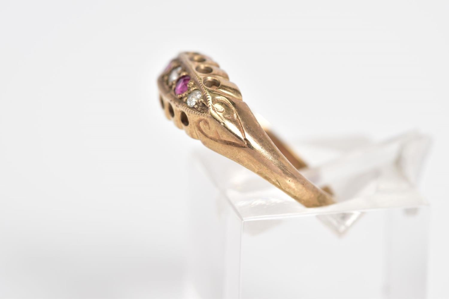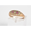 AN EARLY 20TH CENTURY 9CT GOLD, RUBY AND DIAMOND BOAT RING, set with a central single cut diamond interspaced with circular cut rubies and two further brilliant cut diamonds, within an openwork gallery and scroll detail shoulders, with a 9ct hallmark for Birmingham, ring size K, approximate weight 1.8 grams