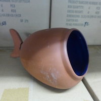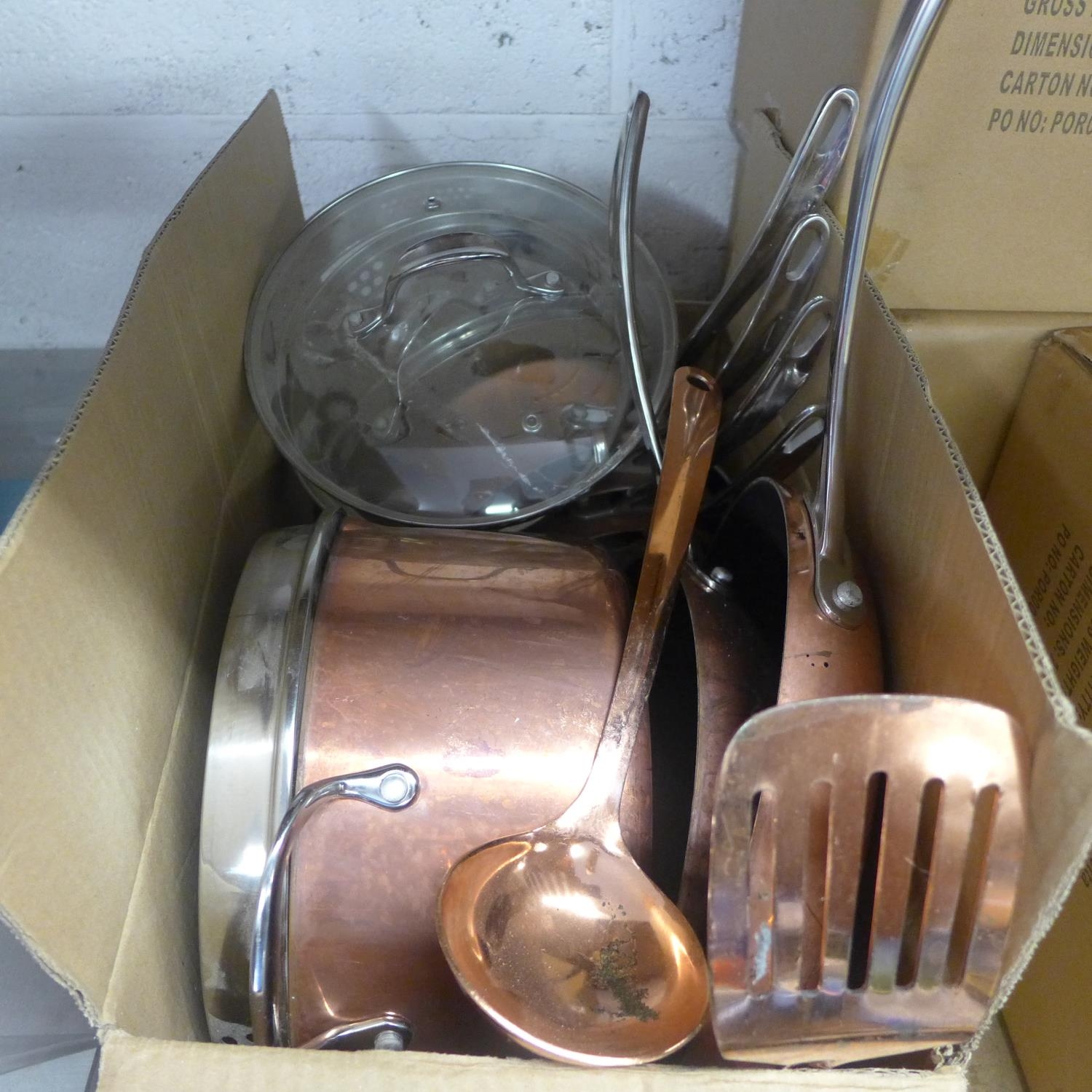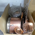 Set of 6 copper coated pans with lids where appropriate, ladle & fish slice