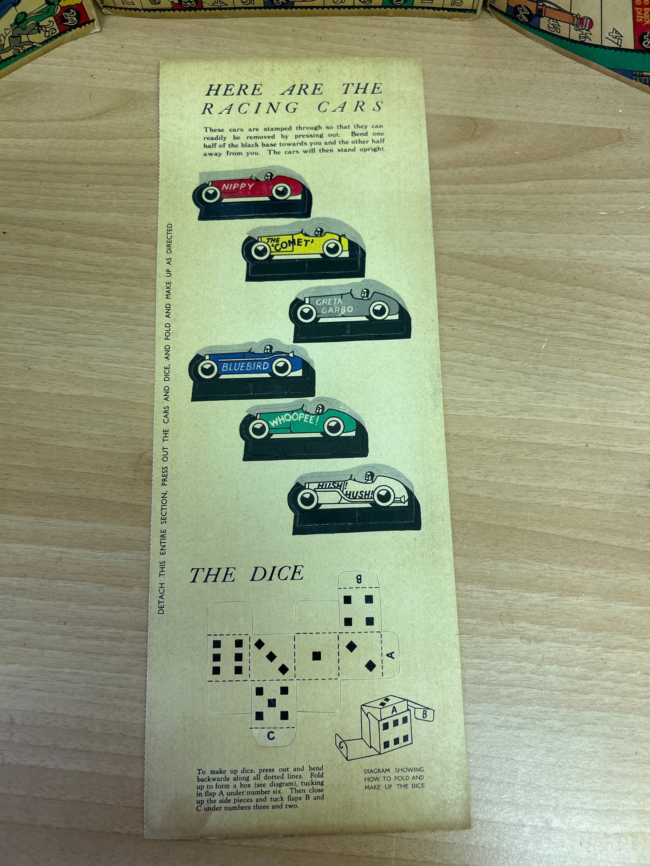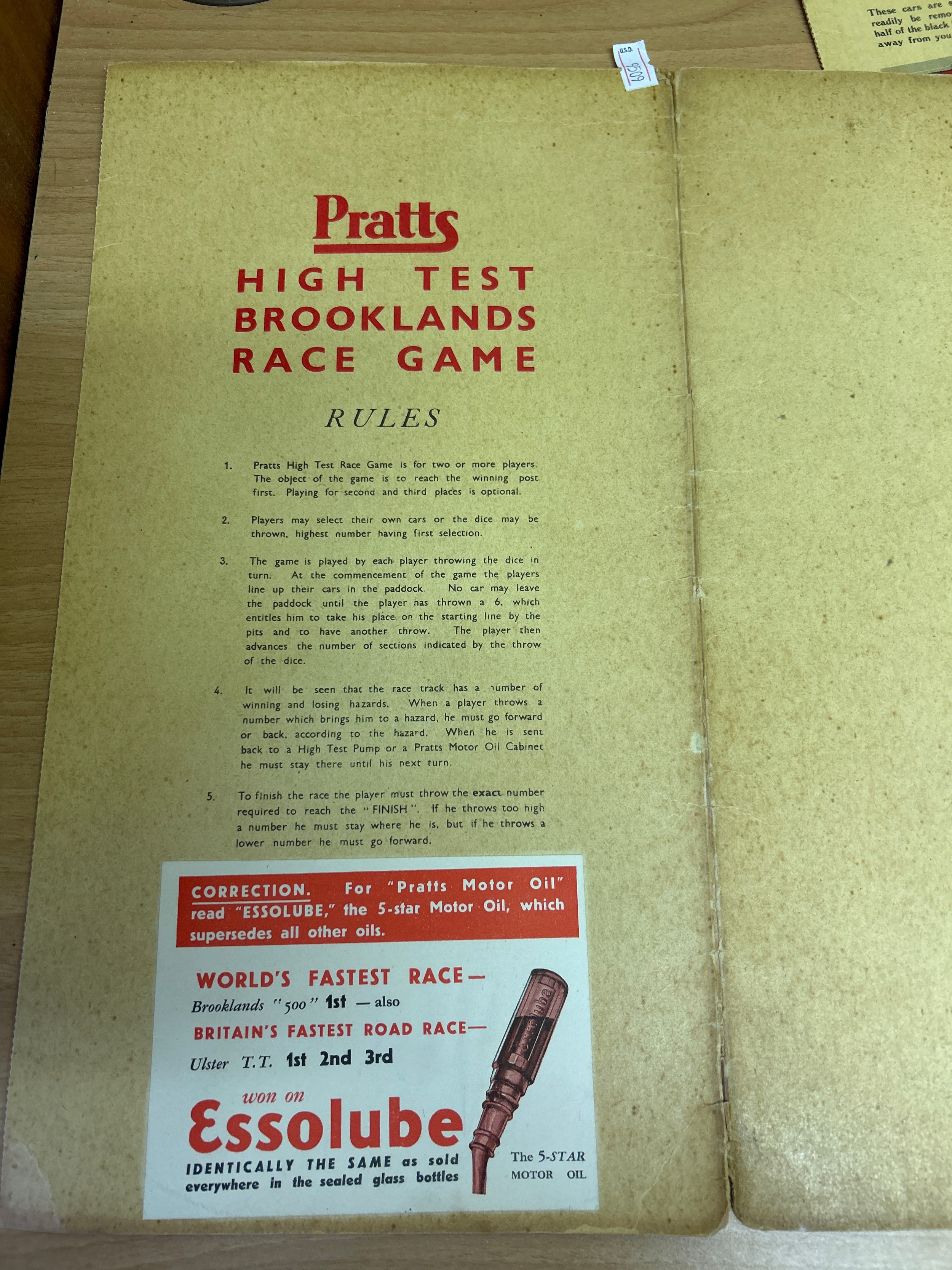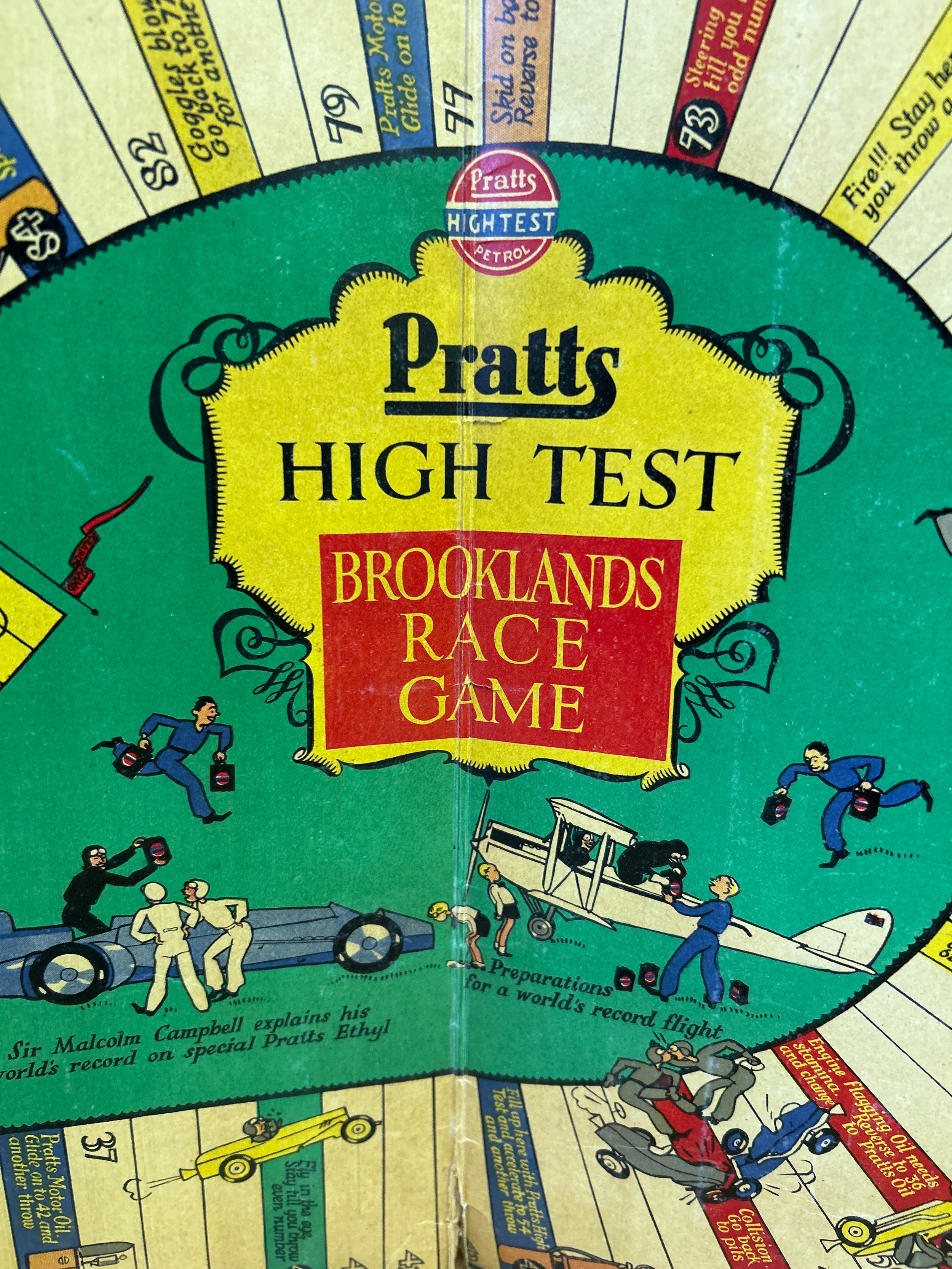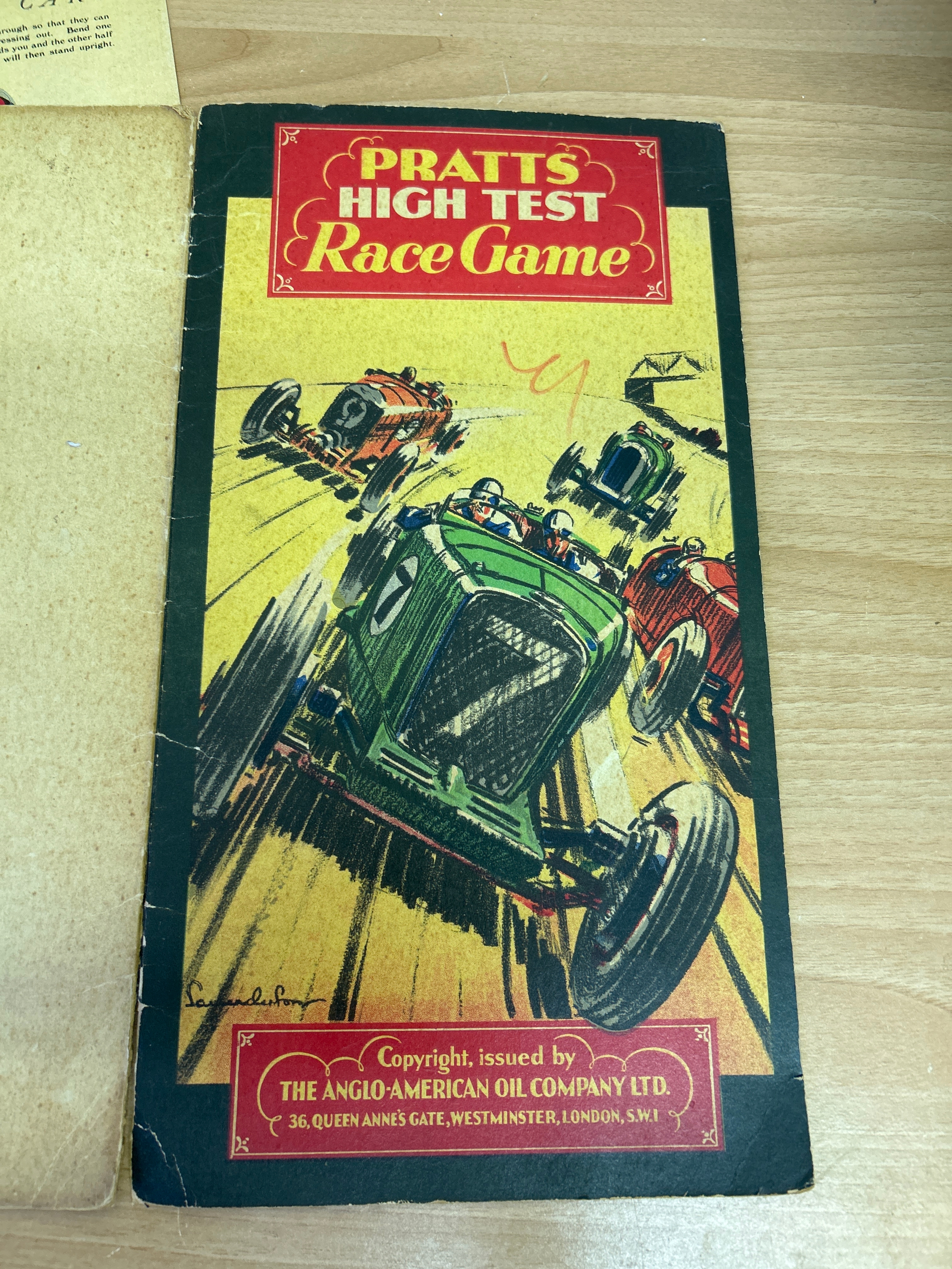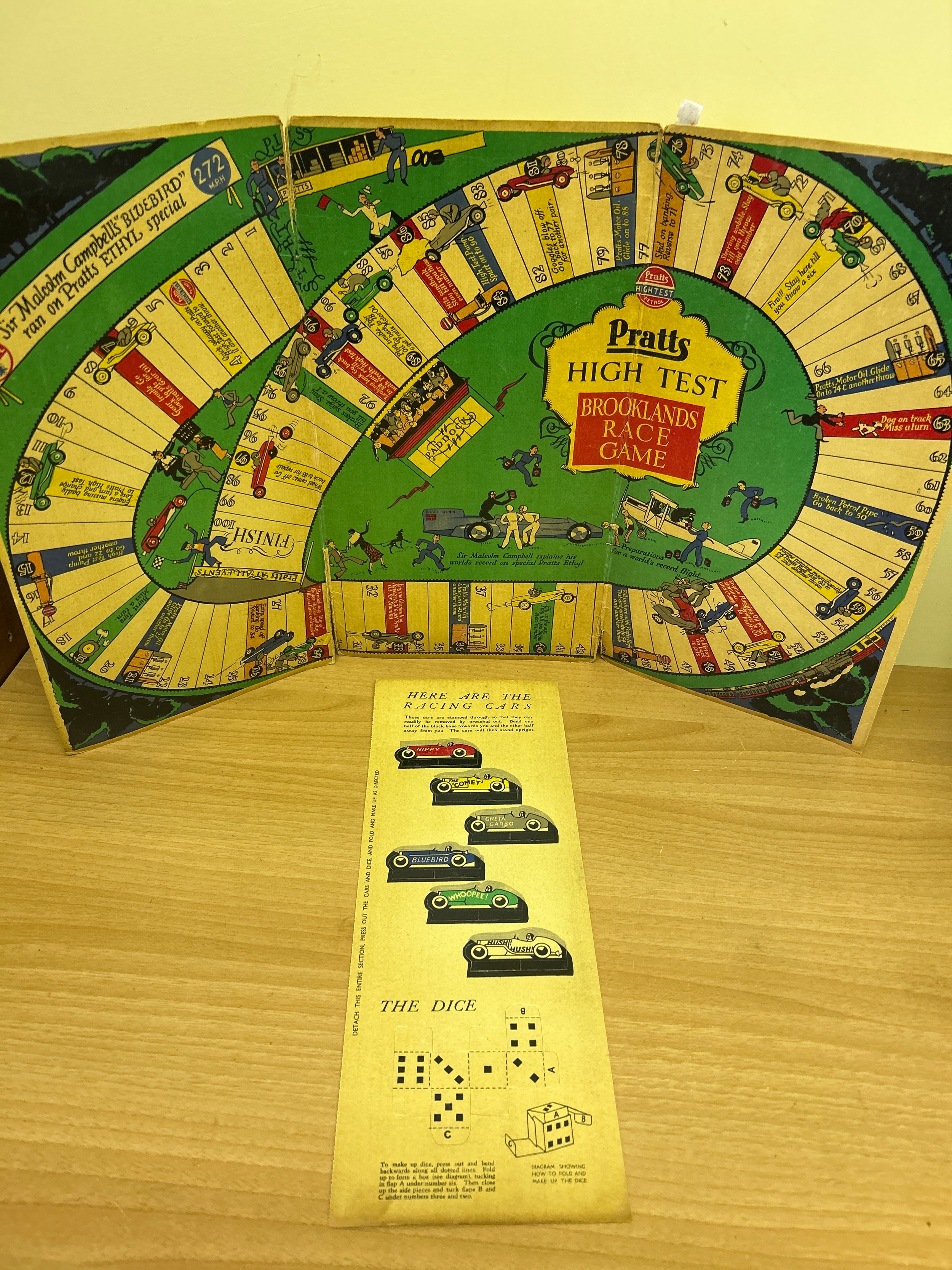1930’s board game “Pratts High Test Brooklands Race Game” by the Anglo American Oil Company. Complete with the press out cardboard card & dice (unused)