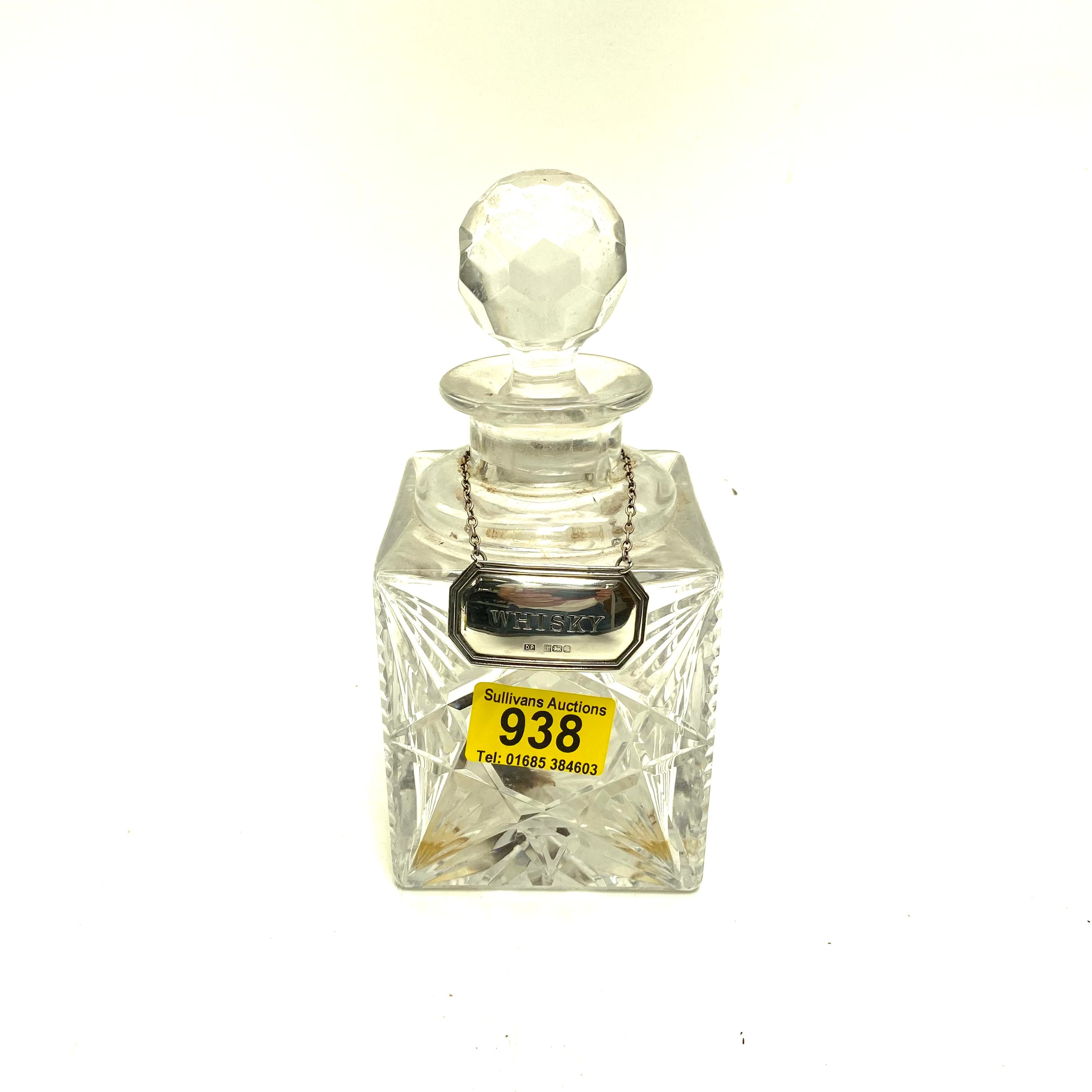 Heavy Lead crystal whiskey decanter and sterling silver label. Hallmarks for Birmingham 1980 by Douglas Pell Silverware, Sawbridgeworth, Hertfordshire.