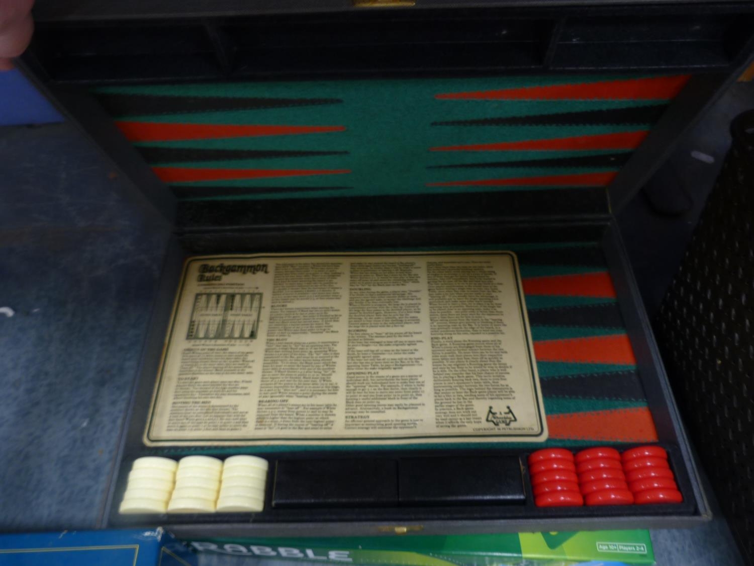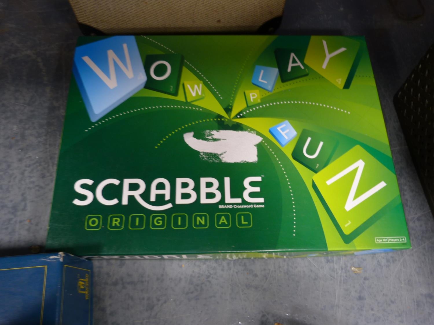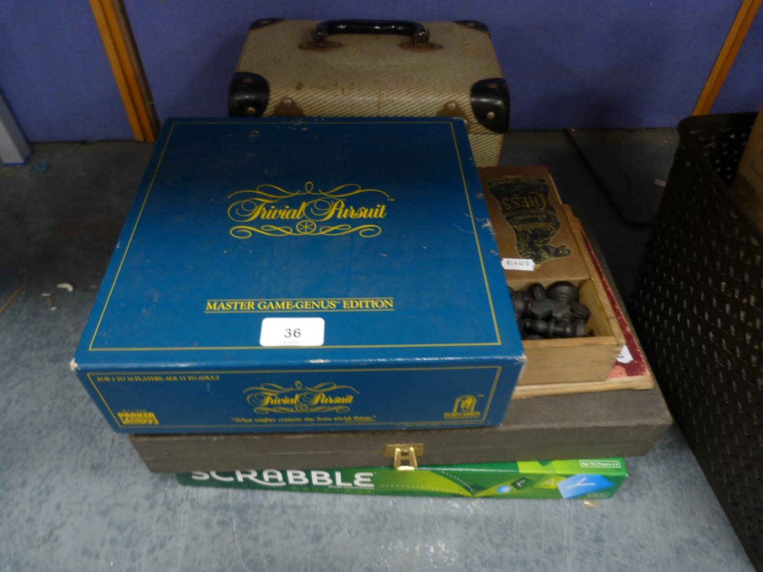 Small collection of boxed games including Trivial Pursuit, Scrabble, chess set and board, backgammon set, toy sewing machine etc.