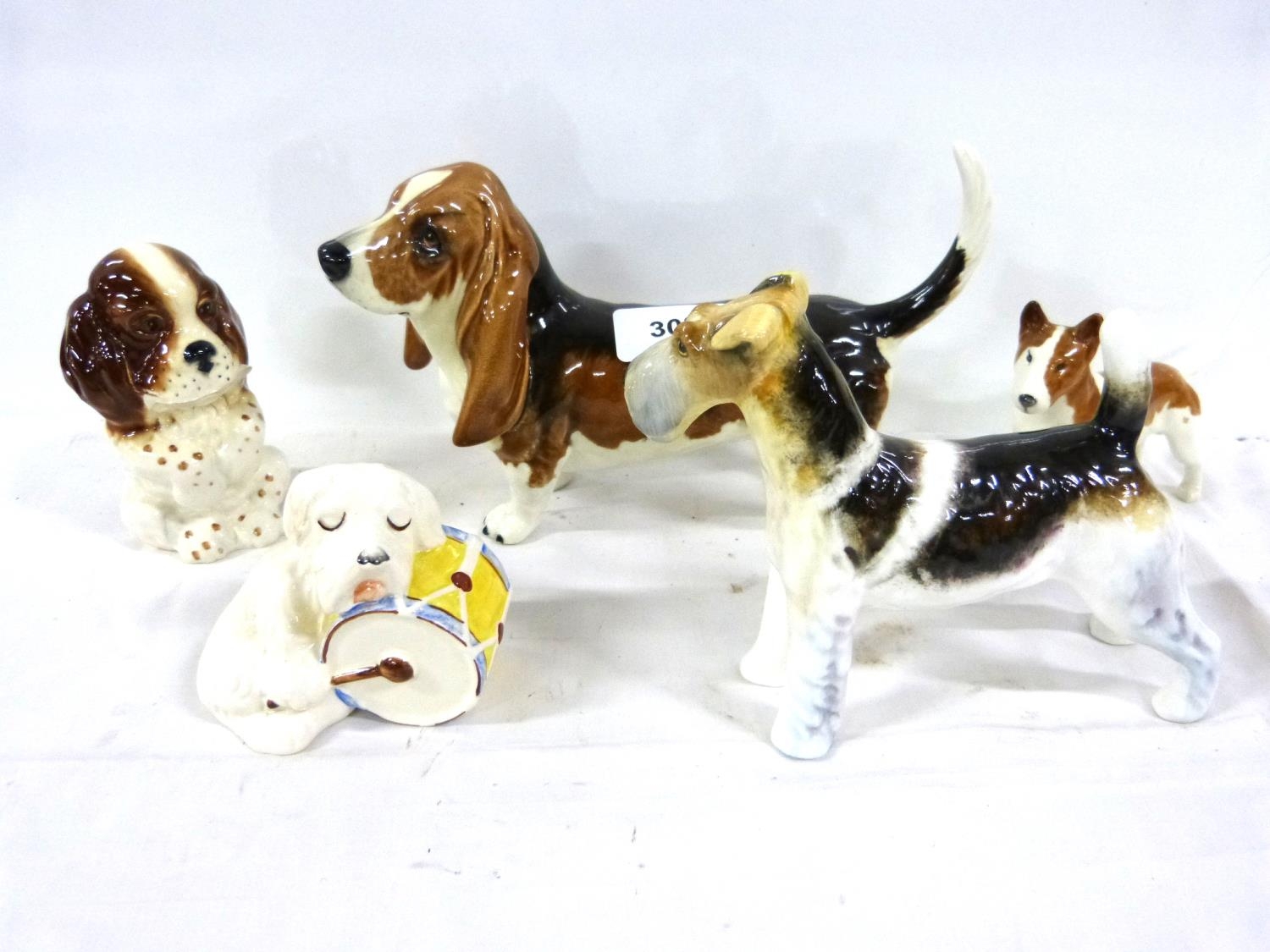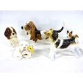 Beswick model of a Basset Hound, another of a Dog Asleep on a drum, two other Bewick dogs and a Adderley dog model (5)