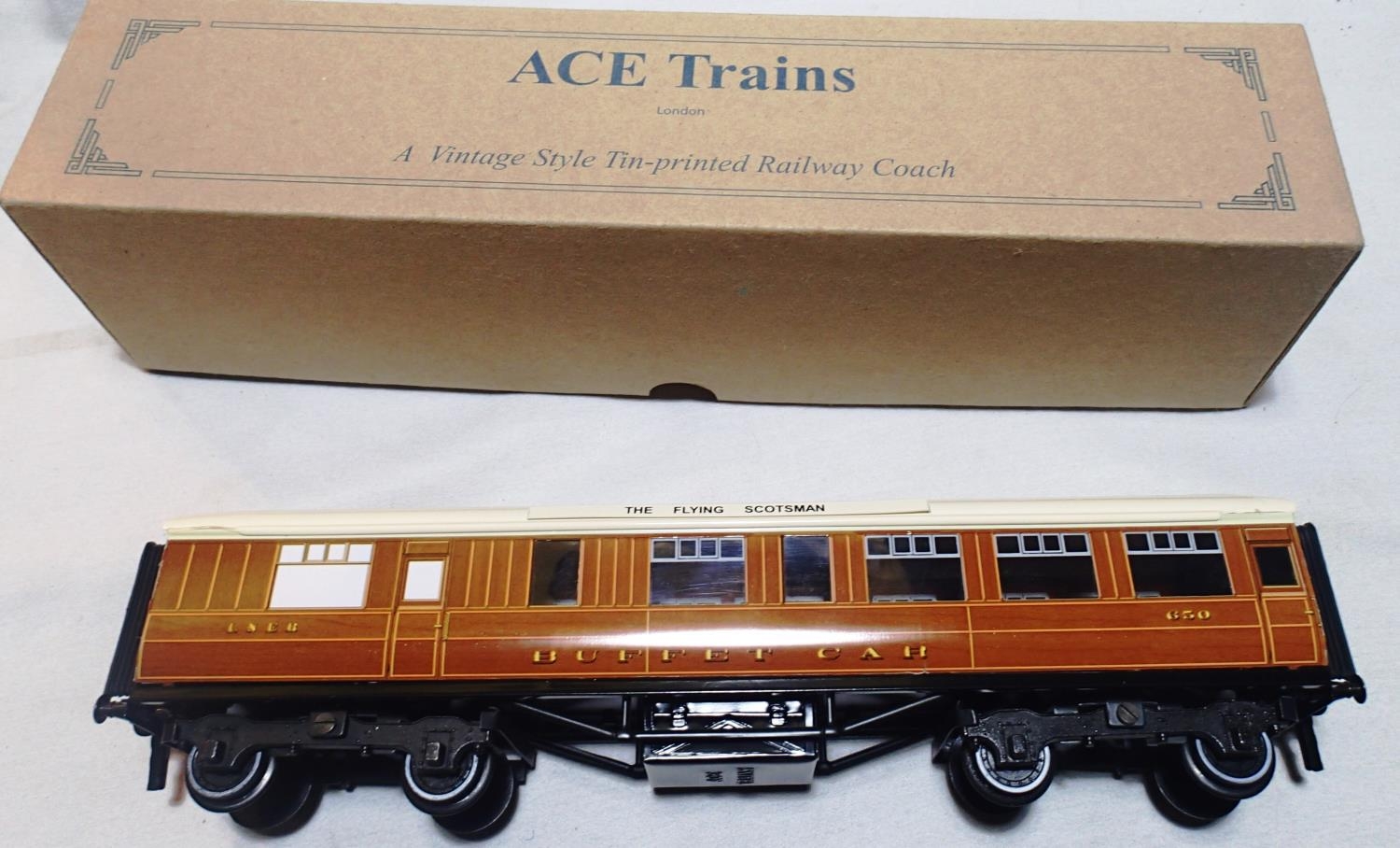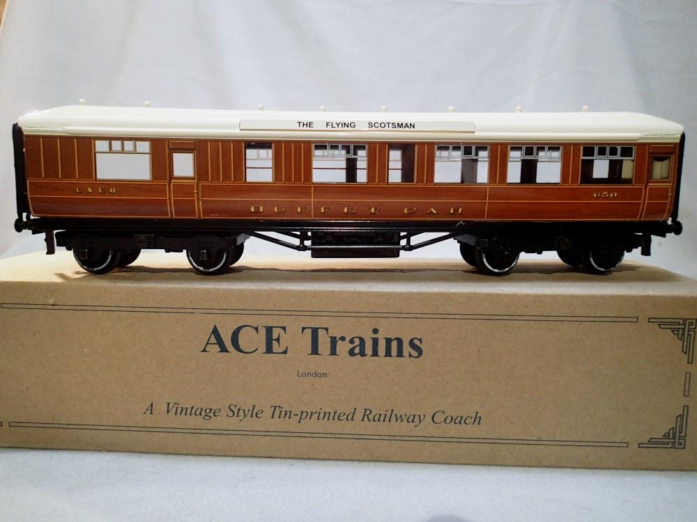 O gauge Ace Trains LNER C/4 teak Buffet Car 650, fitted with The Flying Scotsman roof boards, slight corrosion to buffers, in near mint condition, boxed. P&P Group 1 (£14+VAT for the first lot and £1+VAT for subsequent lots)