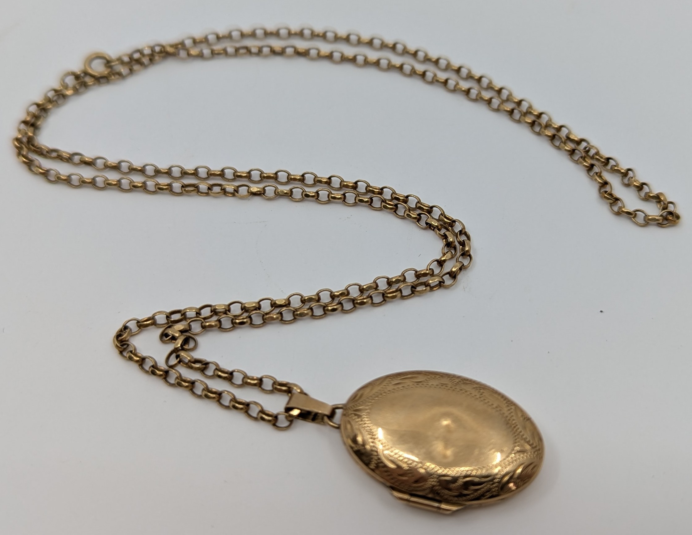 A 9ct gold oval locket pendant necklace with belcher chain, 62cm long, 10.1g
