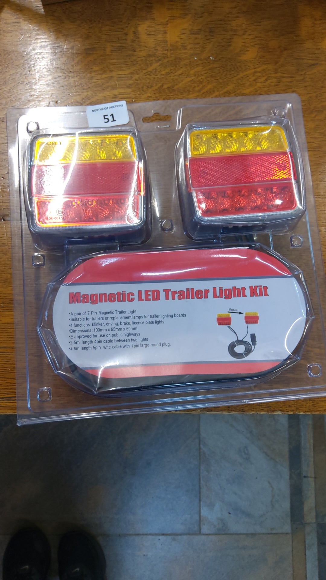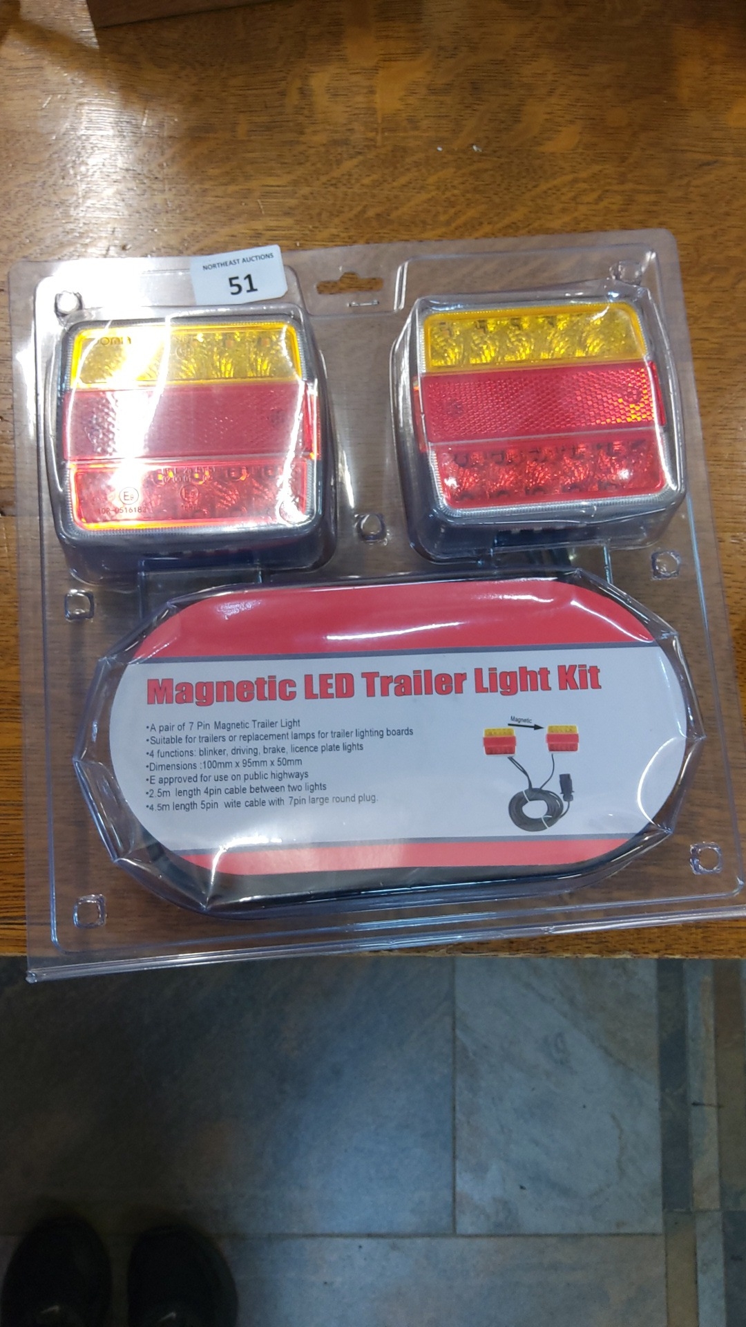 Boxed magnetic LED trailer light kit comprising two 7-pin rear lamps with multi-function indicators, brake, driving and licence-plate lights, linked by cable and round plug.