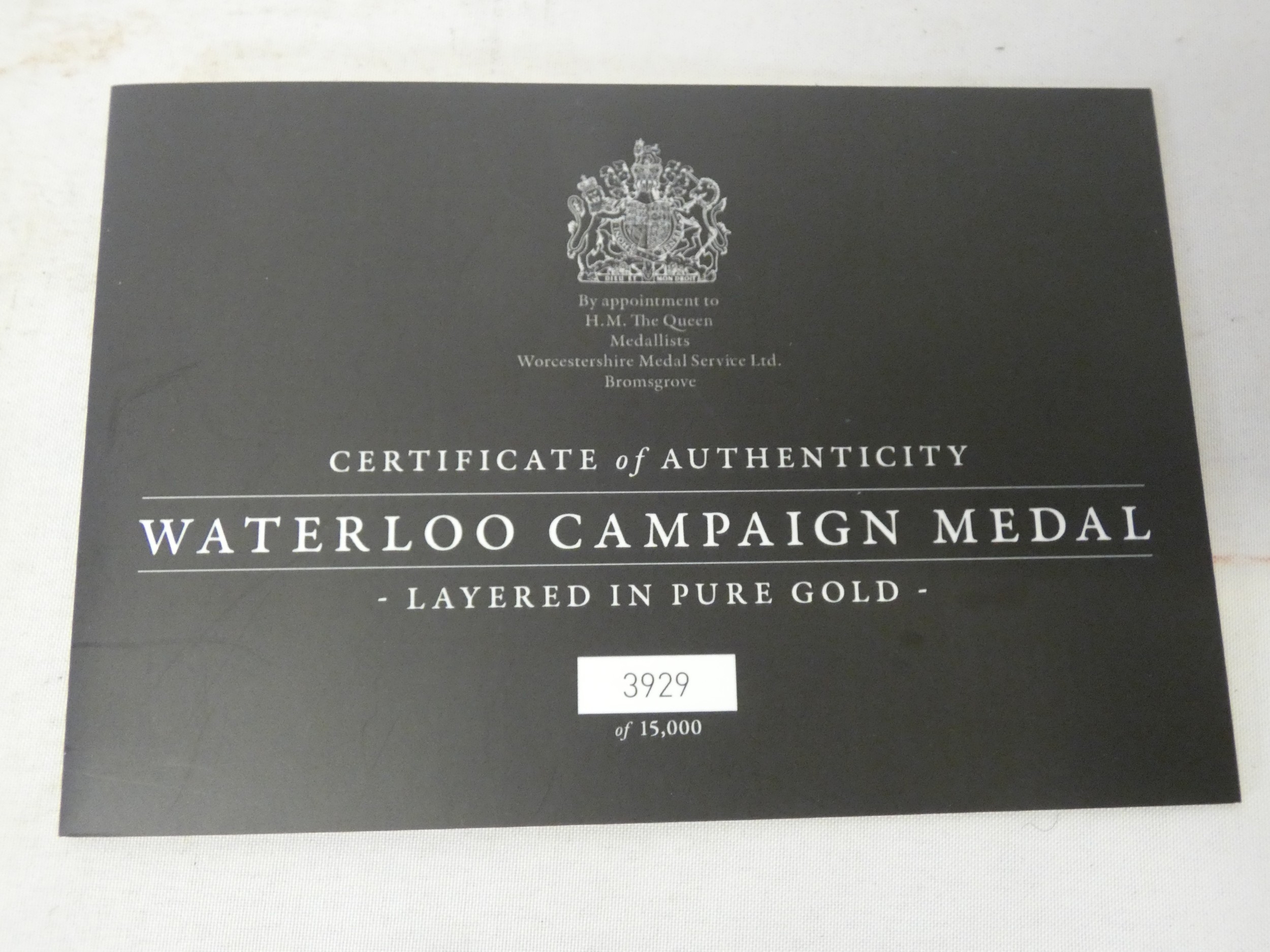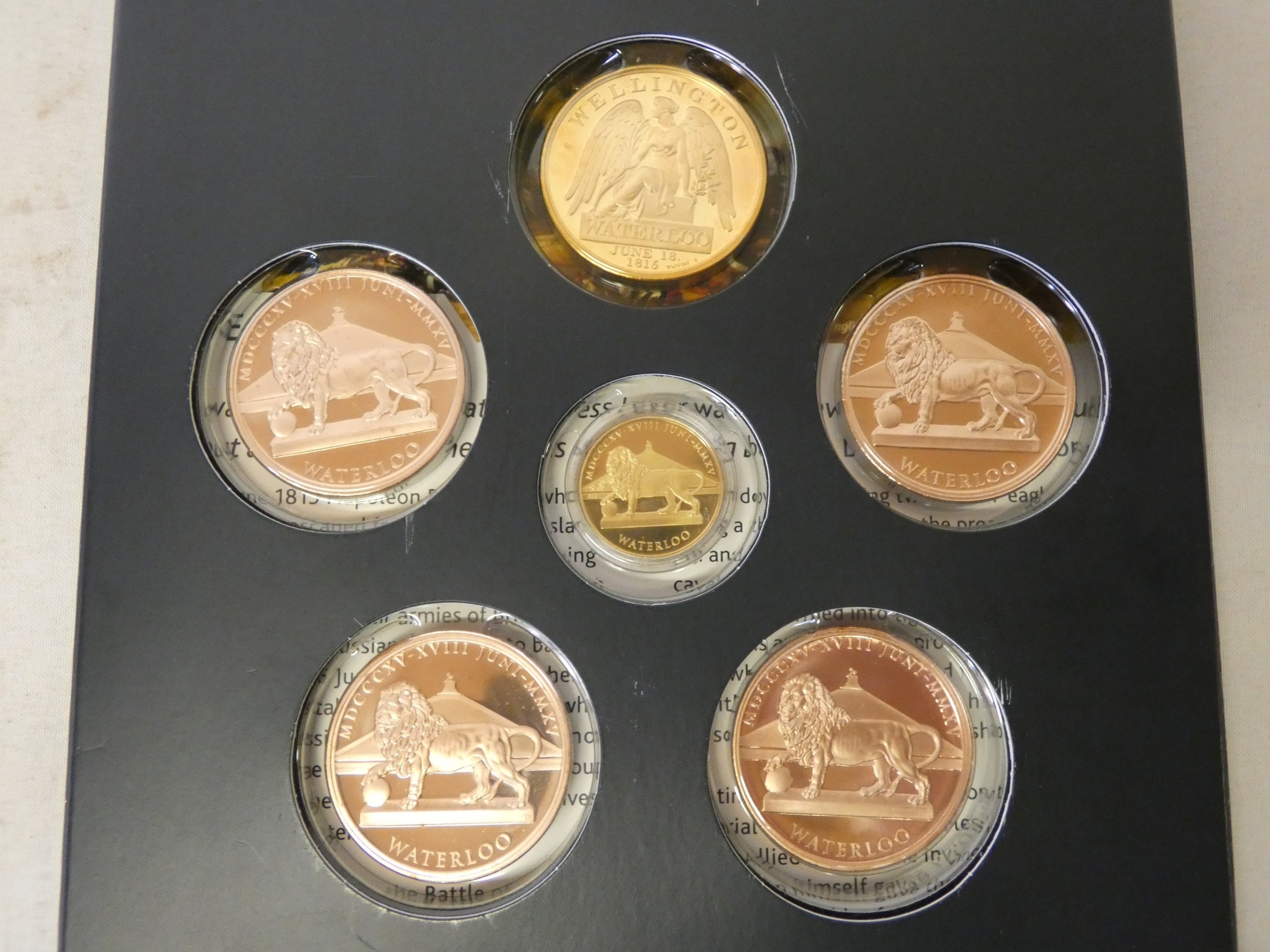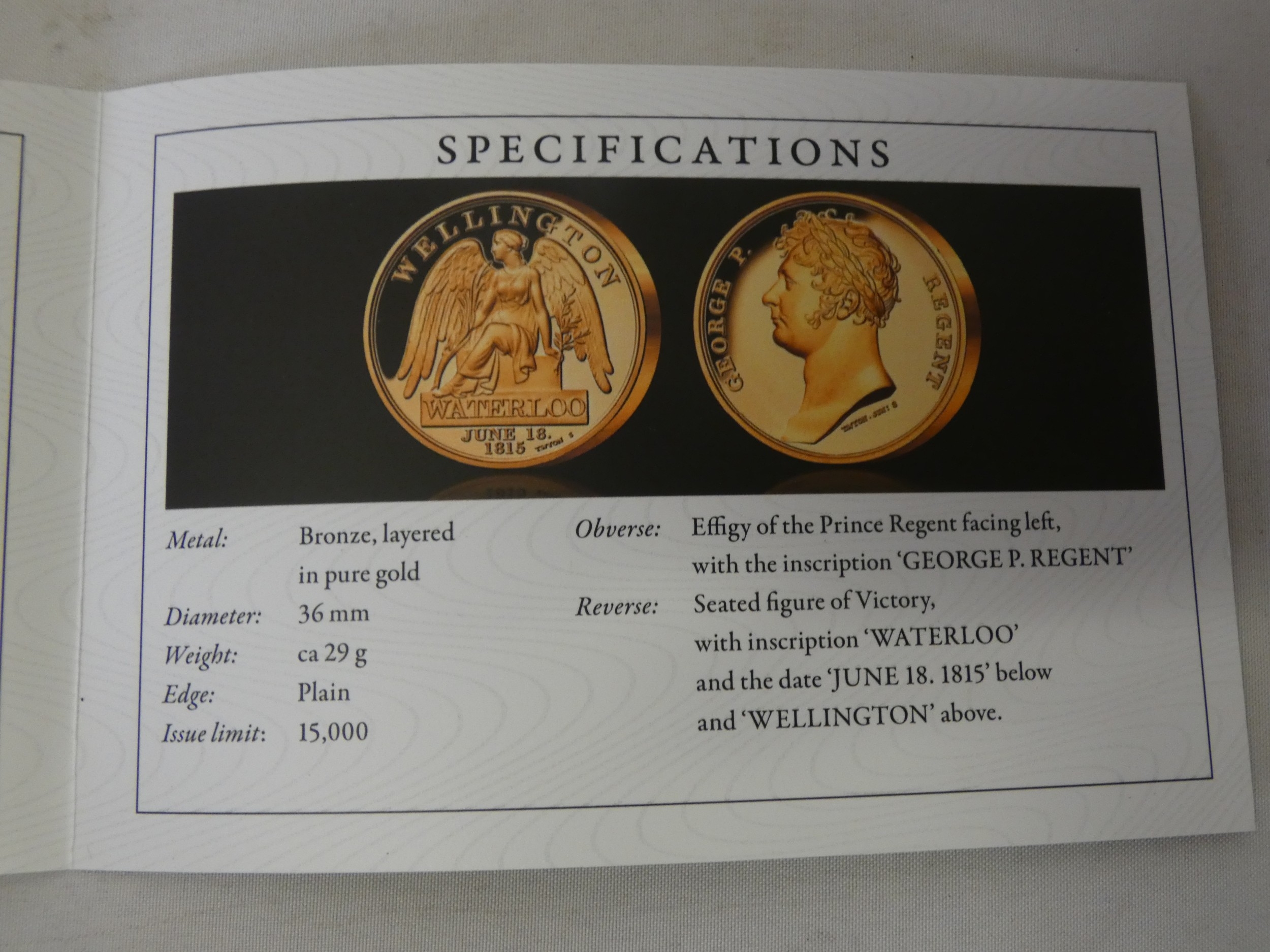 Limited edition six proof coin set, 'The Battle of Waterloo, Waterloo 200, 1815-2015', by the London Mint Office to include the Duke of Wellington 14ct gold coin, 7g, remaining coins bronze, also The Waterloo Campaign medal layered in gold, in fitted sleeve, with plan and certificate of authenticity, no. 3,929 of 15,000, and original receipts by the London Mint Office, dated 2015.