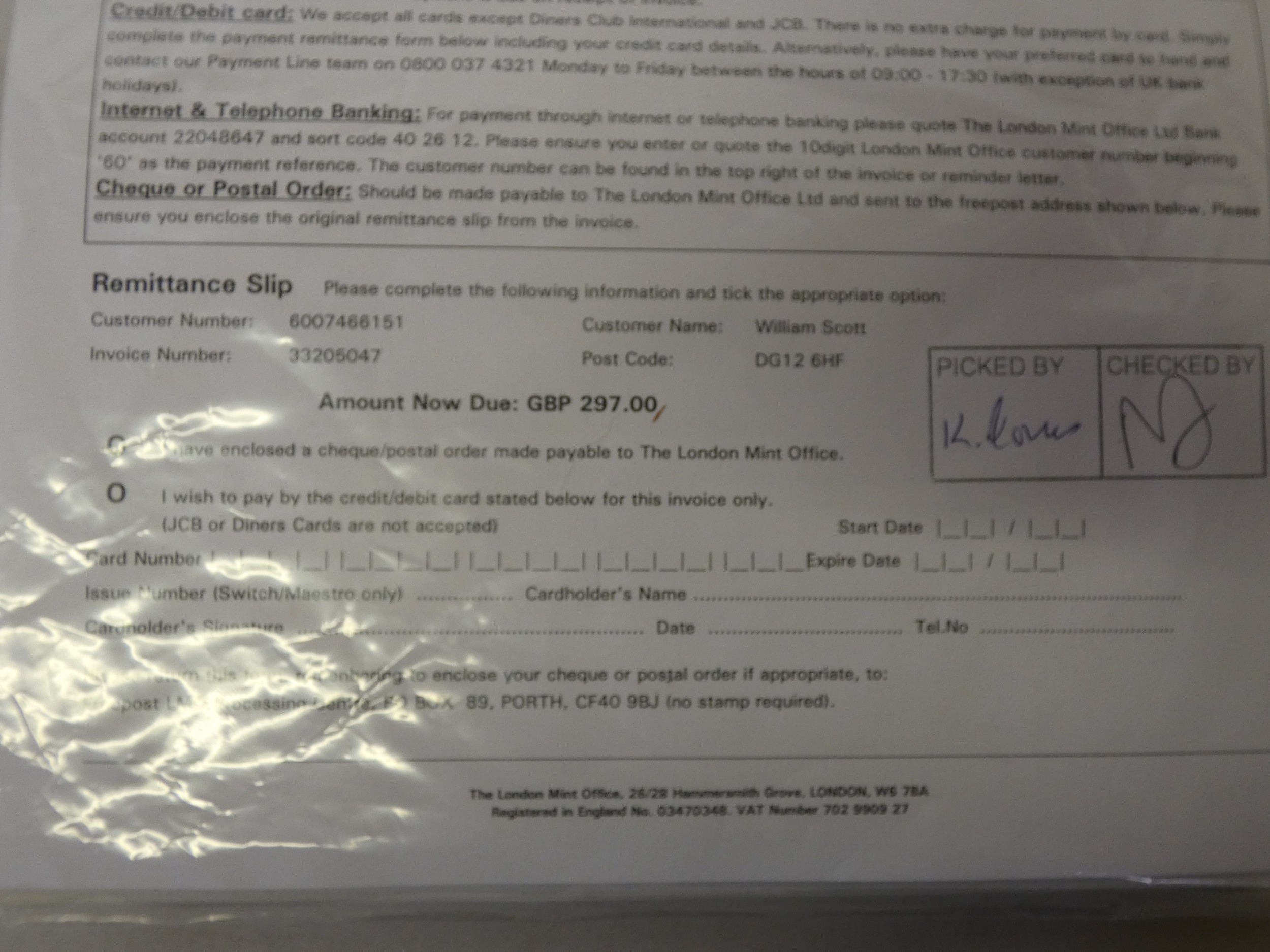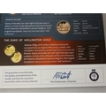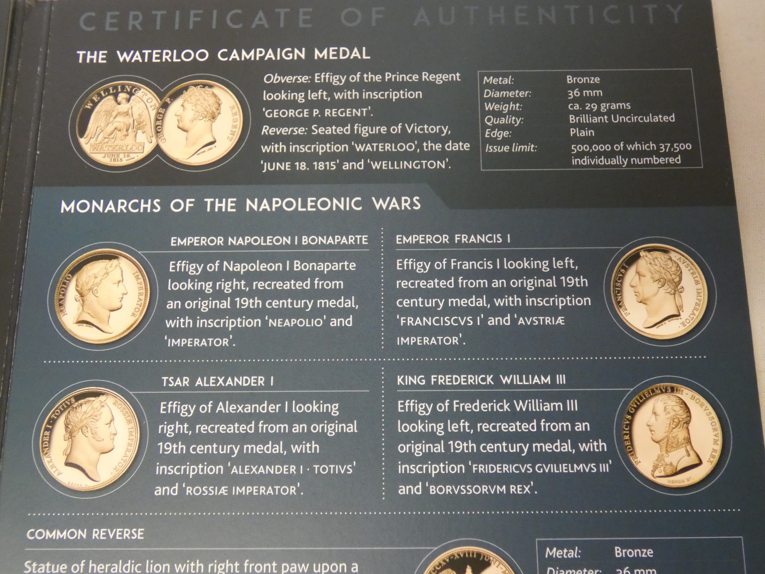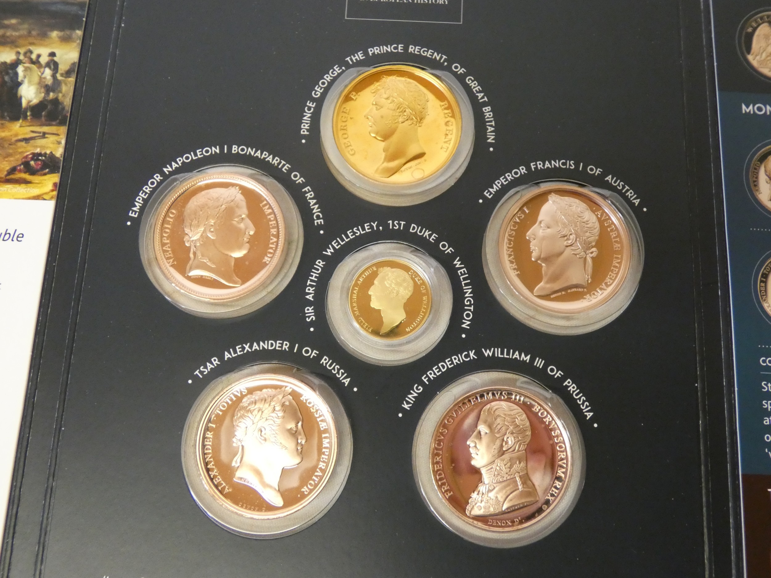 Limited edition six proof coin set, 'The Battle of Waterloo, Waterloo 200, 1815-2015', by the London Mint Office to include the Duke of Wellington 14ct gold coin, 7g, remaining coins bronze, also The Waterloo Campaign medal layered in gold, in fitted sleeve, with plan and certificate of authenticity, no. 3,929 of 15,000, and original receipts by the London Mint Office, dated 2015.