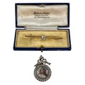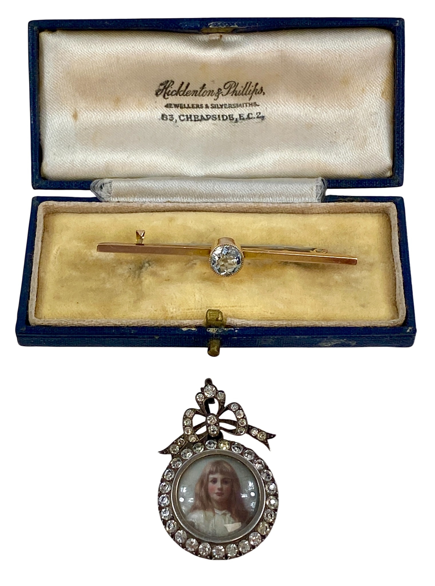 A 9ct Gold Brooch in vintage Jeweller's BoxWeight 3.45 grams and a silver Locket.