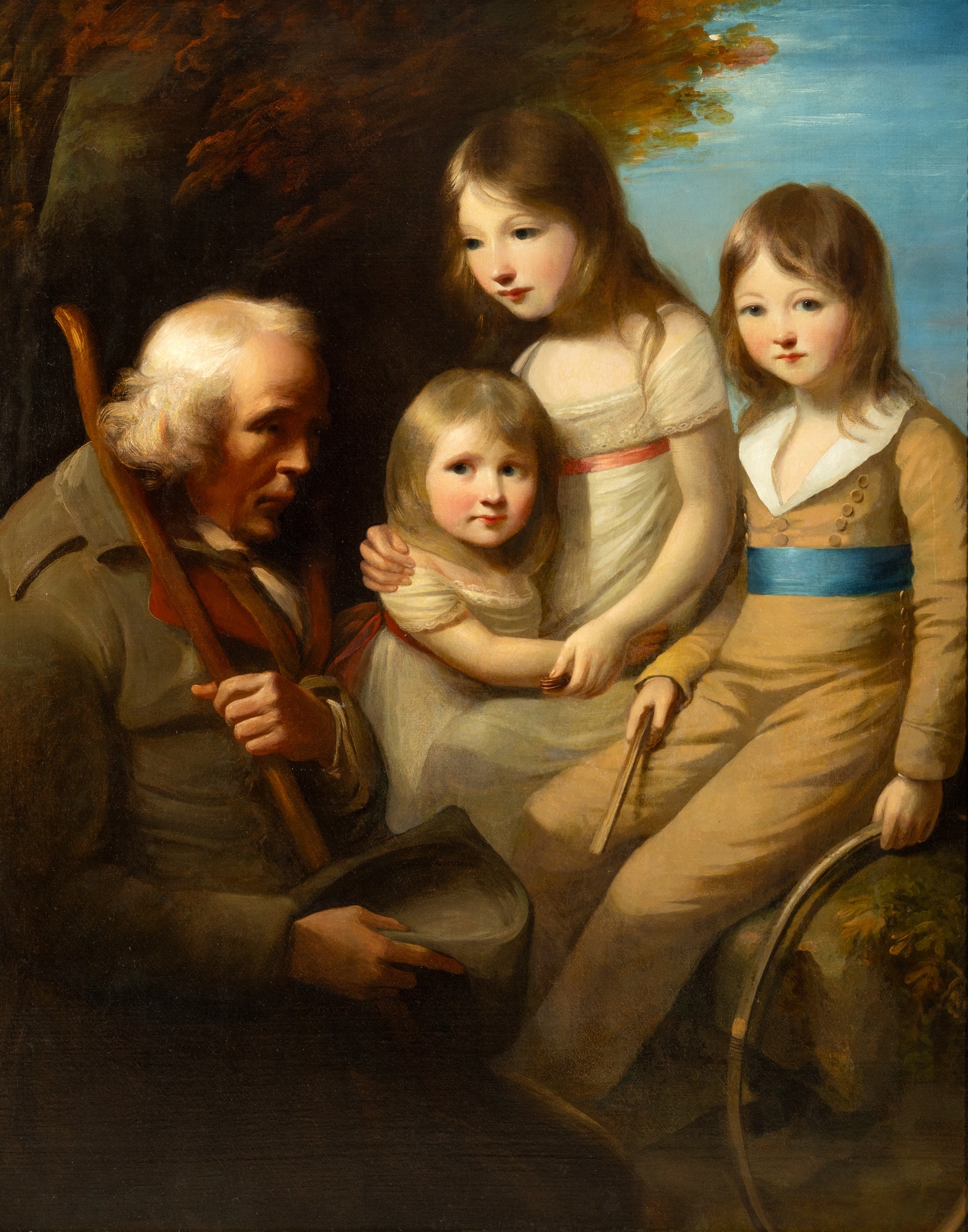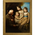 ATTRIBUTED TO REV MATTHEW WILLIAM PETERS R.A. (1741 - 1814) Almsgiving Oil on canvas, 127 x 101.5cm With label verso with children's names inscribed as 'John Threlford, Anna Maria and Eliza, Children of Threlf...of Chorley'