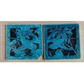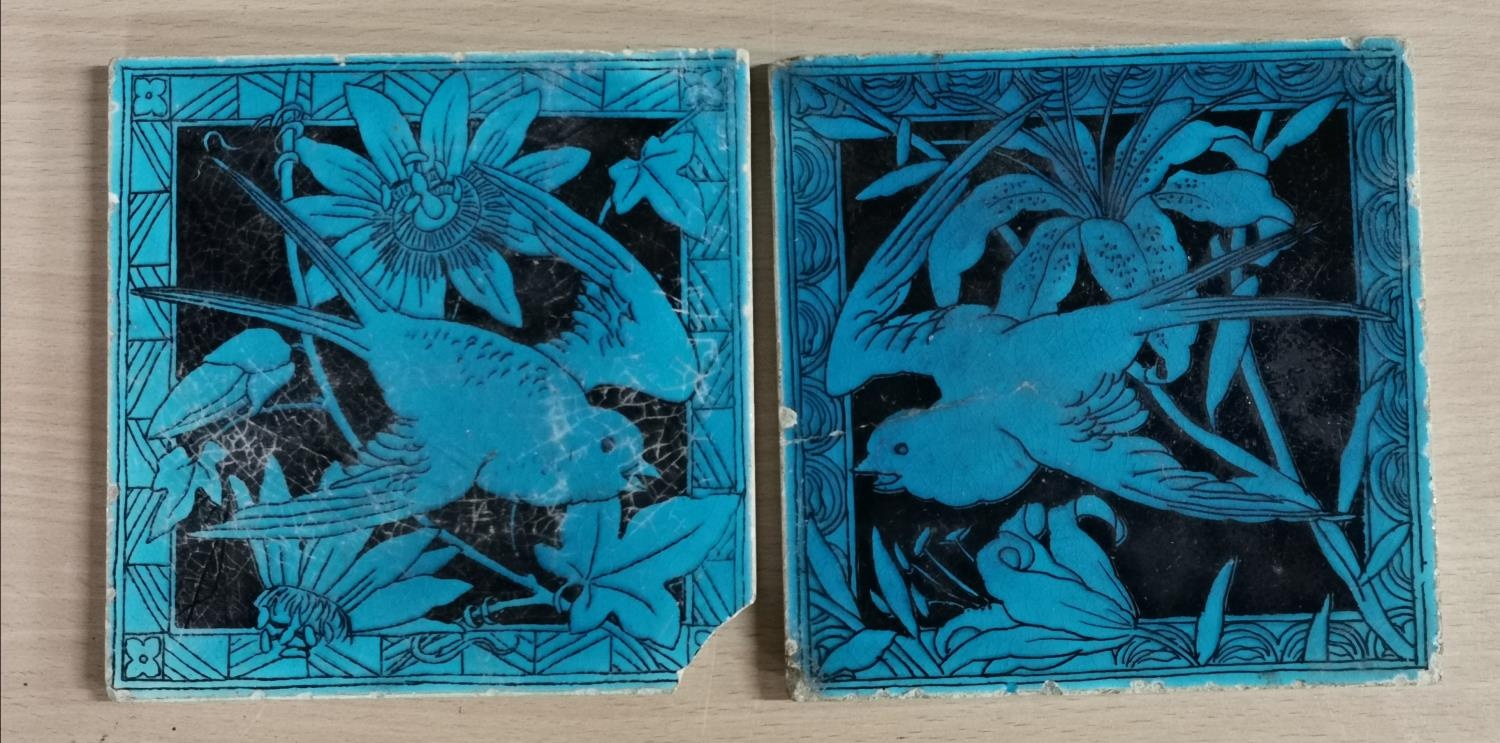 Pair of old distressed 15 x 15 cm Minton picture tiles