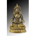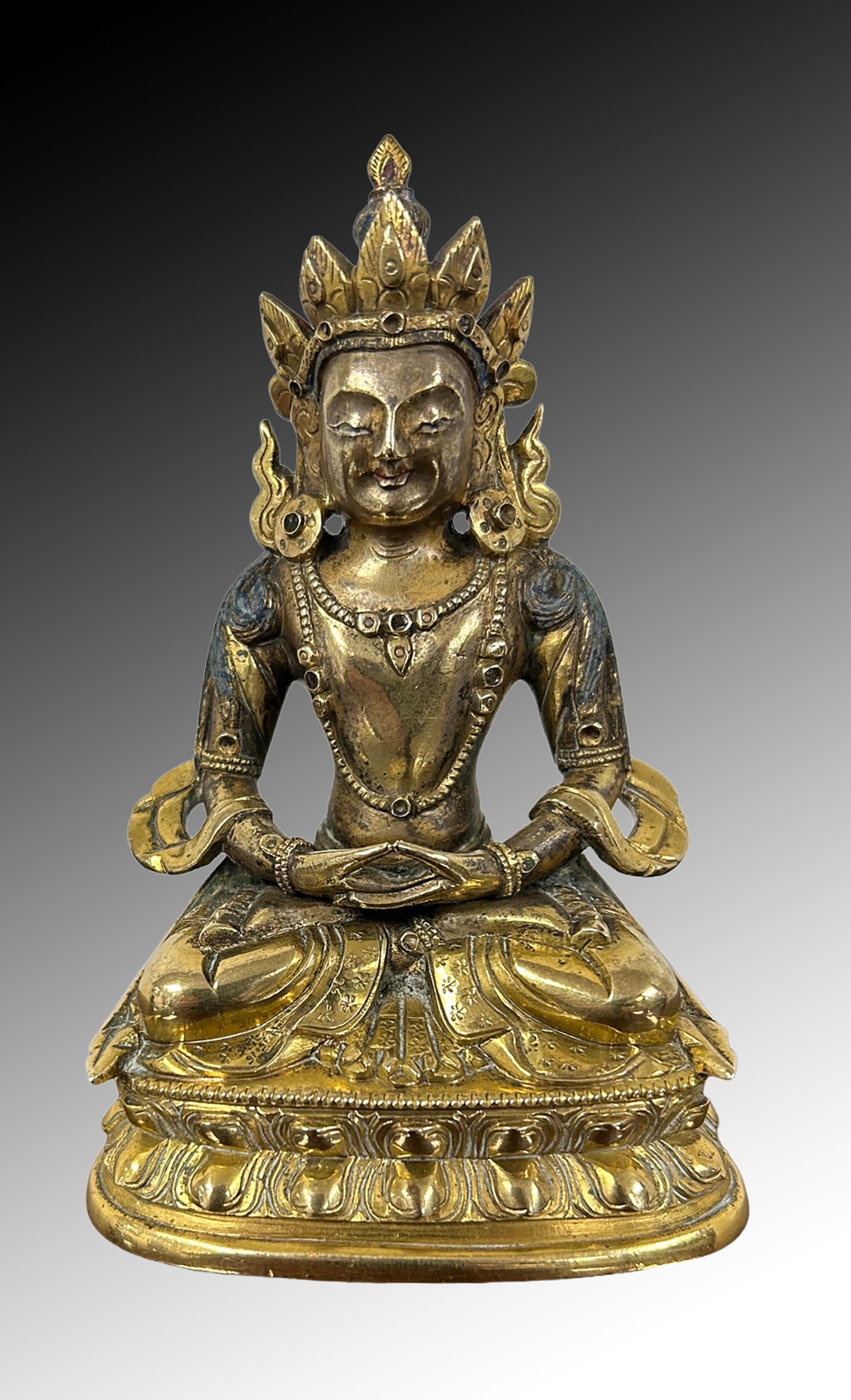 China, possibly late Ming / early Qing dynasty. The Buddha seated in dhy?na (meditation) posture, the serene expression with elongated ears, the hair arranged in tight curls, wearing flowing robes falling in rhythmic folds across the body. The surface gilt or gilt-bronze, with traces of blue-painted or enamelled detail, seated on a lotus base.