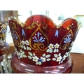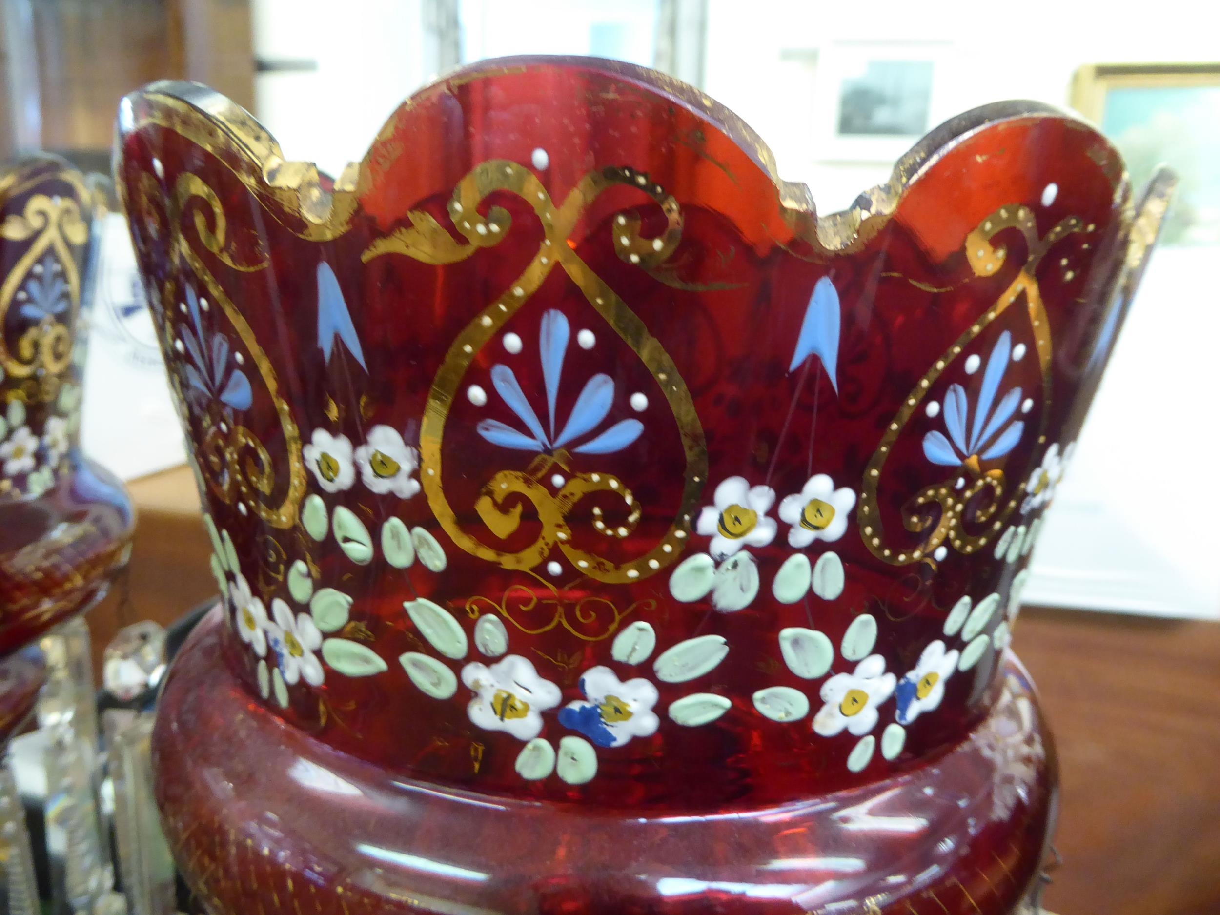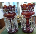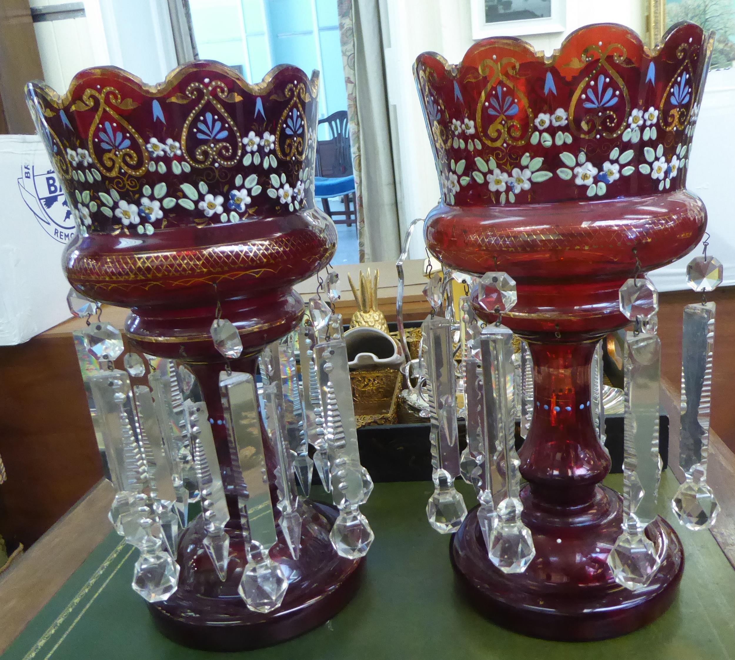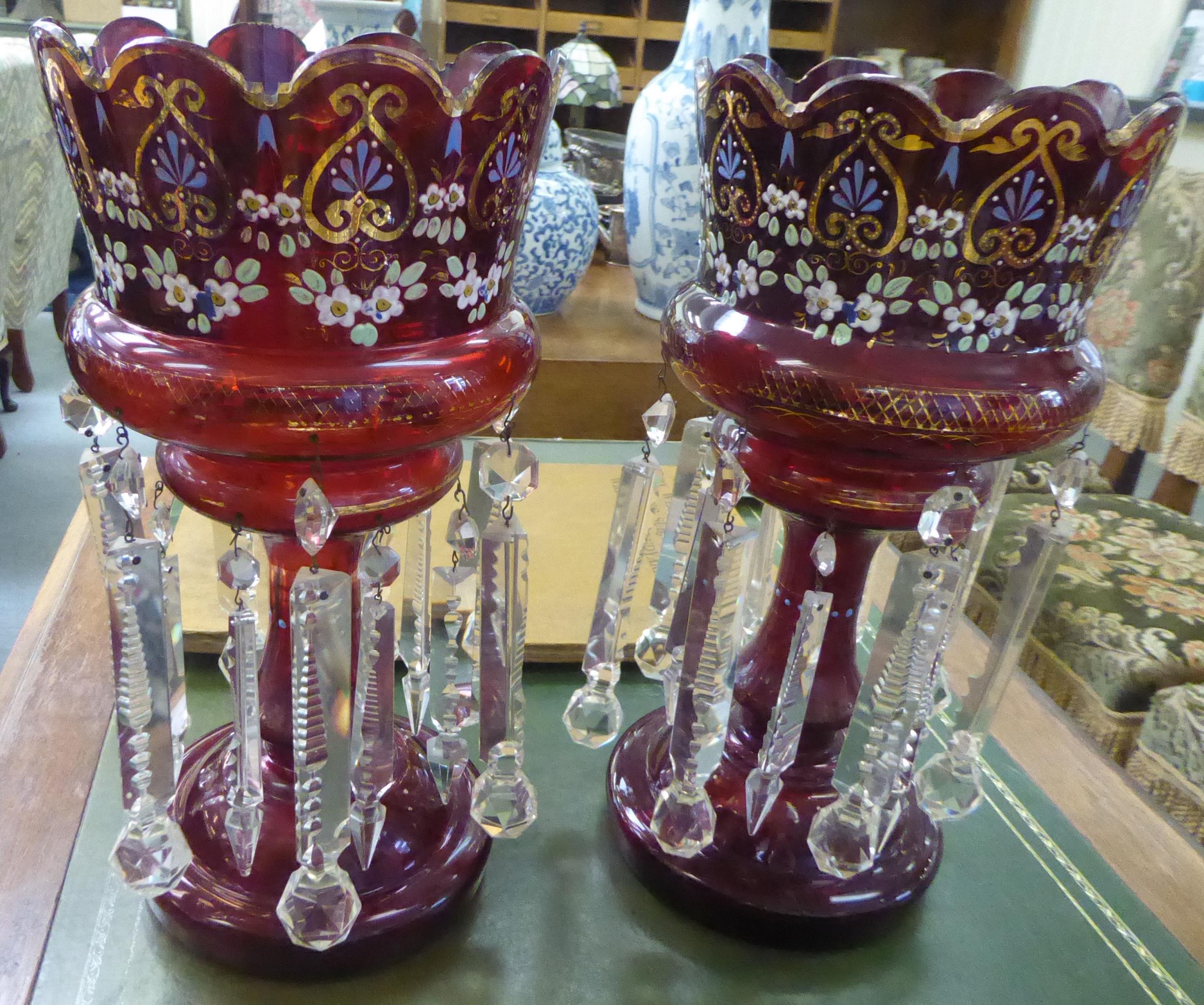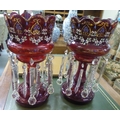 A pair of late Victorian overpainted cranberry coloured glass lustre vases with clear crystal pendants 15"h