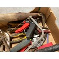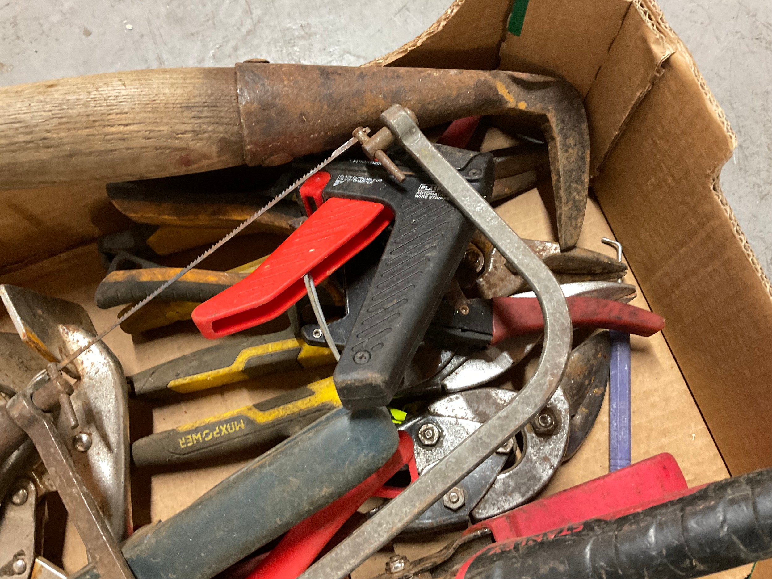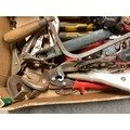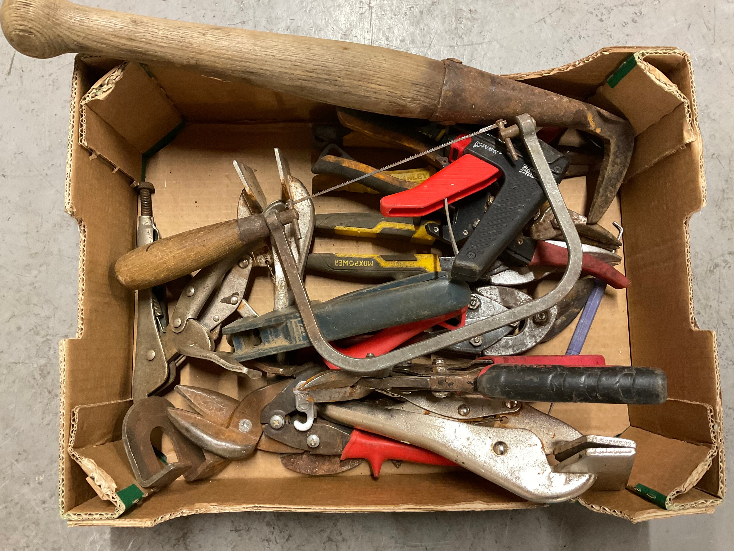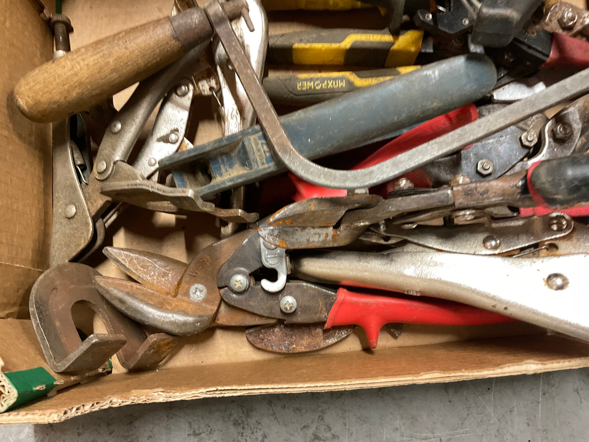 BOX OF VINTAGE HAND TOOLS TO INCLUDE METAL SNIPS ETC