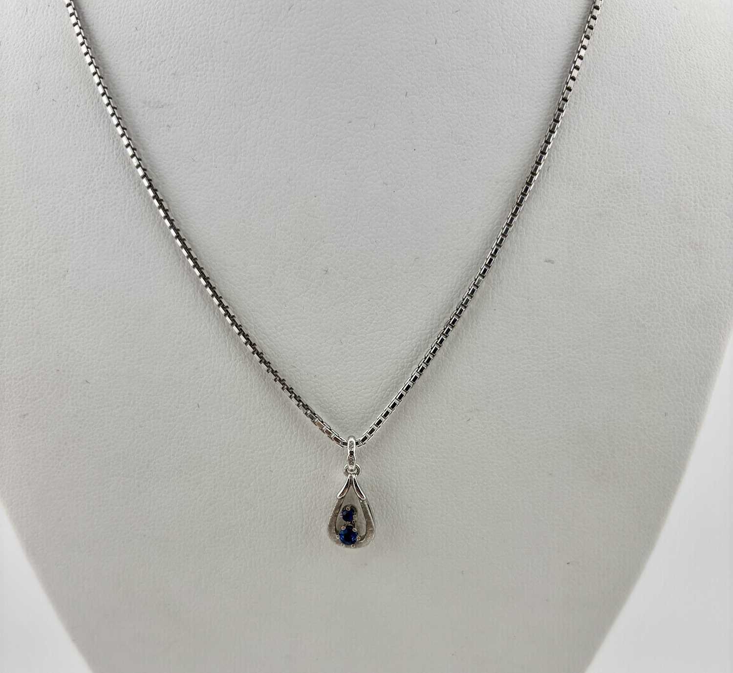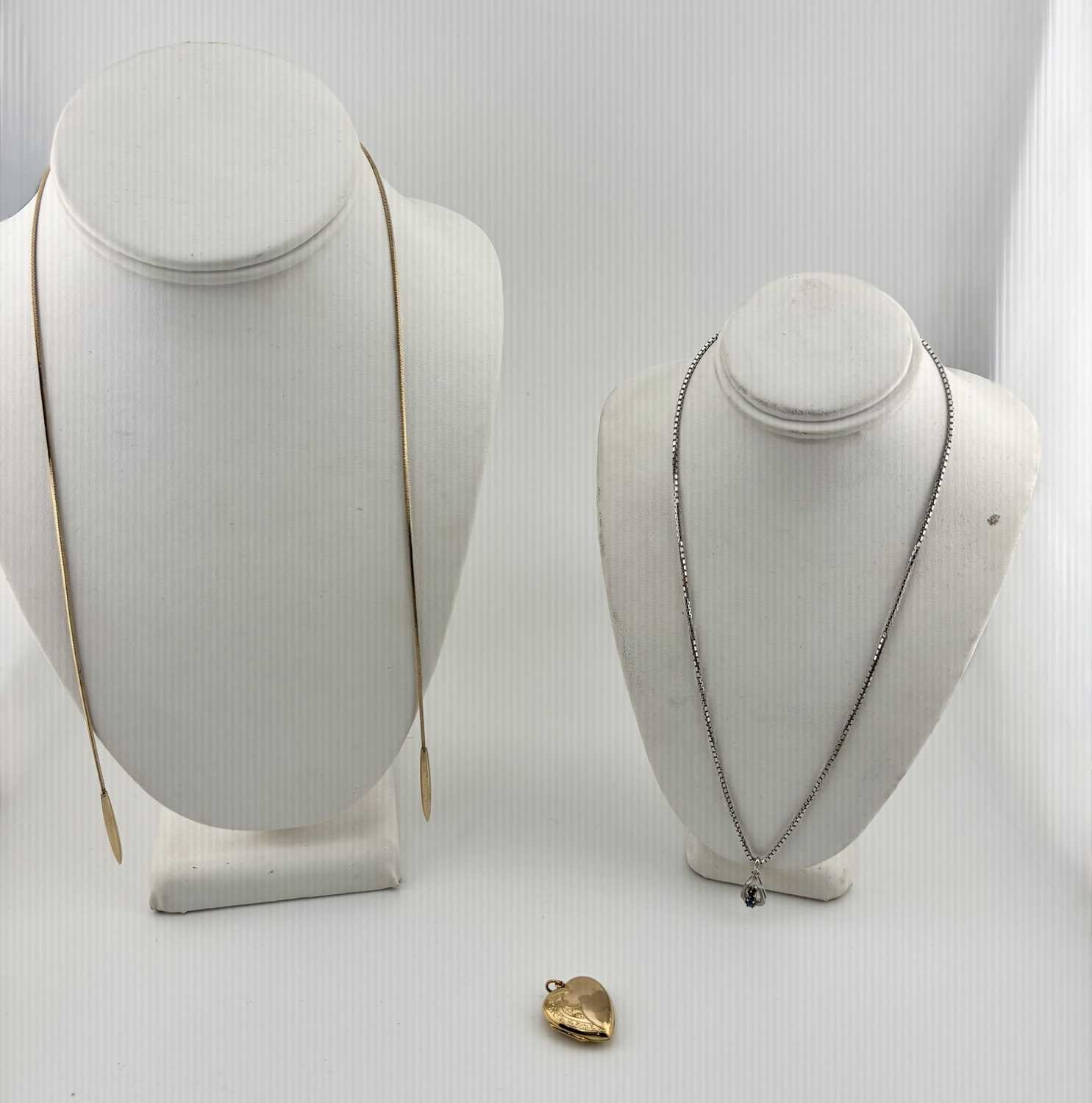 Three items of jewellery, to include a 9ct gold back and front locket pendant, 3.9g, a yellow metal box link chain, together with a white metal pendant necklace set with sapphires, stamped 800, total weight 16.1g.