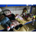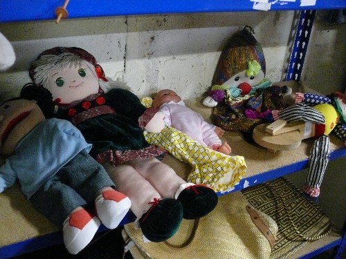 SHELF OF RAGDOLL, CLOWN, PUPPETS, DOLLS.