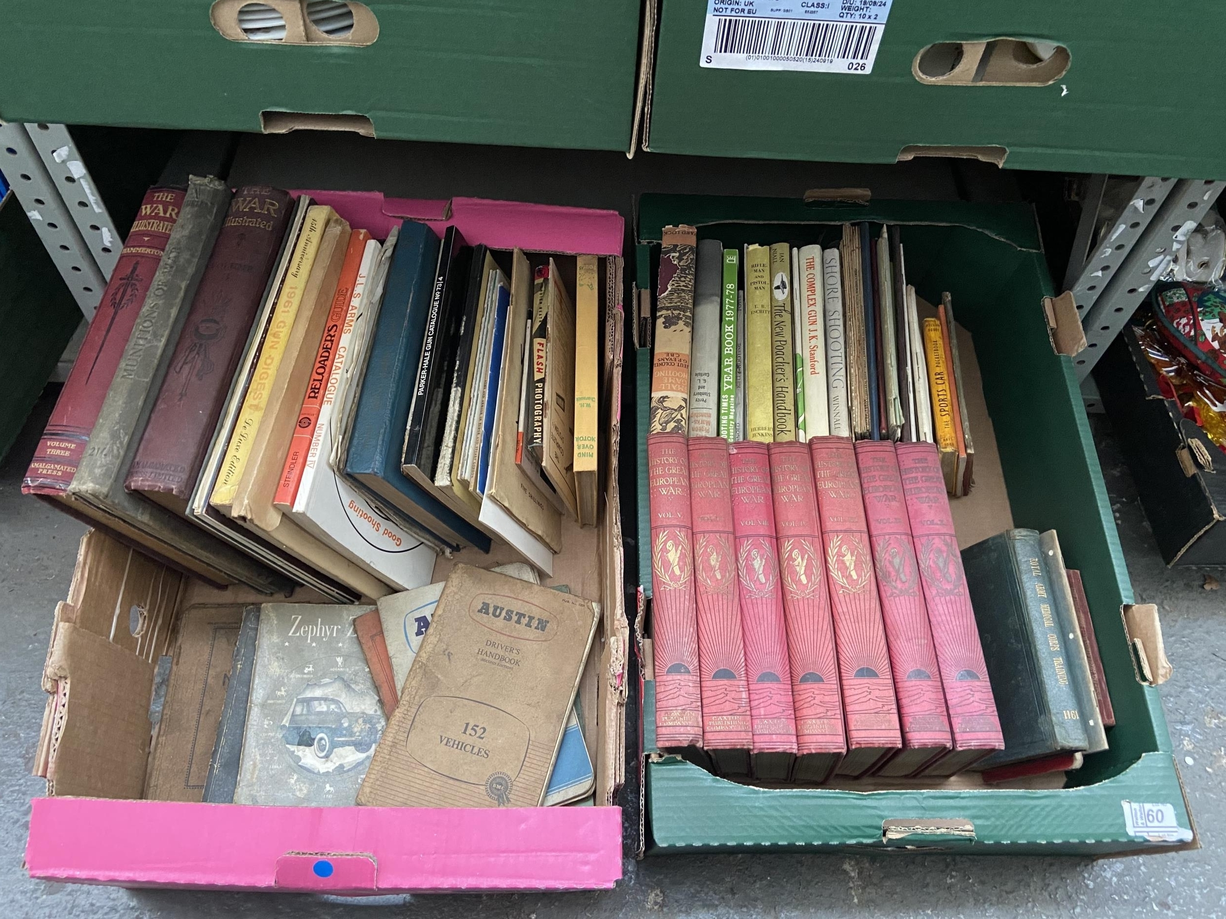 2 Boxes containing vintage books and an Austin Driver's Handbook etc