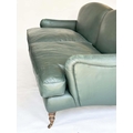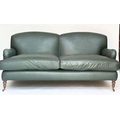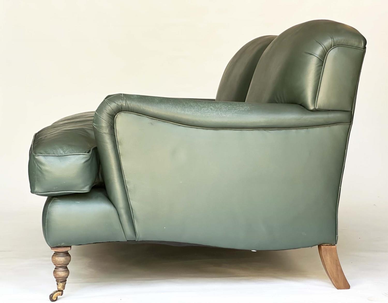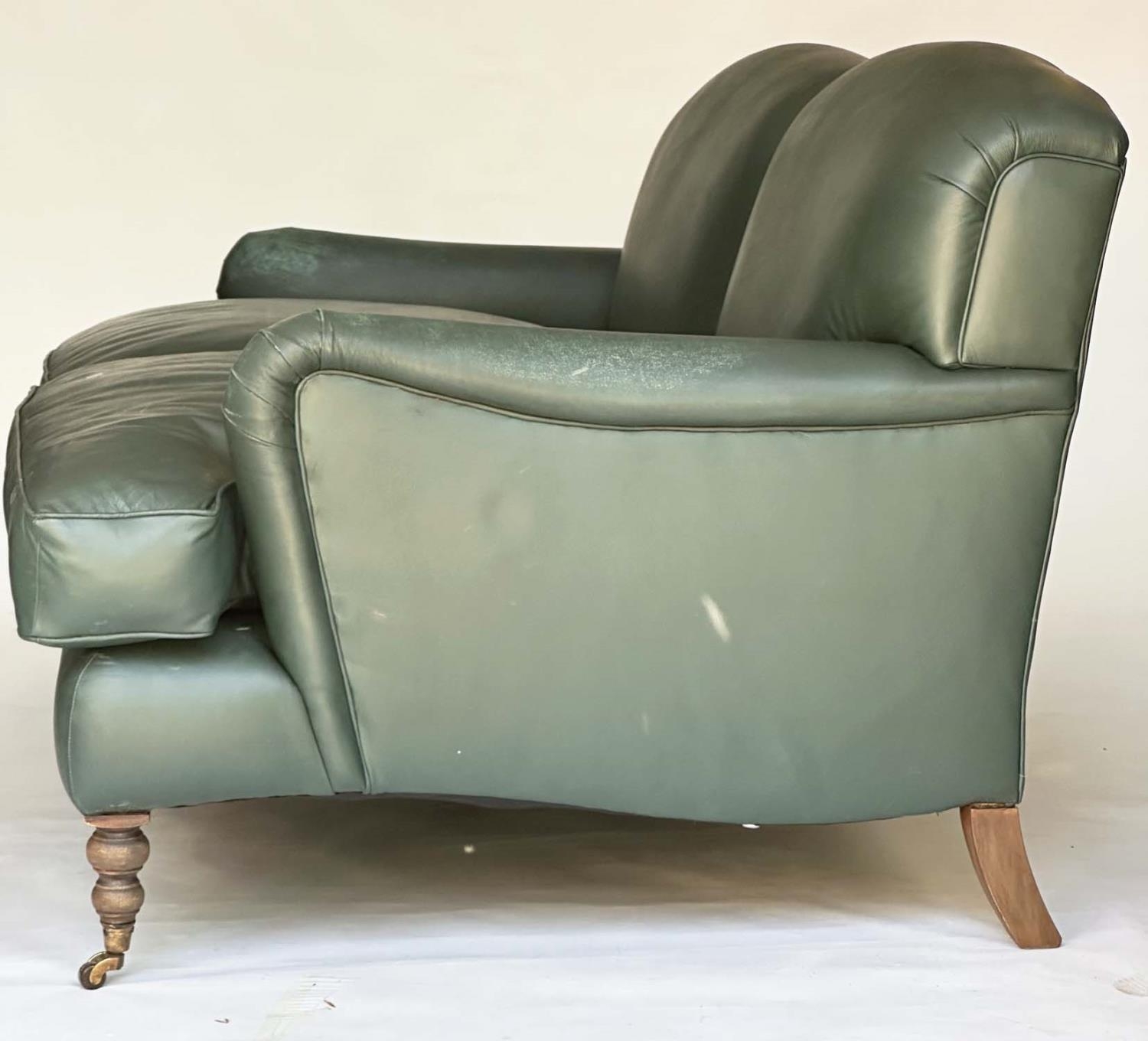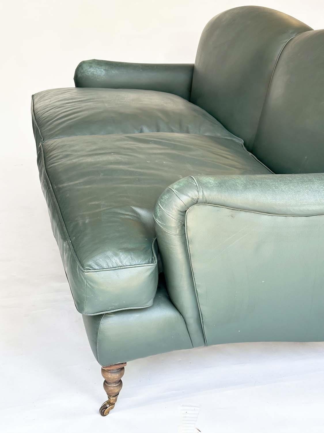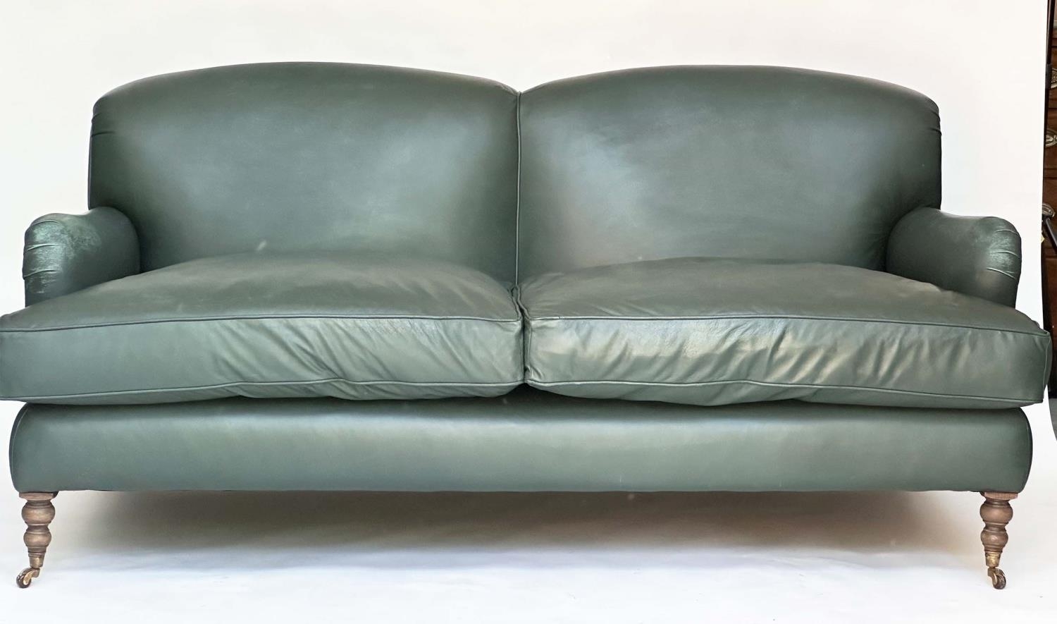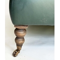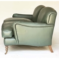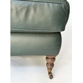 HOWARD STYLE SOFA, natural soft green leather upholstered with turned supports, 95cm H x 210cm W x 115cm D.