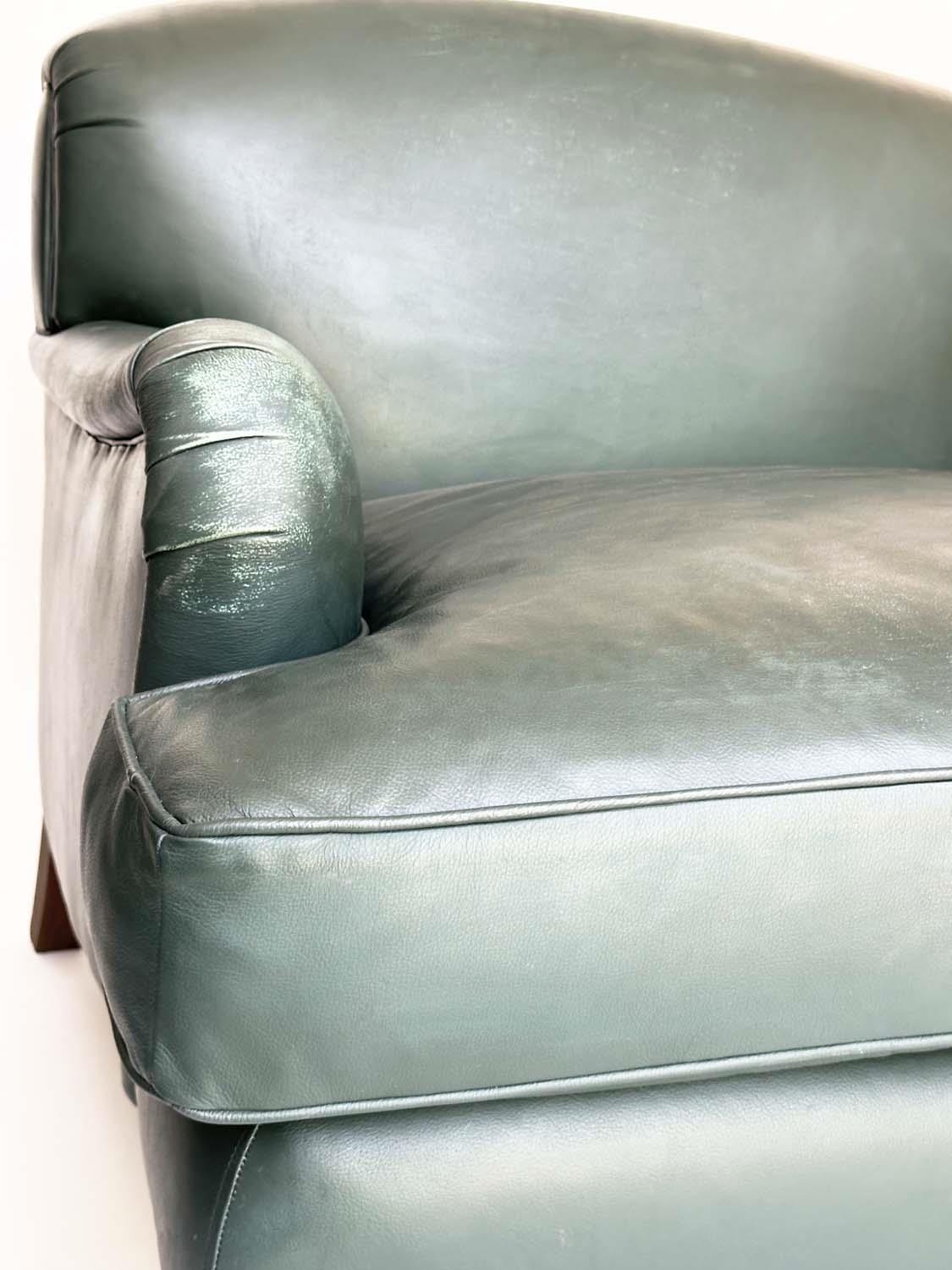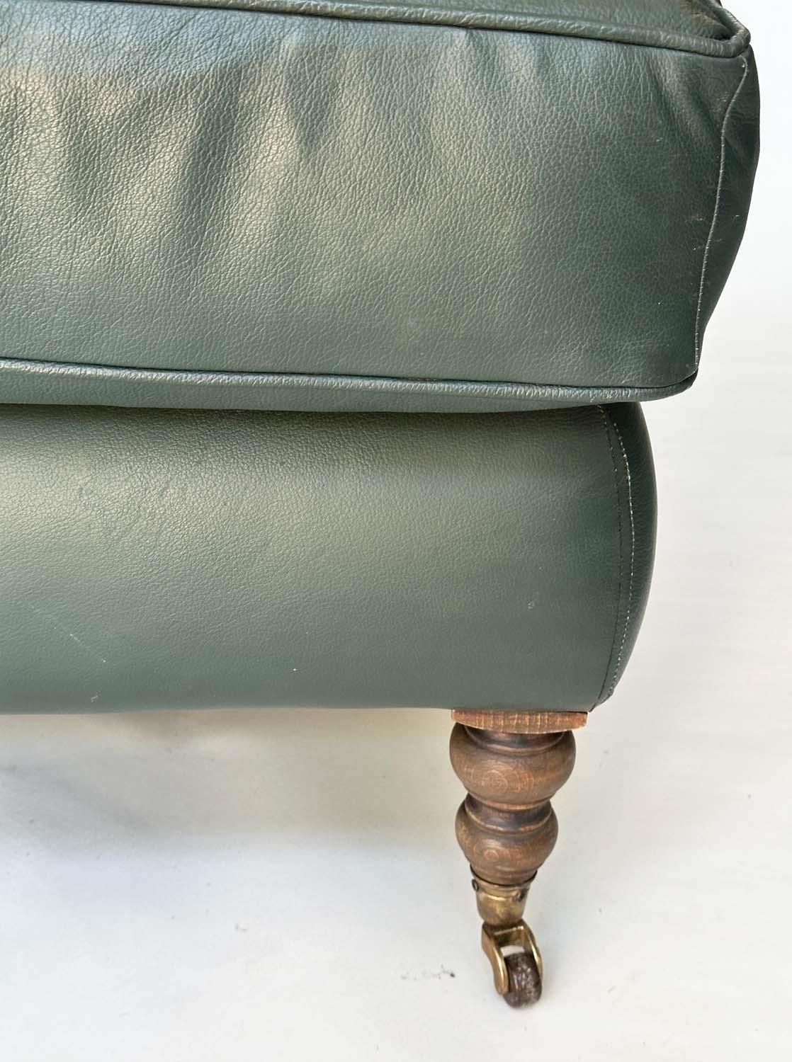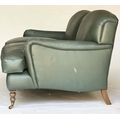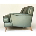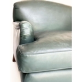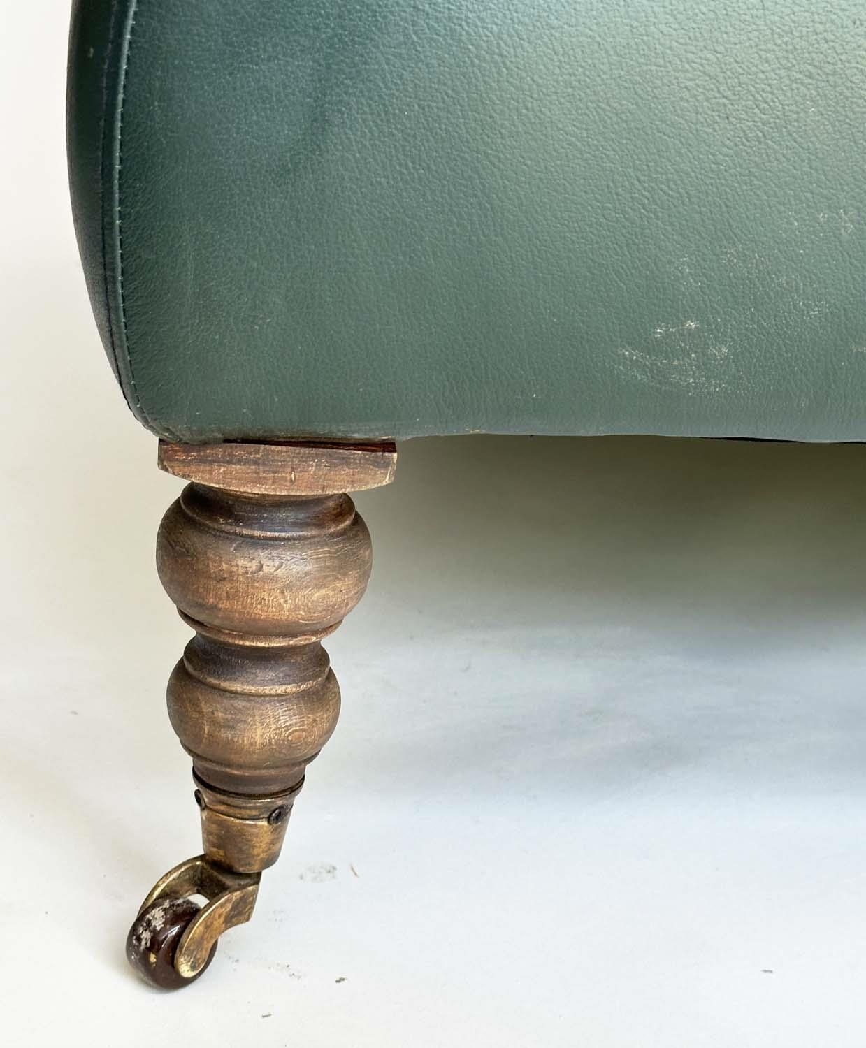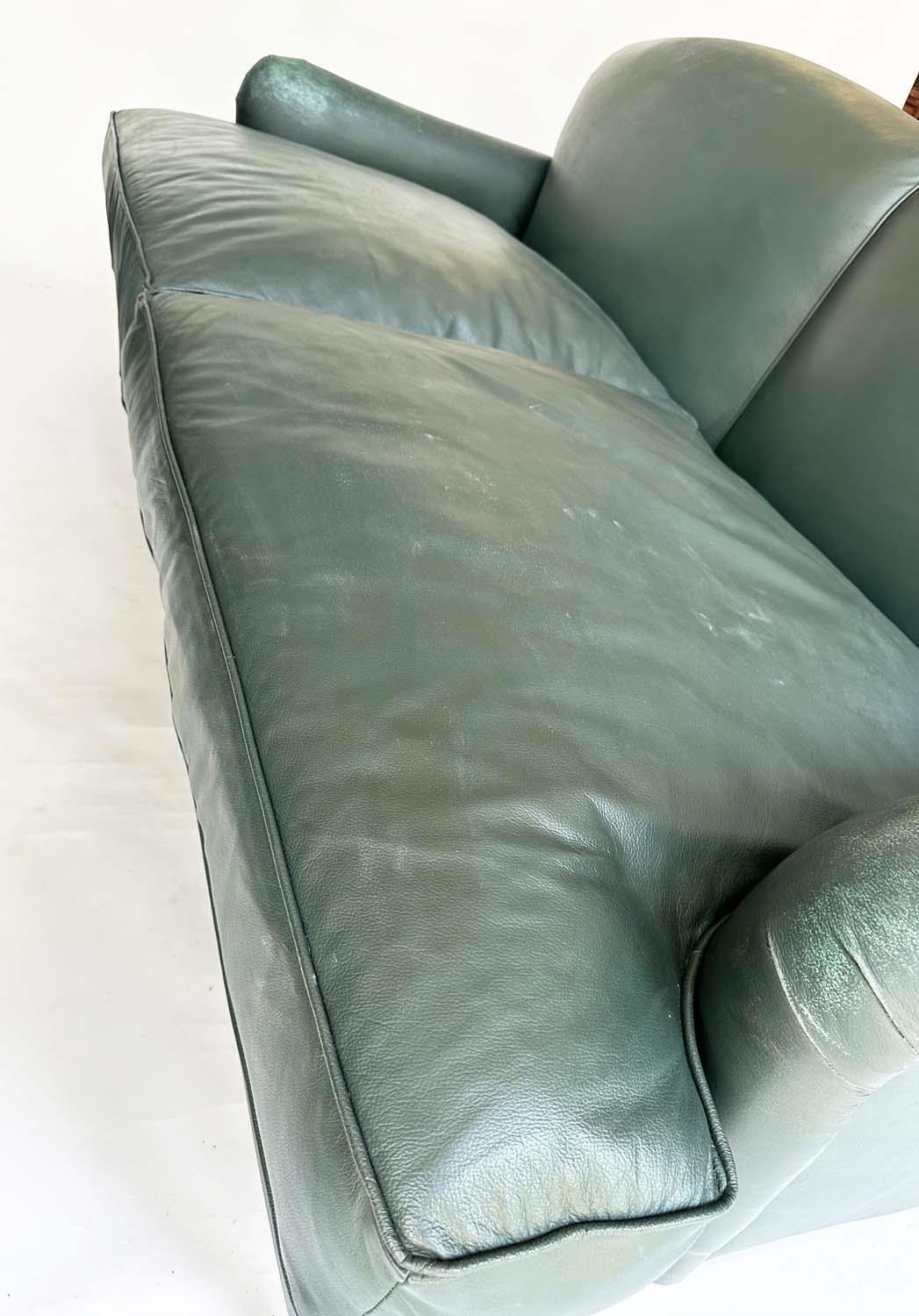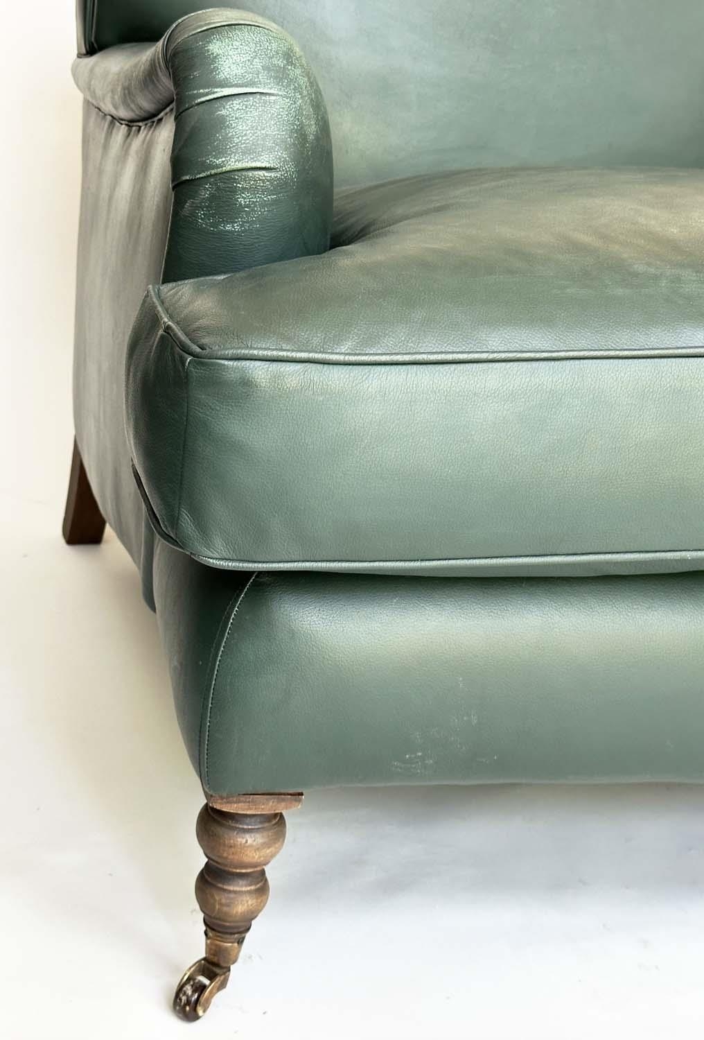 HOWARD STYLE SOFA, natural soft green leather upholstered with turned supports, 95cm H x 210cm W x 115cm D.