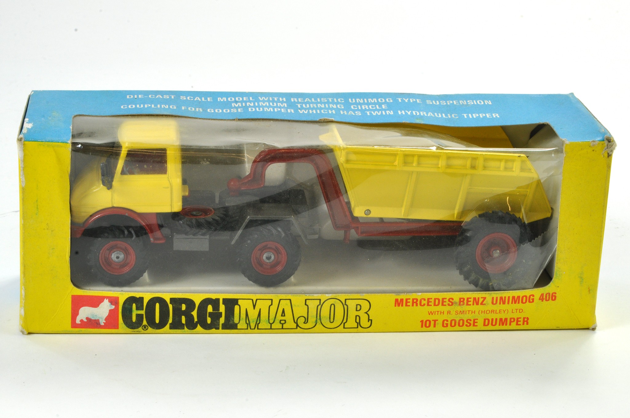 Corgi Major Pack No. 1145 Mercedes Unimog 406 with Gooseneck Dumper. Yellow with Red / Grey Chassis. Red interior. Generally excellent, the odd mark in good to very good box, some creasing to cellophane and general storage wear.