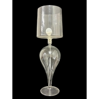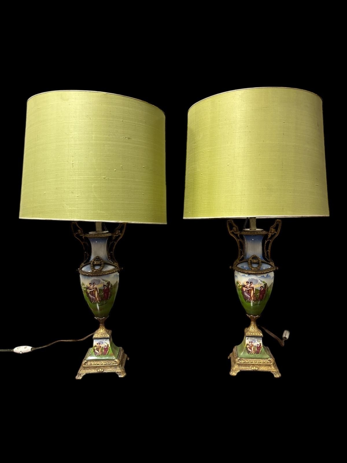 A PAIR OF 19TH CENTURY GILT METAL MOUNTED URN TABLE LAMPS fitted for electricity with open scrollwork handles and bracket feet 65cm (h)