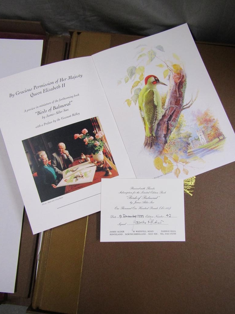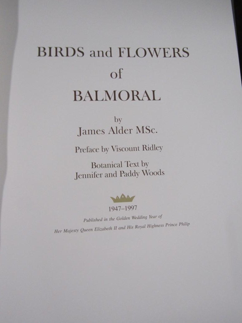 BIRDS AND FLOWERS OF BALMORAL BY JAMES ALDER WITH PREFACE BY VISCOUNT RIDLEY AND THE BOTANICAL TEXT BY JENNIFER AND PADDY WOODS 1947-1997. PUBLISHED IN THE GOLDEN WEDDING YEAR OF HER MAJESTY QUEEN ELIZABETH II AND HIS ROYAL HIGHNESS PRINCE PHILLIP BEING BOOK NO. 42, SIGNED BY JAMES ALDER, 1997