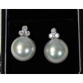 A pair of 18ct white gold South Sea and diamond ear rings, set with a 14 mm bead with a brilliant cut diamond trefoil above, case.