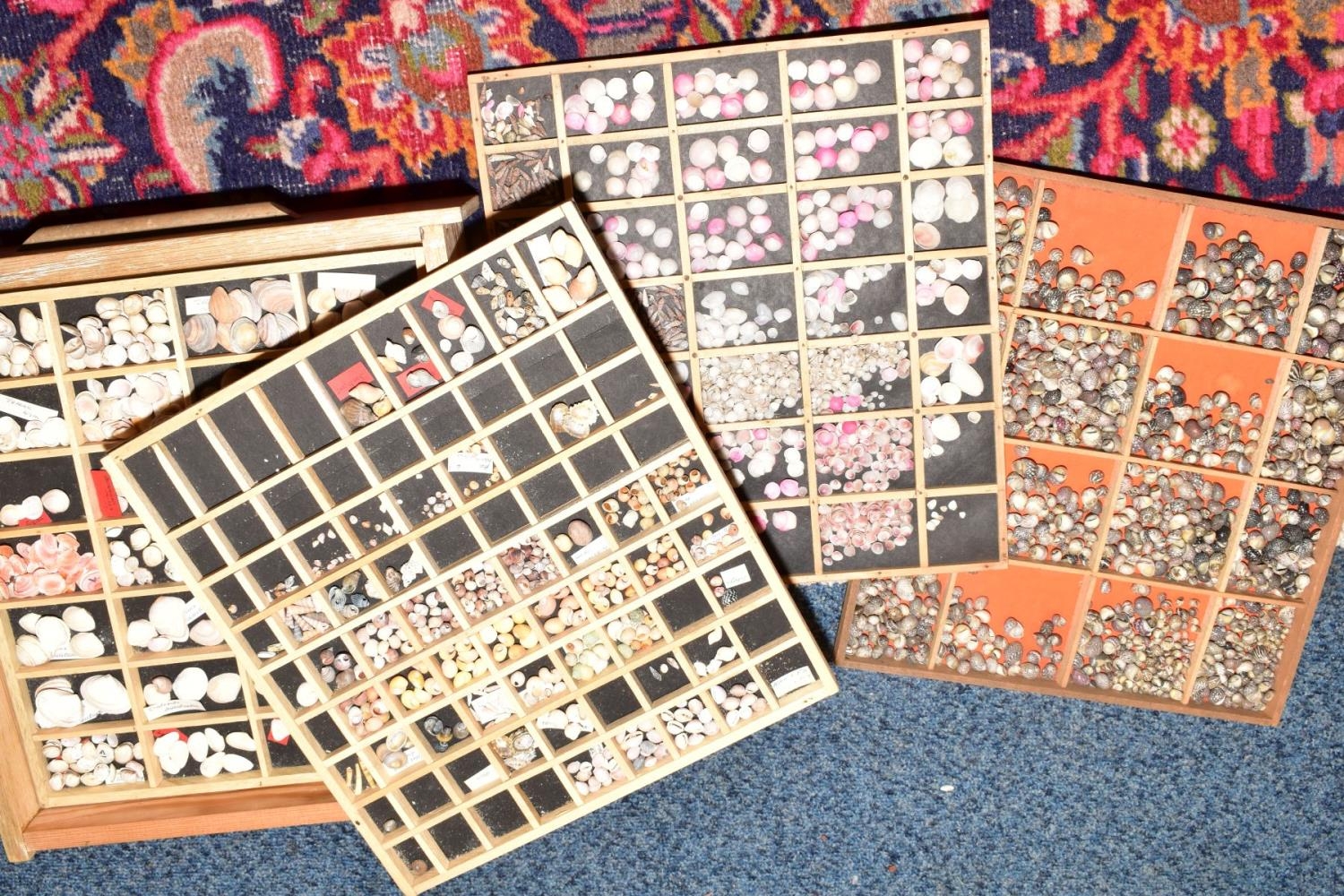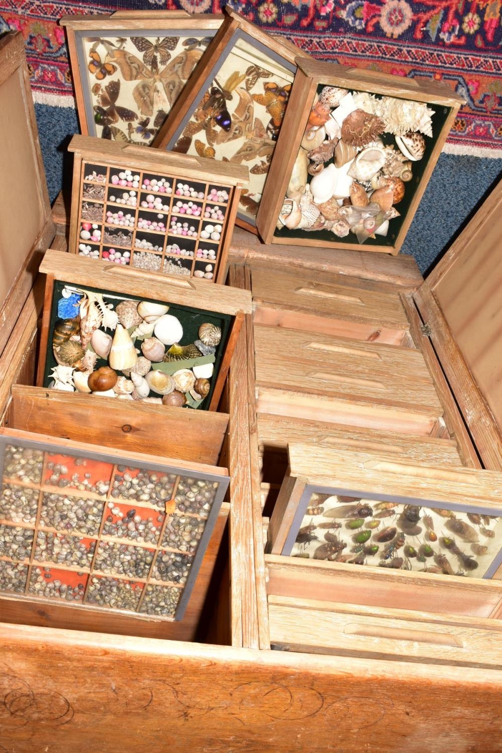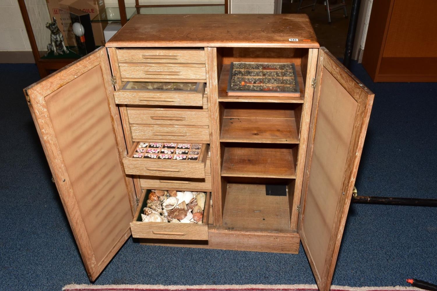A MID 20TH CENTURY LINED OAK COLLECTORS CABINET, containing trays and drawers of shells, fossils and Entomology interest, incljuding moths, beetles, etc, some items with hand written labels, the cabinet believed to be a converted gentlemans tall boy
