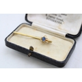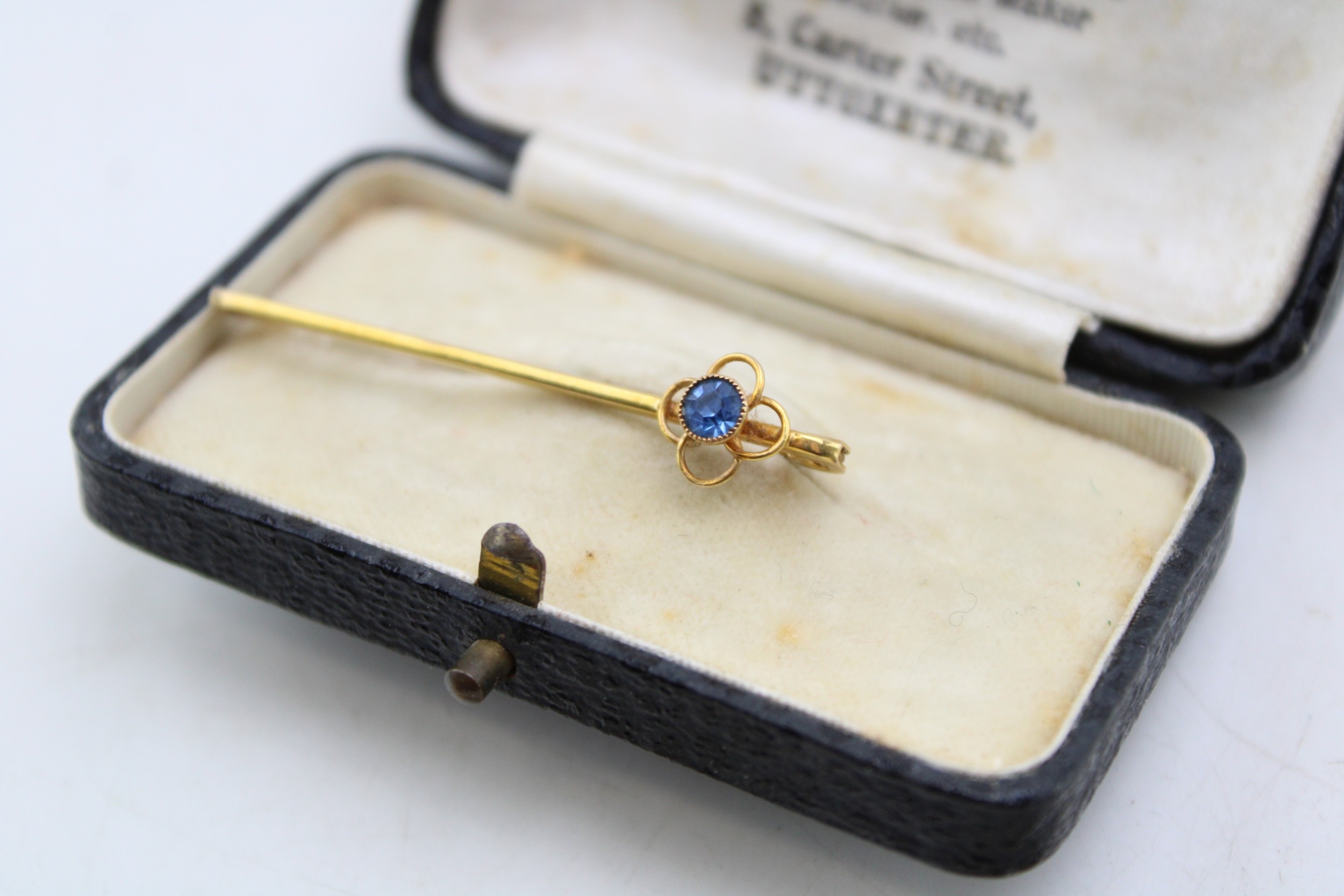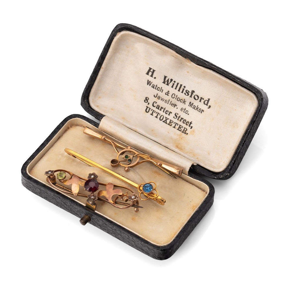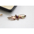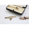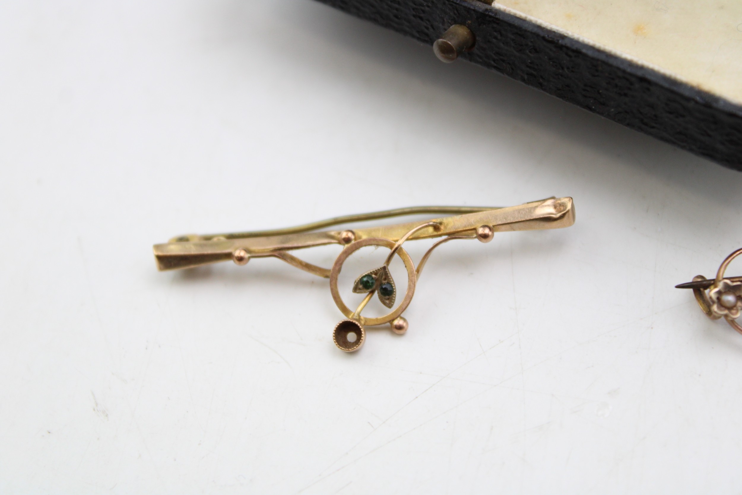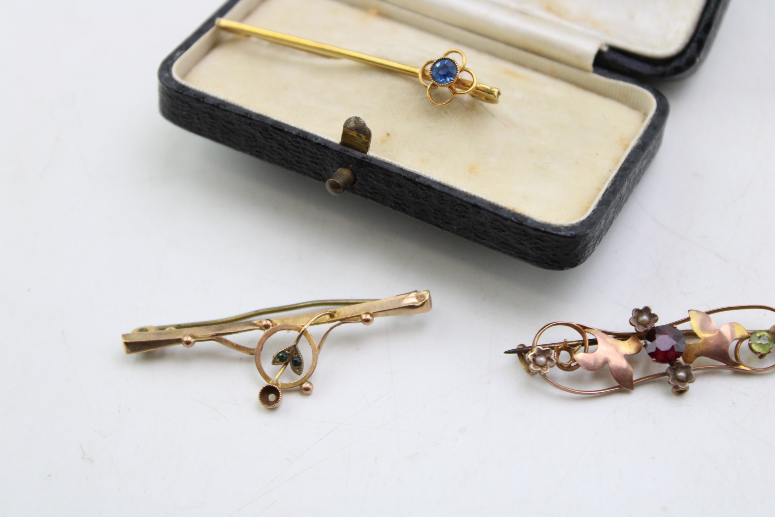 A group of three 9ct gold brooches, comprising a yellow gold bar brooch set with blue paste set with in a quatrafoil florette, a rose gold brooch of scrolling open foliate form set with seed pearls within small flowers, garnet and peridot, a/f one perido missing, and a bar brooch with floral detail, set with green stones and collet setting for another, a/f stone missing, total weight of three combined 4.6g.