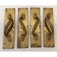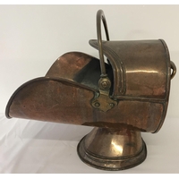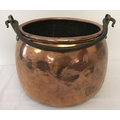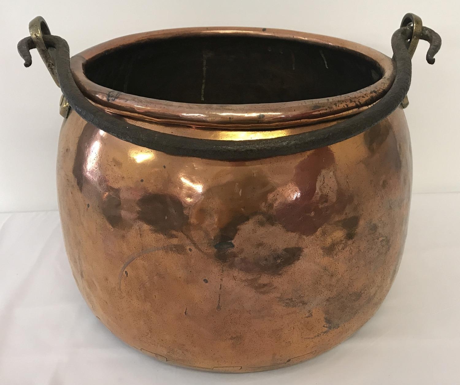A very large antique copper cooking cauldron with riveted brass handle brackets and swing handle. Approx. 30cm tall x 39cm diameter.