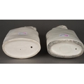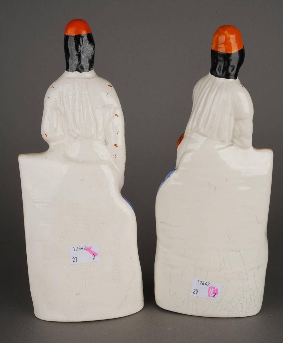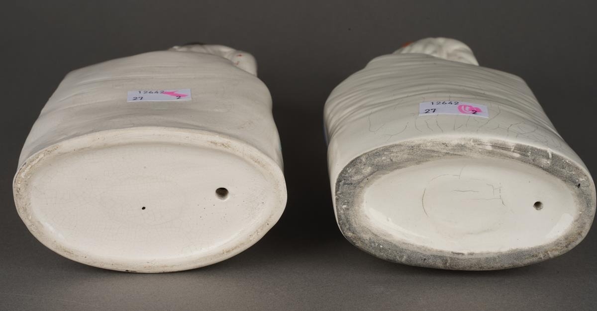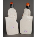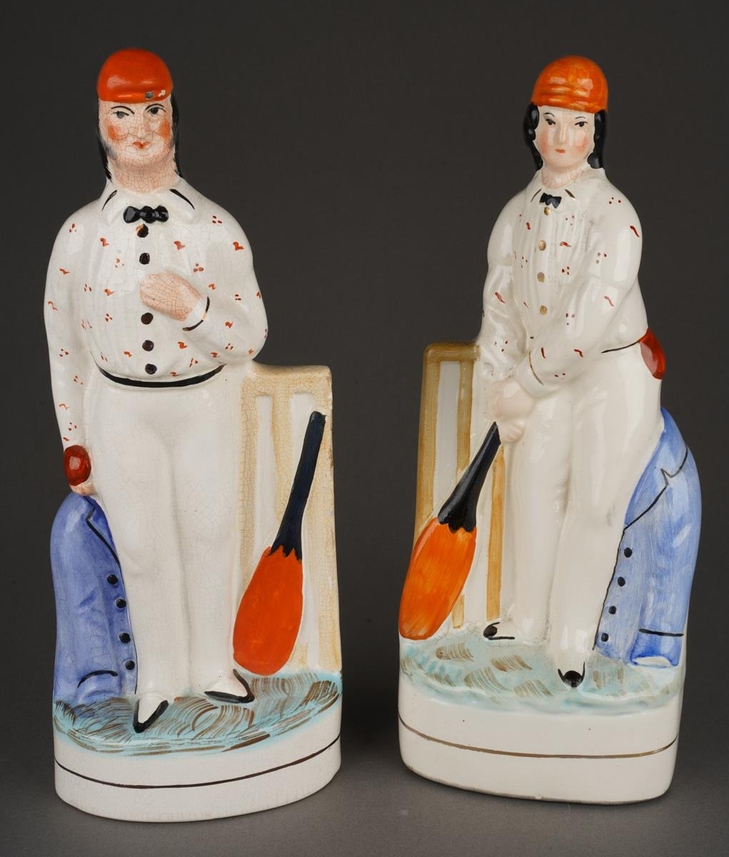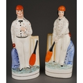 A pair of Staffordshire flatback figures of Cricketeers, each with orange caps, orange and black bats and blue jackets, approx 16cm high [2]