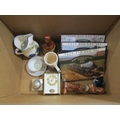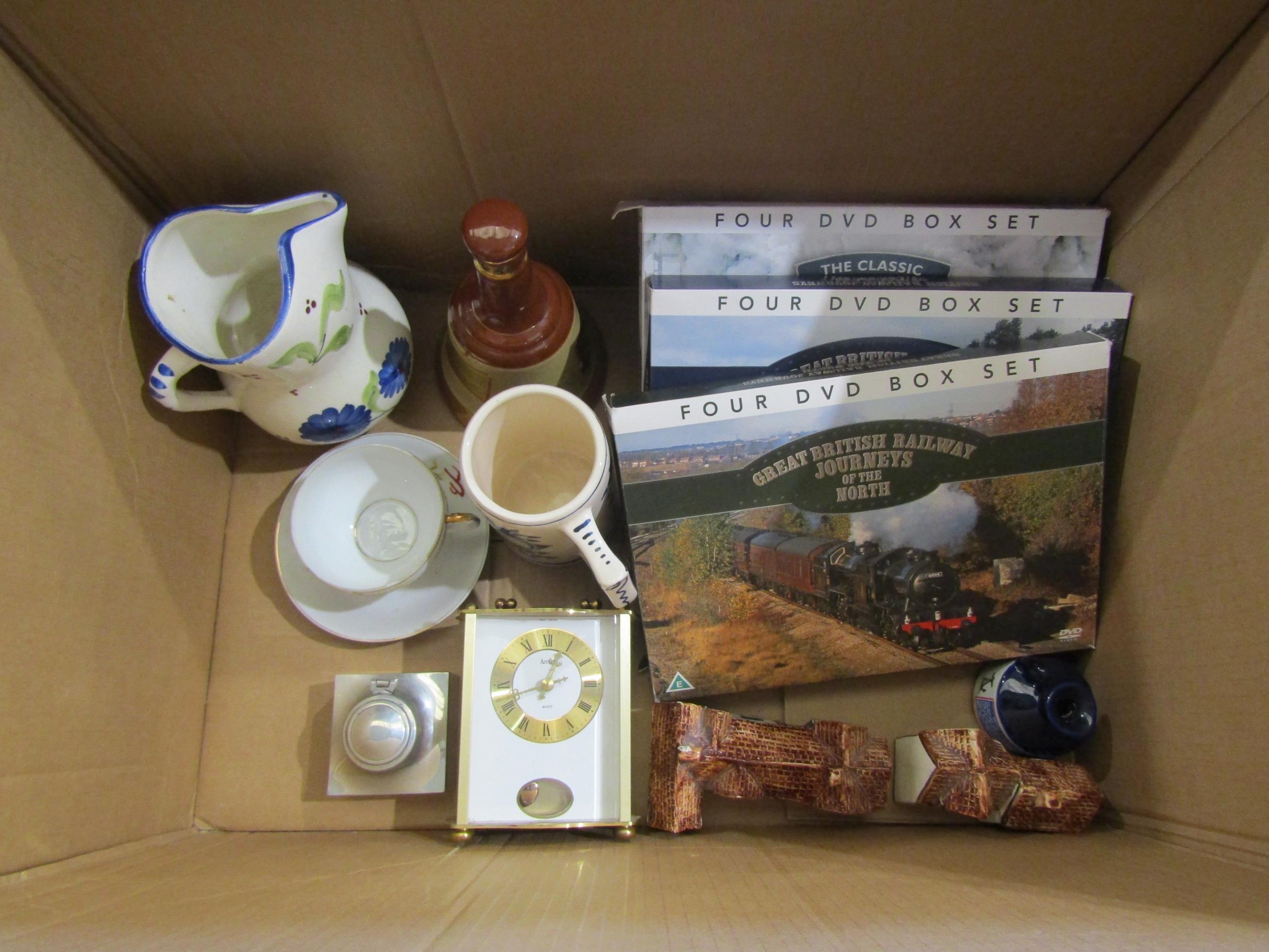 A mixed lot including Great British Railway Journeys DVD sets, North, South and The Classic British Steam collection, an Acctim quartz carriage clock, Tey Pottery buildings, Swan Inn, Lavenham and Cromwell's Upton-on-Severn, Delft tankard and Japanese eggshell cup and saucer