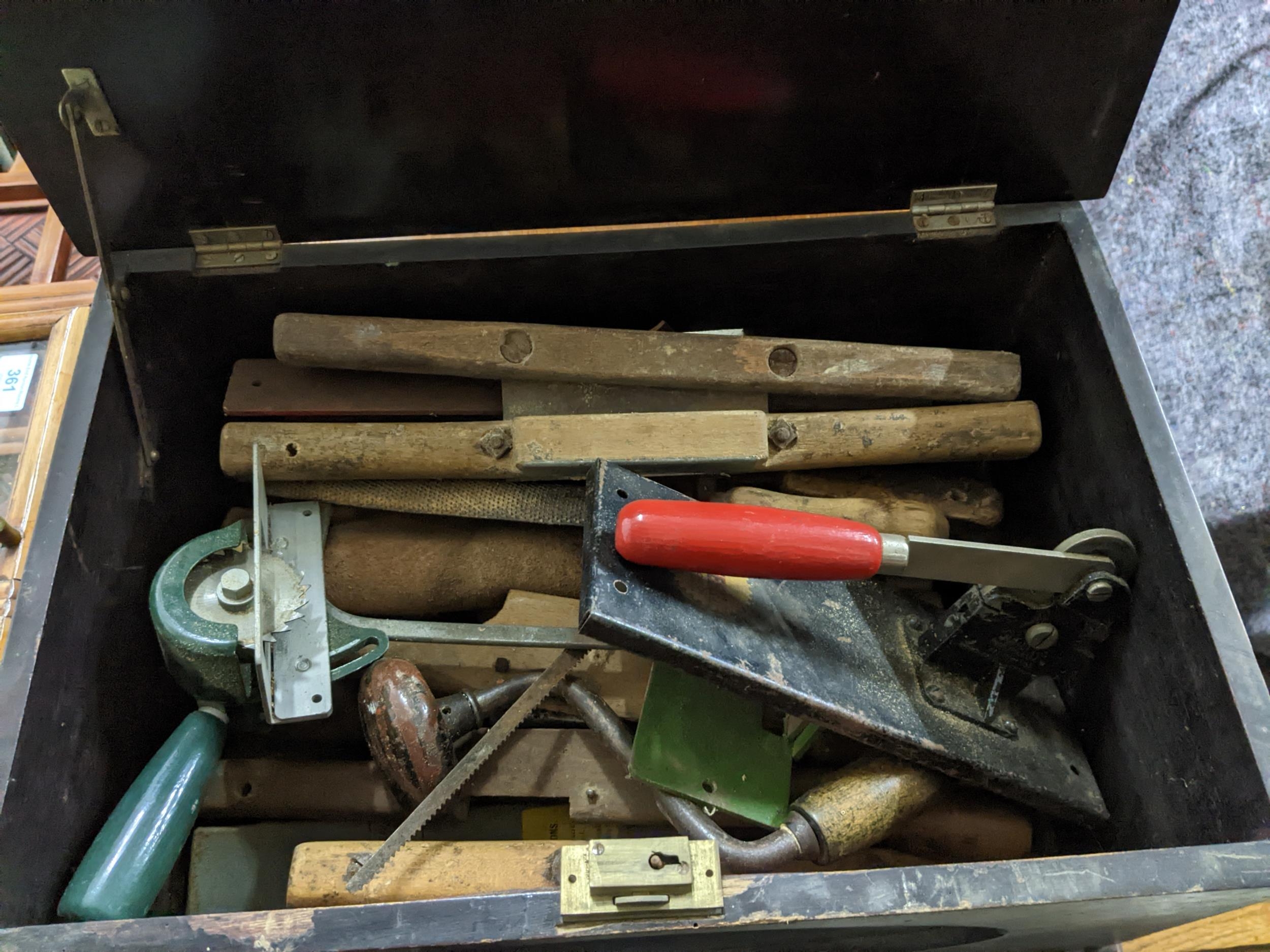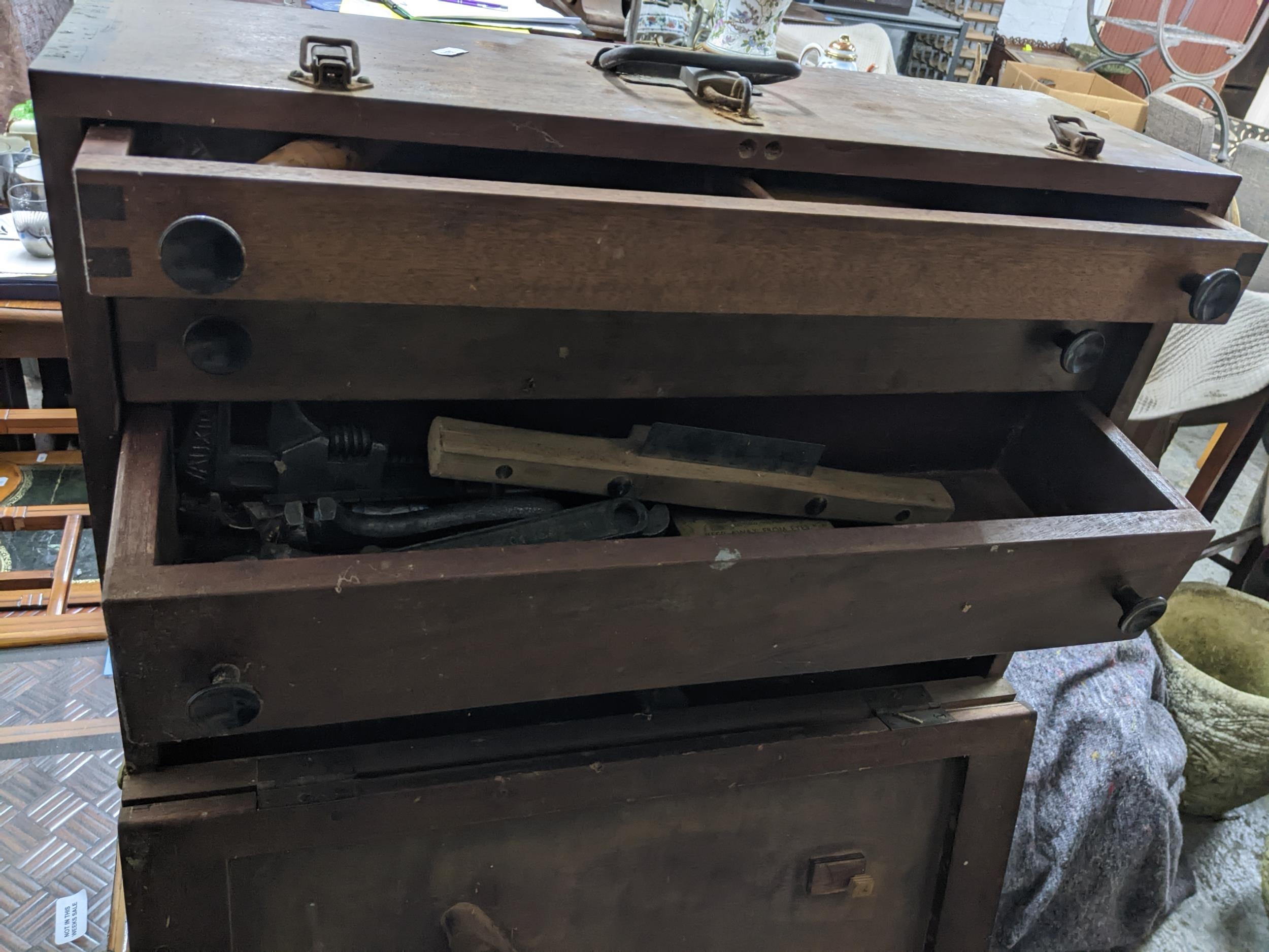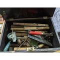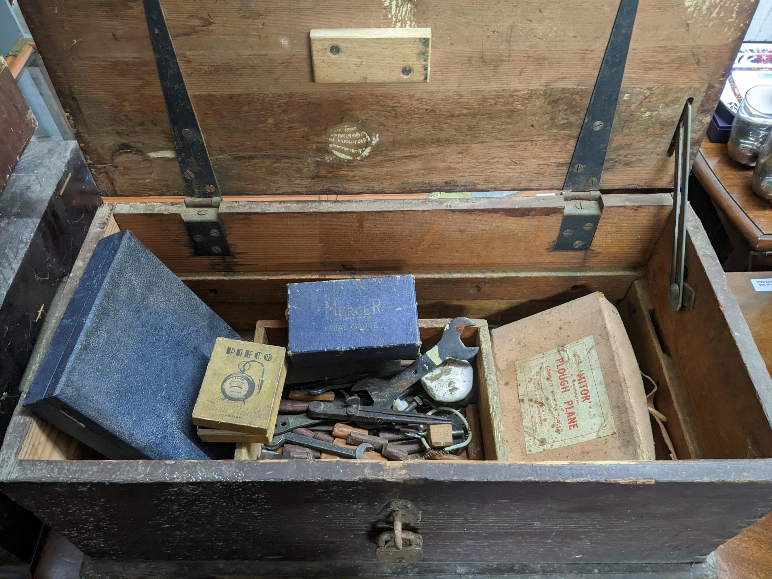 A mixed lot of tools contained mainly in three wooden tool boxes to include a Mercer dial gauge, a Mitor plough plane, chisels and other tools