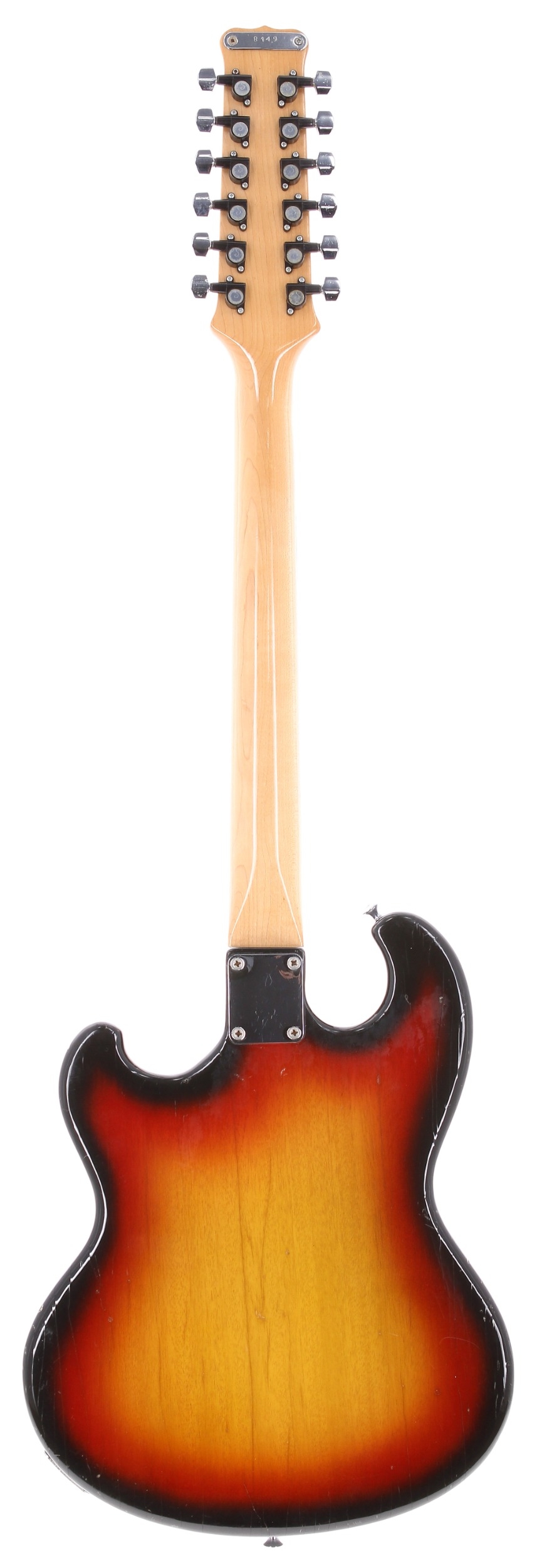 1970s Shergold Custom Masquerader twelve string electric guitar, made in England; Body: three-tone sunburst finish, typical lacquer cracking, various dings and other marks throughout; Neck: maple; Fretboard: maple; Frets: mild wear; Electrics: working; Hardware: good; Case: semi-rigid fibreboard case; Weight: 3.49kg; Overall condition: fair