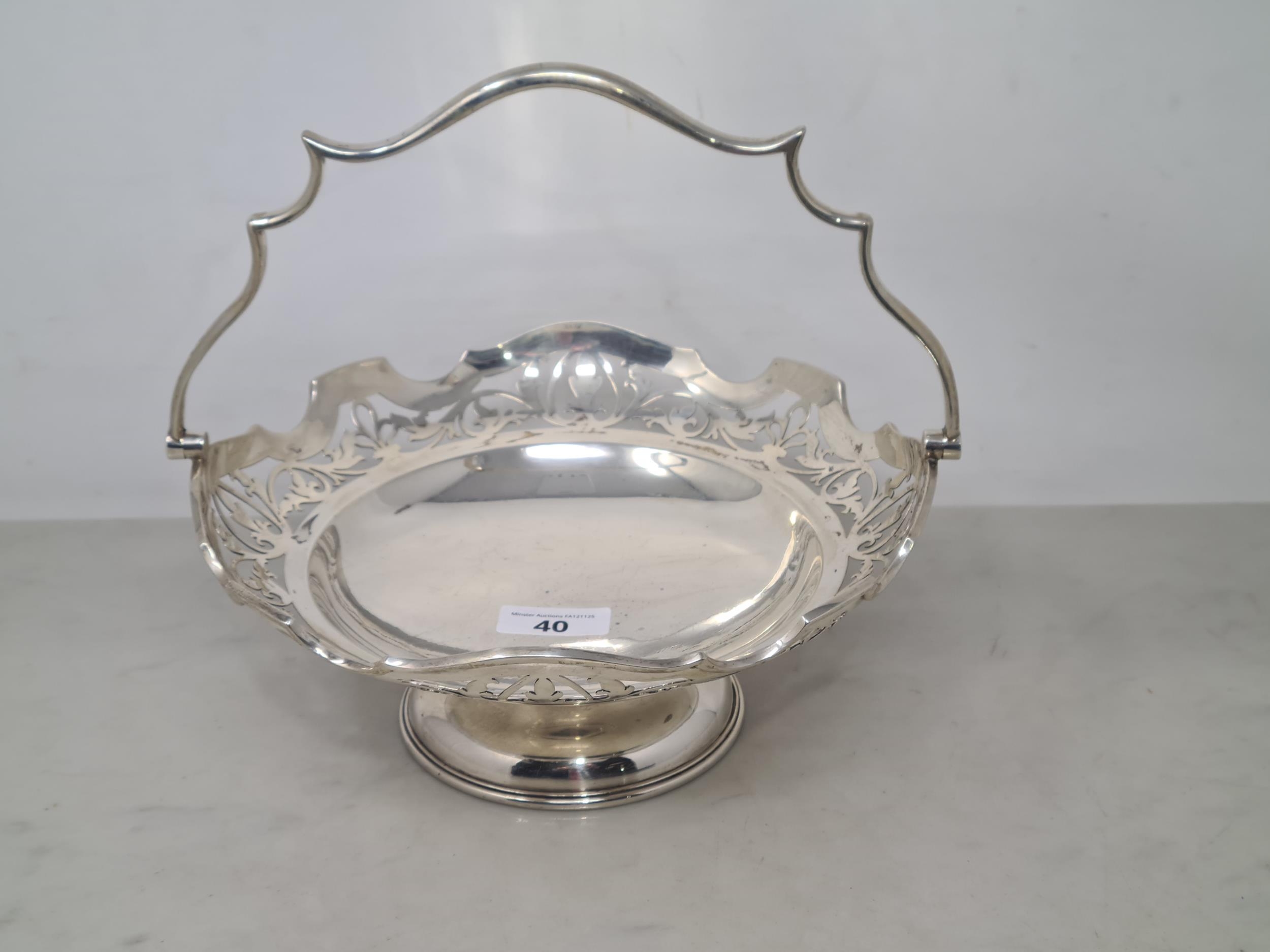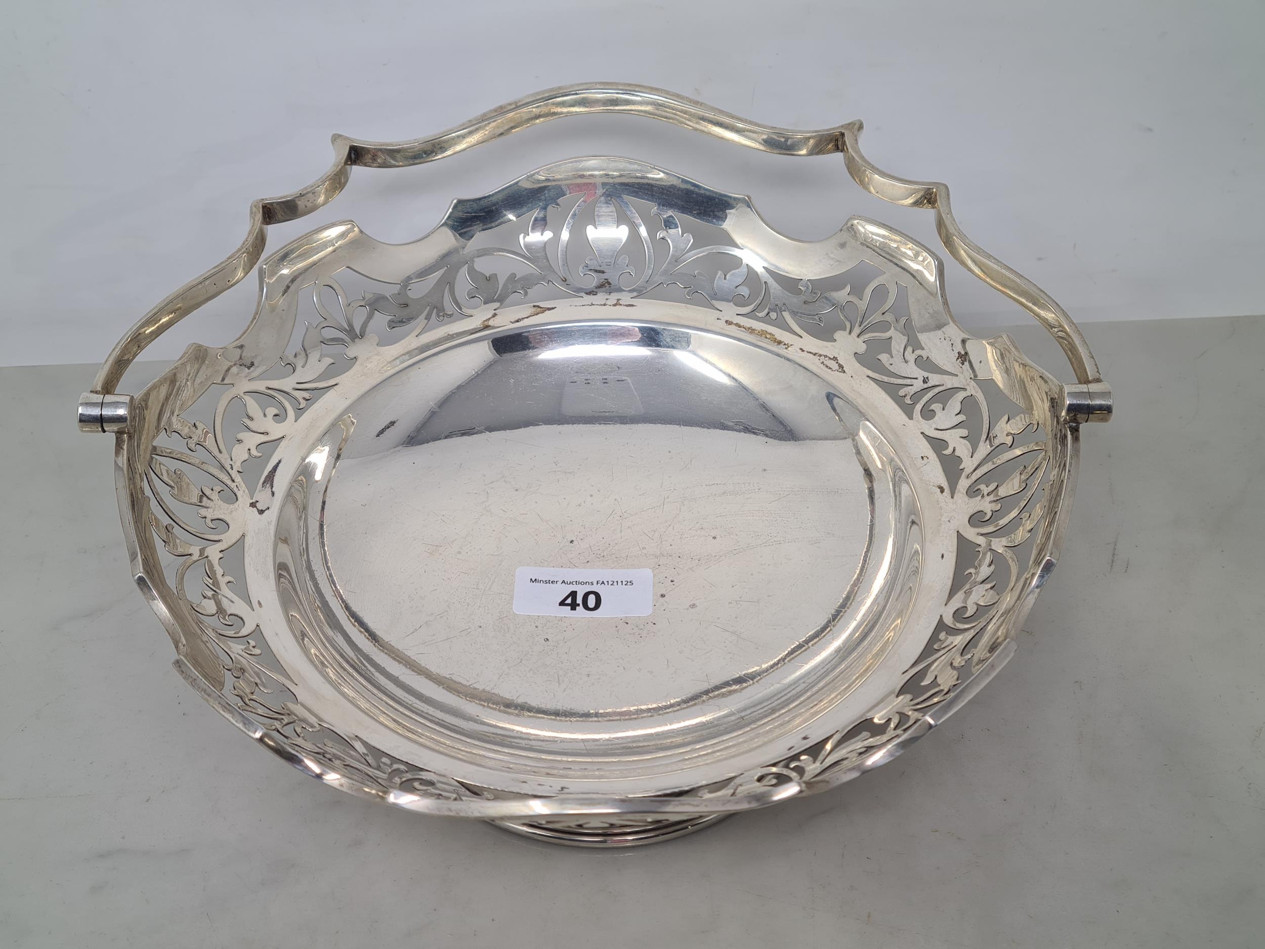 A George V silver circular Cake Basket with pierced frieze and swing handle, Sheffield 1921, 630gms
