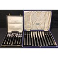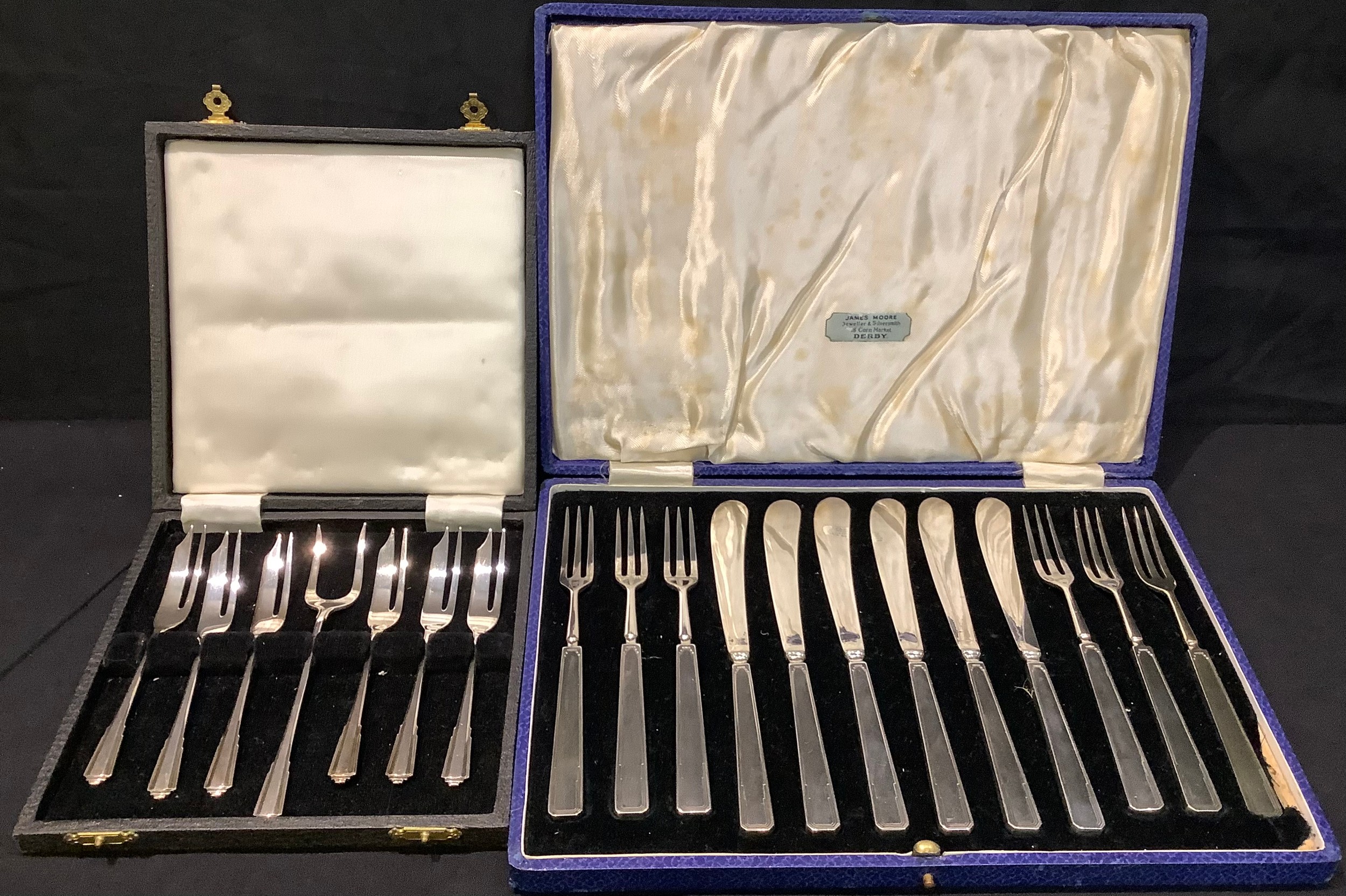 A set of six George VI silver cake forks and serving fork, Birmingham 1951, 97.25g, cased; a set of Elkington EPNS cake knives and forks, boxed