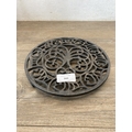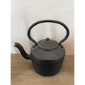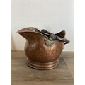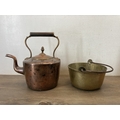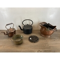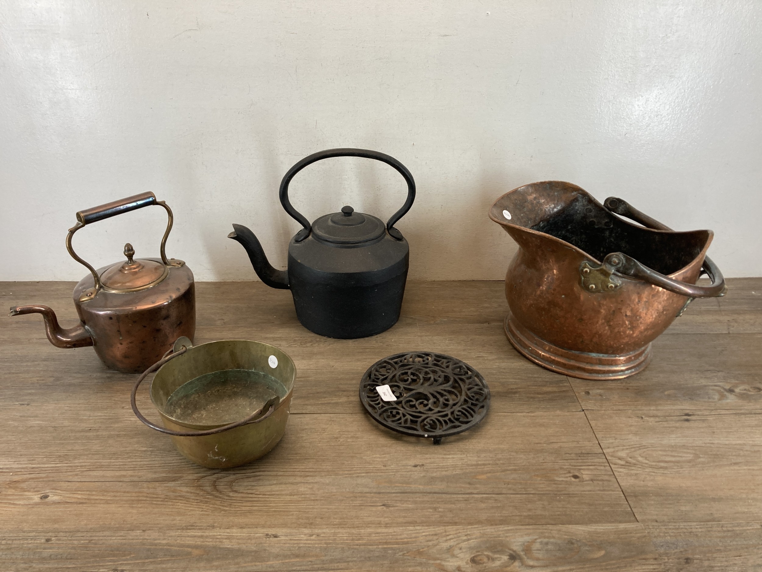 Five items of late 19th century and later metalware, copper coal scuttle, copper kettle, cast iron kettle, brass jam pan and cast metal trivet