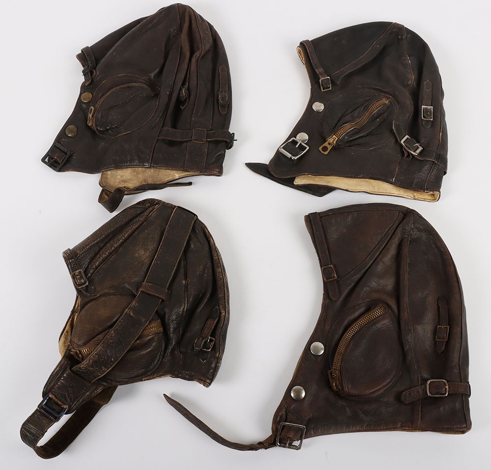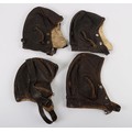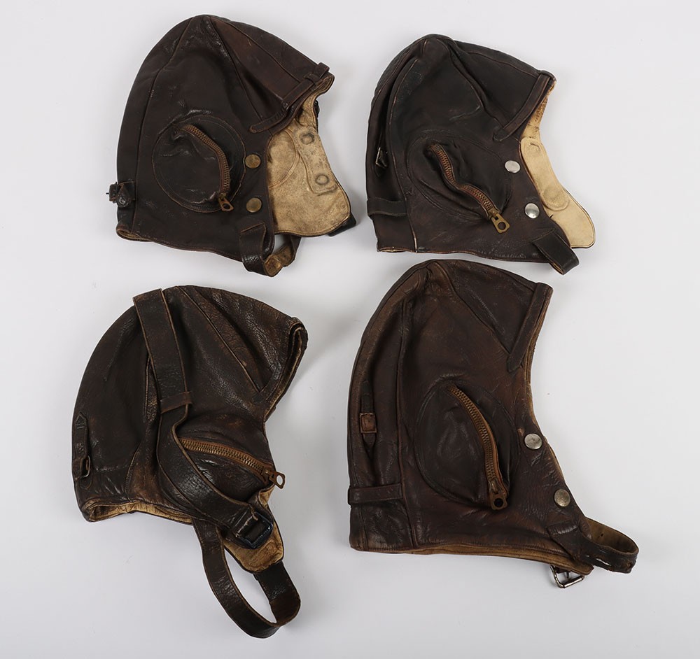 WW2 RAAF B Type Flying Helmets, Four Examples. A selection of four original WW2 Royal Australian Air Force B type flying helmets. All are in fair conditon with signs of service and age related wear. One variant has an over the head type strap. Another has the official label dating the helmet to 1944. All ear cup zips are in situ as well as the press stud fittings for the oxygen mask and chin straps.