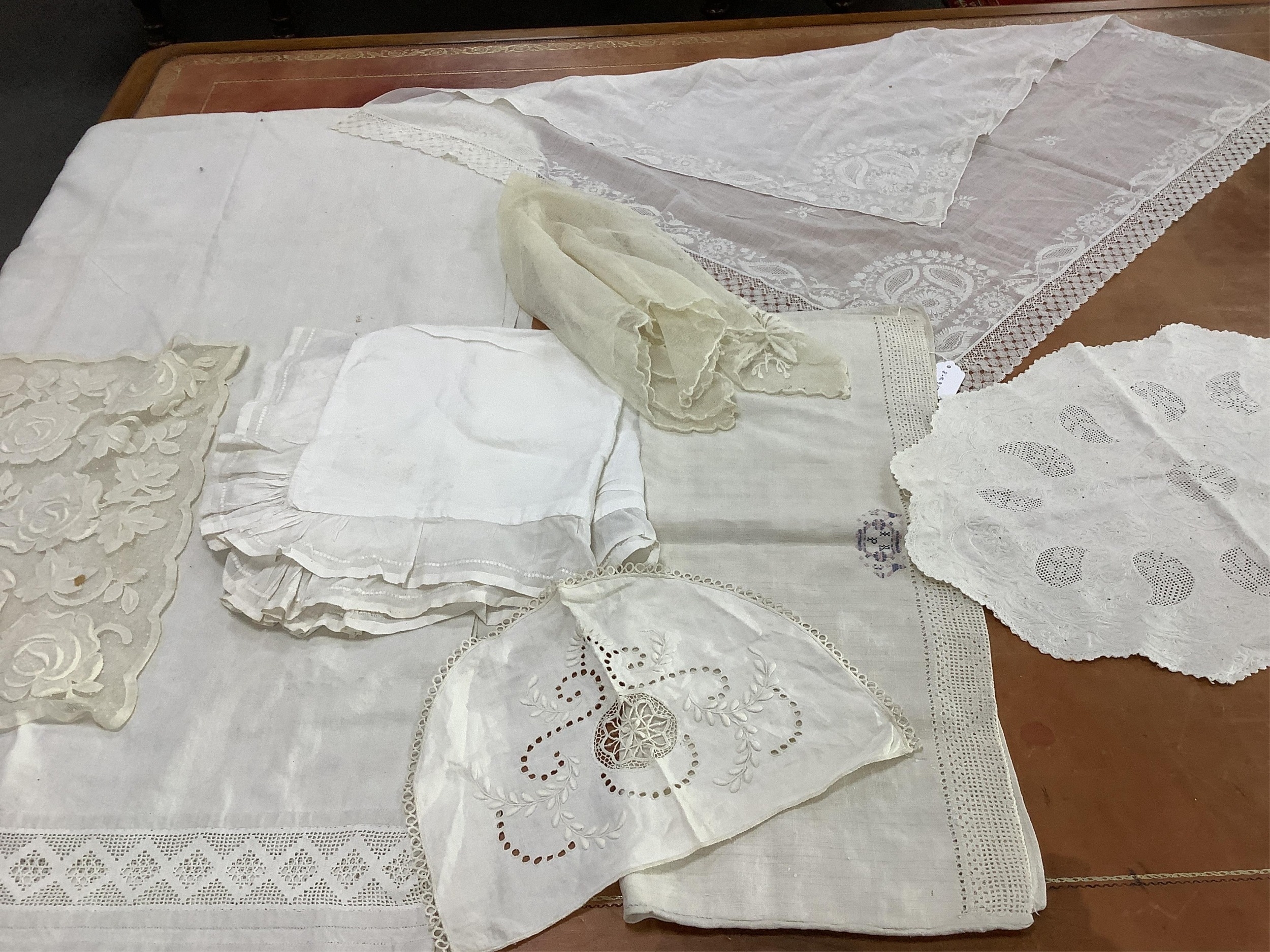 A fine 19th century white linen, ladies white embroidered shawl collar with fine crochet edging, two embroidered net centres, a fine drawn thread and embroidered centre and cross stitch linen sofa back, a square frilled pillow case and crochet edged monogrammed coarse linen sheet-148cm wide x 256cm long.