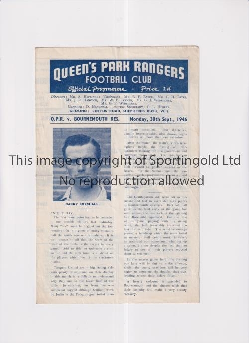 QPR v BOURNEMOUTH 1946 Programme for the Football Combination match at Rangers 30/9/1946, slightly creased. Generally good