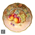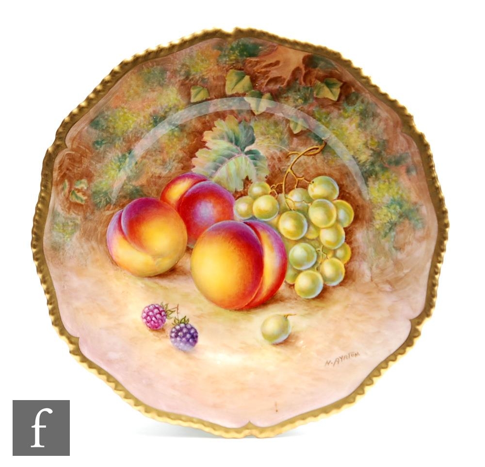 A Royal Worcester Fallen Fruits cabinet or wall plate decorated by Ayrton with hand painted peaches and white grapes, signed, black printed mark, diameter 27cm.