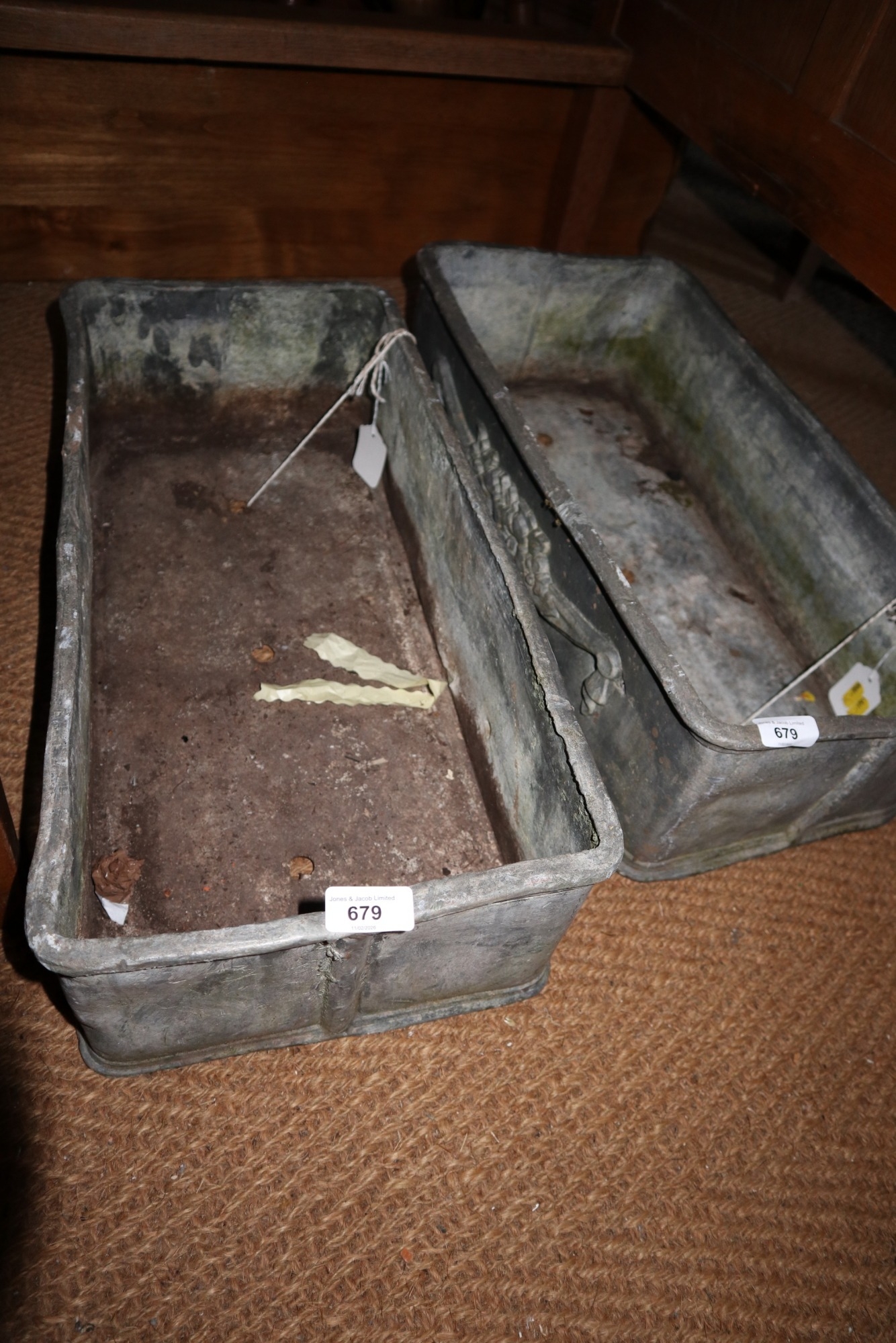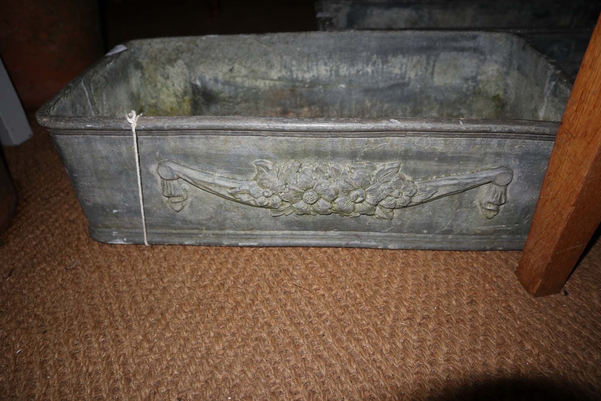 A pair of cast lead rectangular planters with floral and swag decoration, 22" long