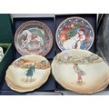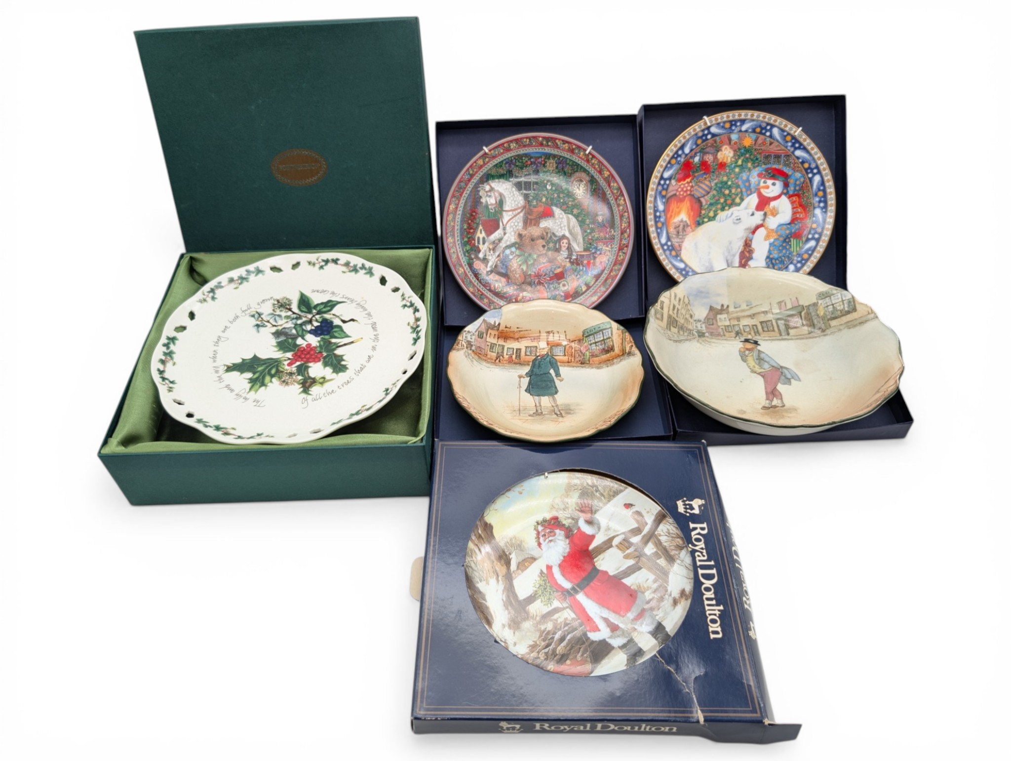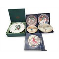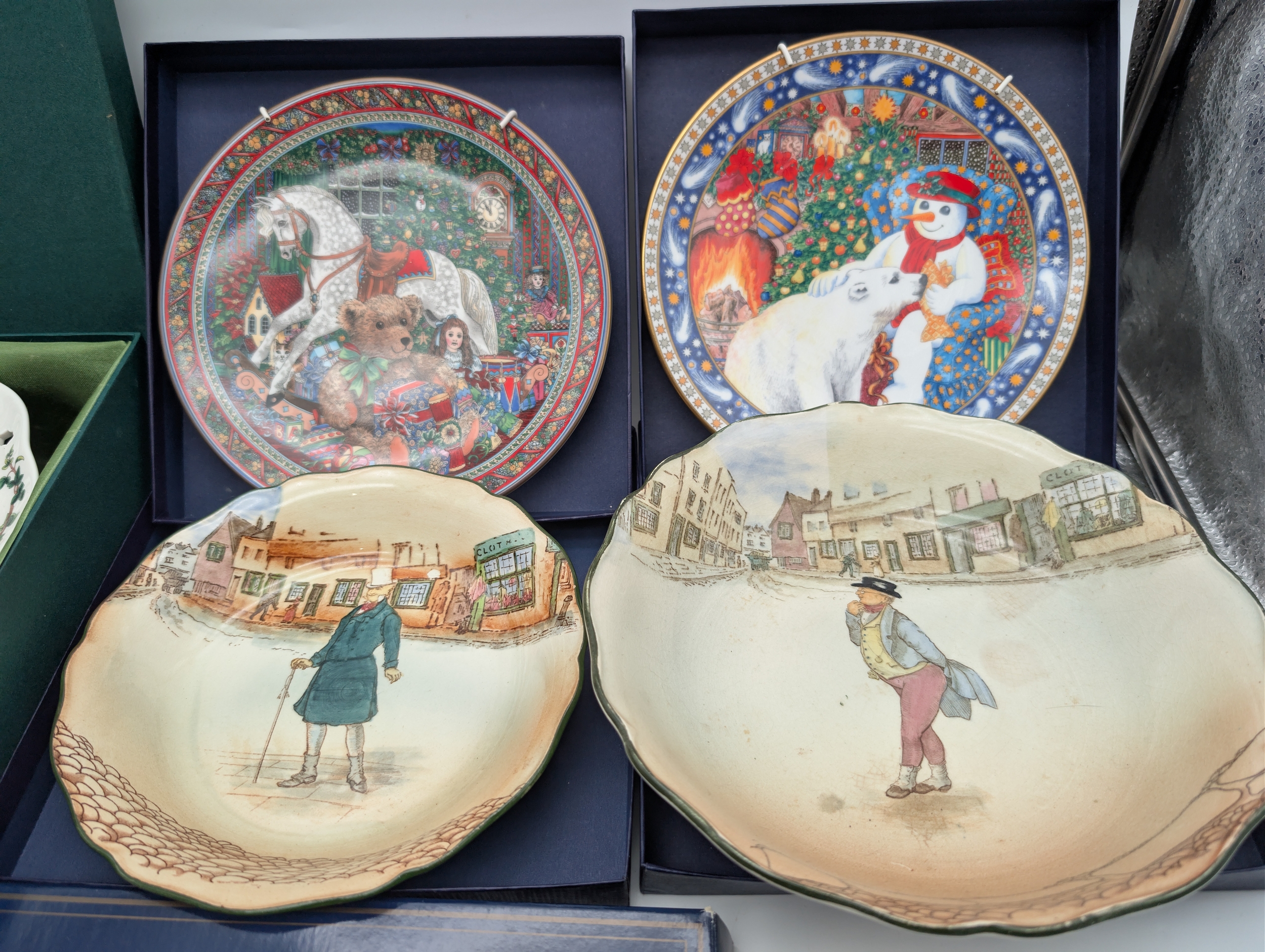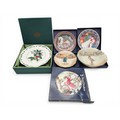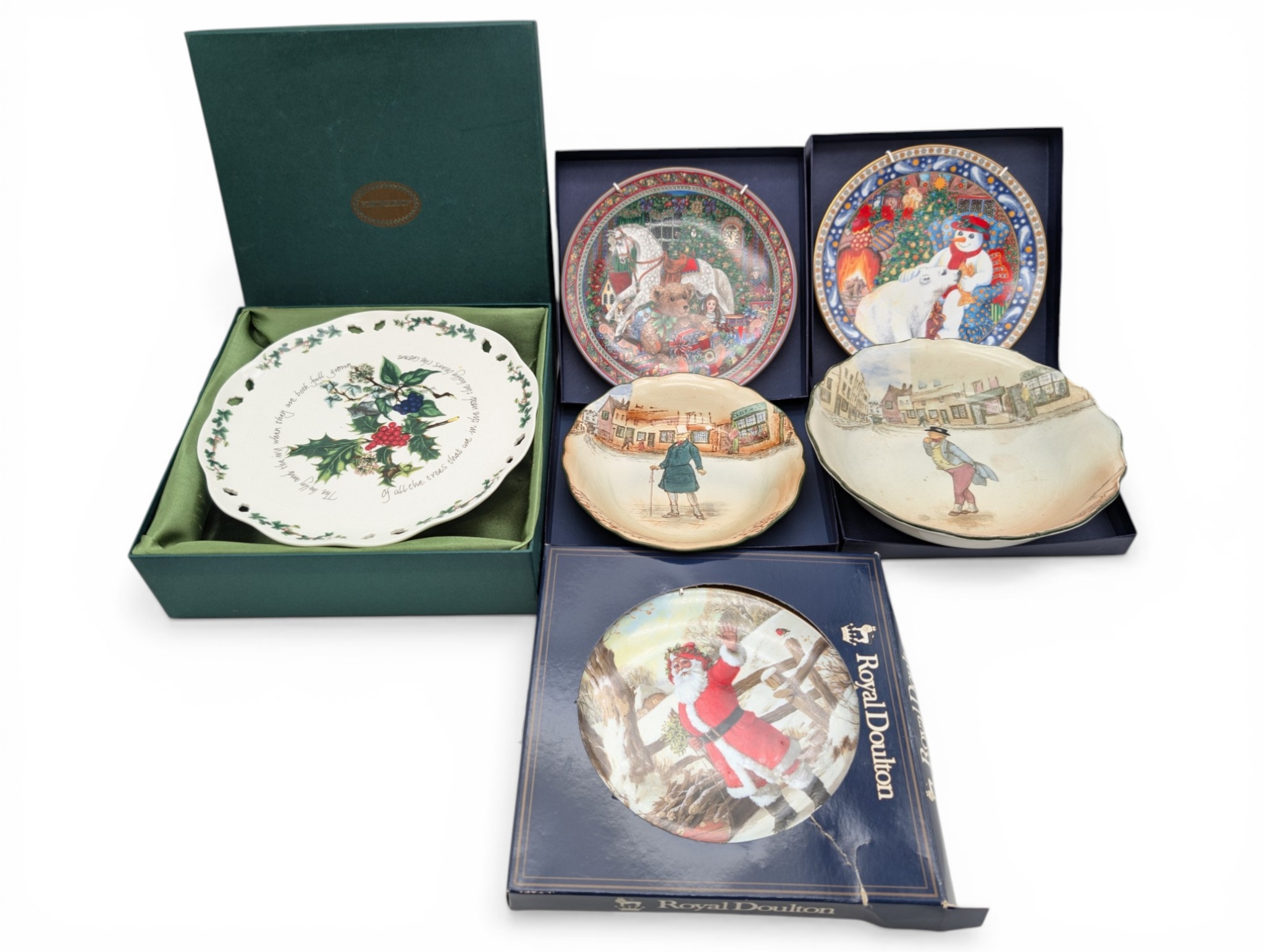Group of Collectors’ Plates, including Royal Doulton and Portmeirion A mixed group of decorative collectors’ plates, including Royal Doulton Christmas examples (boxed), Wedgwood-style Christmas plates, and a Portmeirion ‘Botanic Garden’ dish in original presentation box. Also including two Royal Doulton series ware dishes decorated with Dickensian street scenes. [Generally good condition, some wear to boxes and light surface marks]
