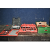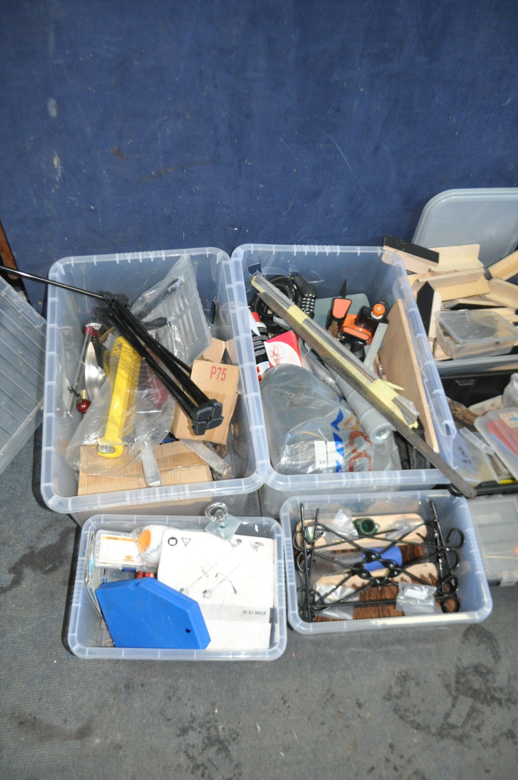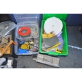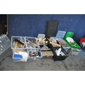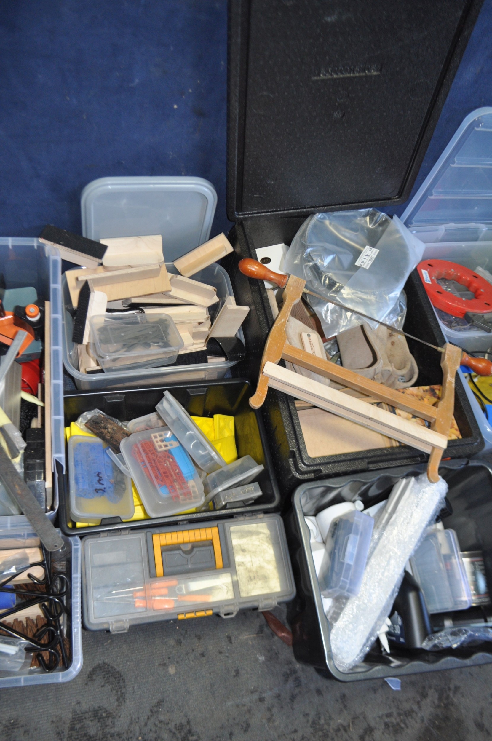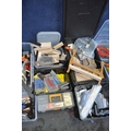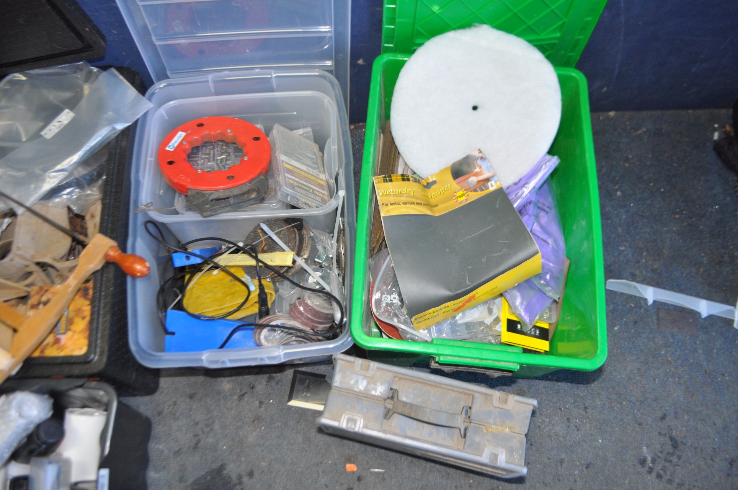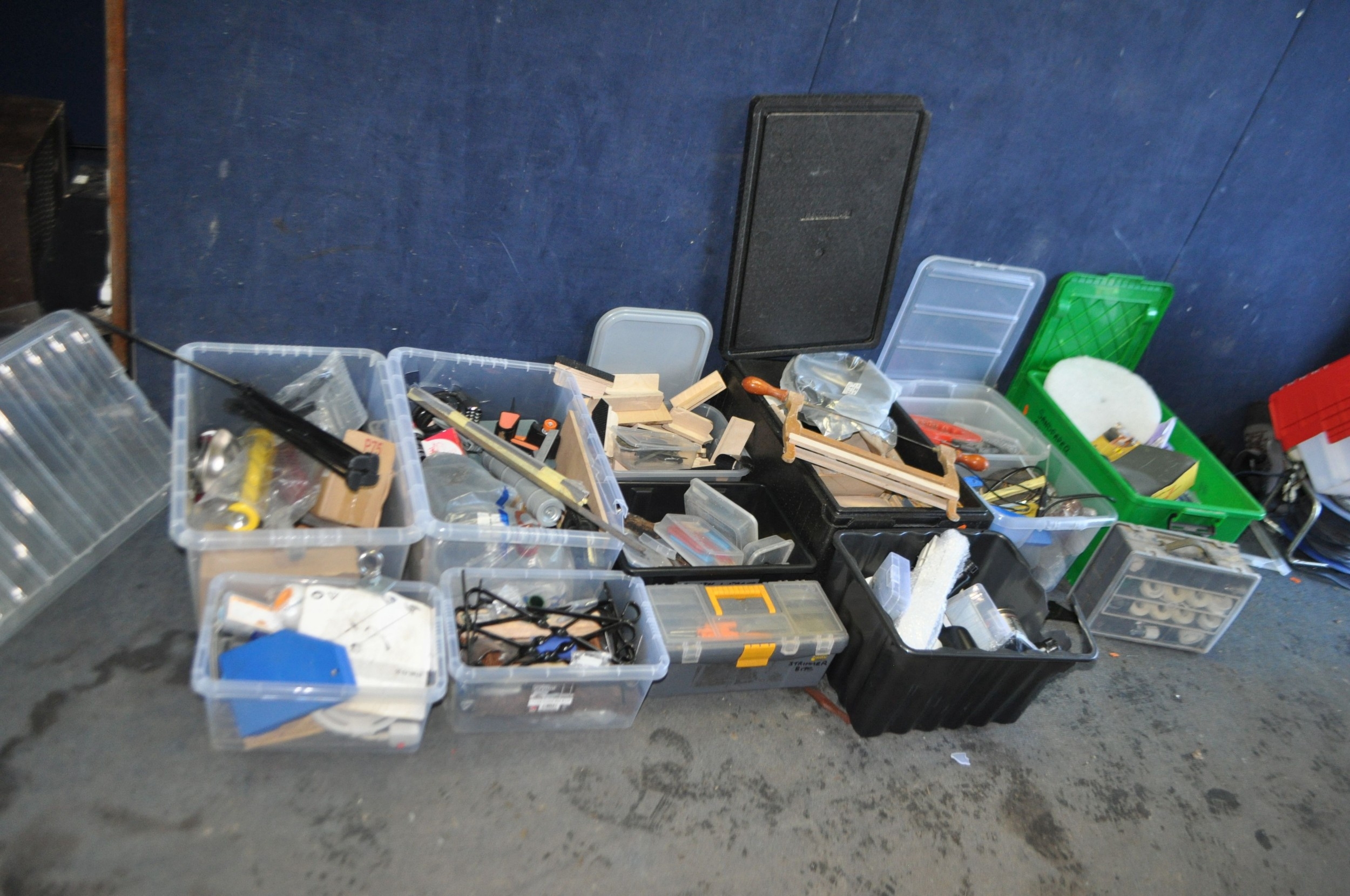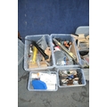 TEN BOXES CONTAINING TOOLS AND HARDWARE including a Mastercraft toolbelt, sanding paper and discs, sanding blocks, plumbing tools, springs, nuts and bolts, pots of PVA glue, etc