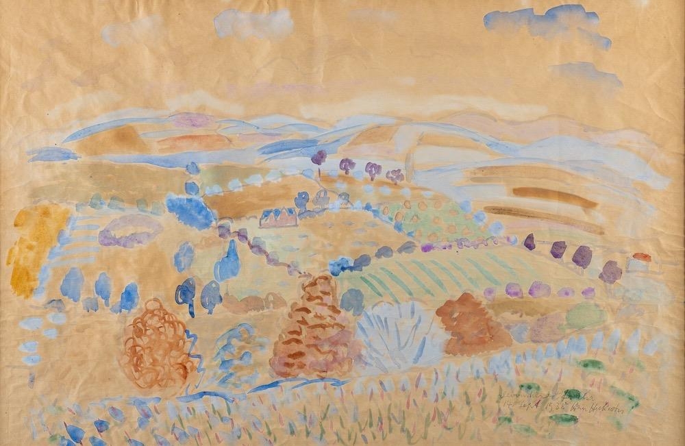 Hein Heckroth (German, 1901-1970) Devonshire landscape inscribed Devonshire for Elsa, 14 Sept 1938 Hein Heckroth watercolour on buff paper 48 x 74cm. After being 'blacklisted' by the Nazis in 1935, stage designer and artist Hein Heckroth settled in Devon, taking up the post of Director at Dartington Art Studio, Dartington Hall, which had become a refuge for artists fleeing occupied Europe. The present watercolour dates from his time in Britain.