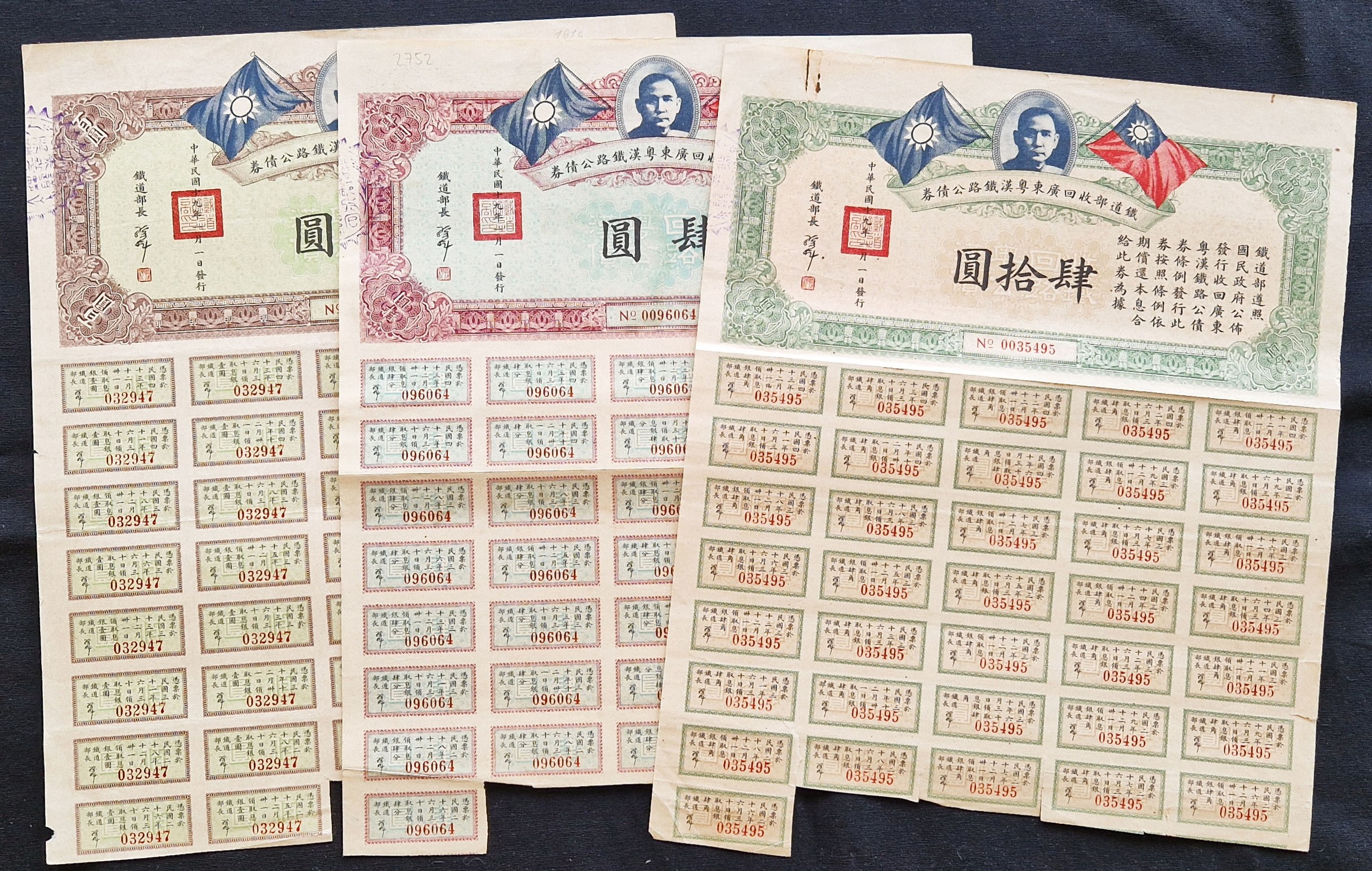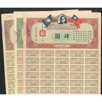 China: 1930 Canton Hankow Railway, Loan of the Ministry of Railways, set of 3 bonds, 4 yuan, 40 yuan and 100 yuan, Sun Yat Sen top centre, flags either side, text all in Chinese, with coupons. VF and better (3).