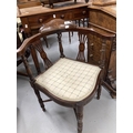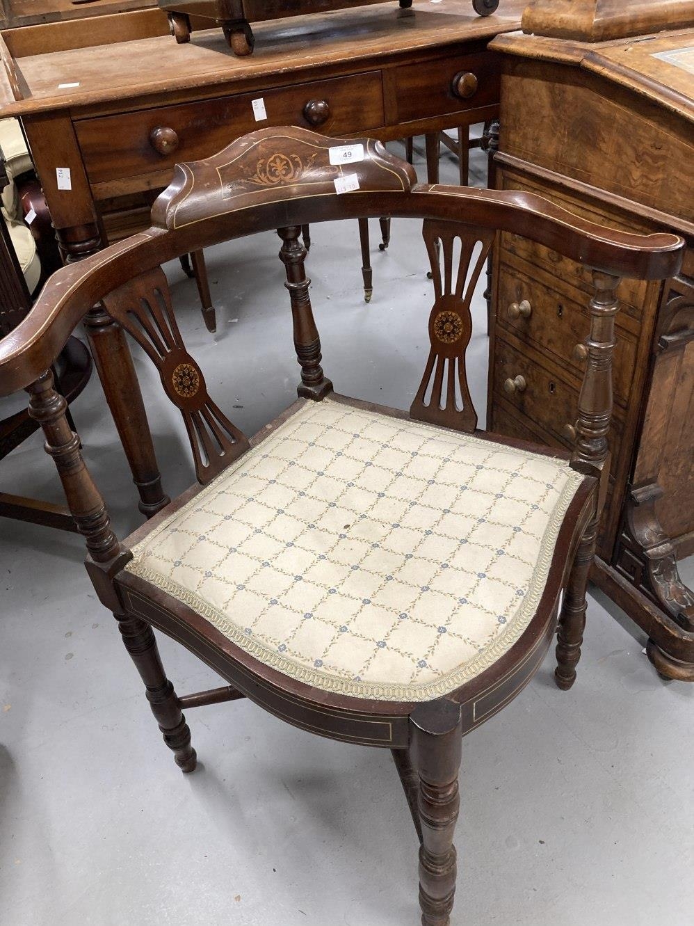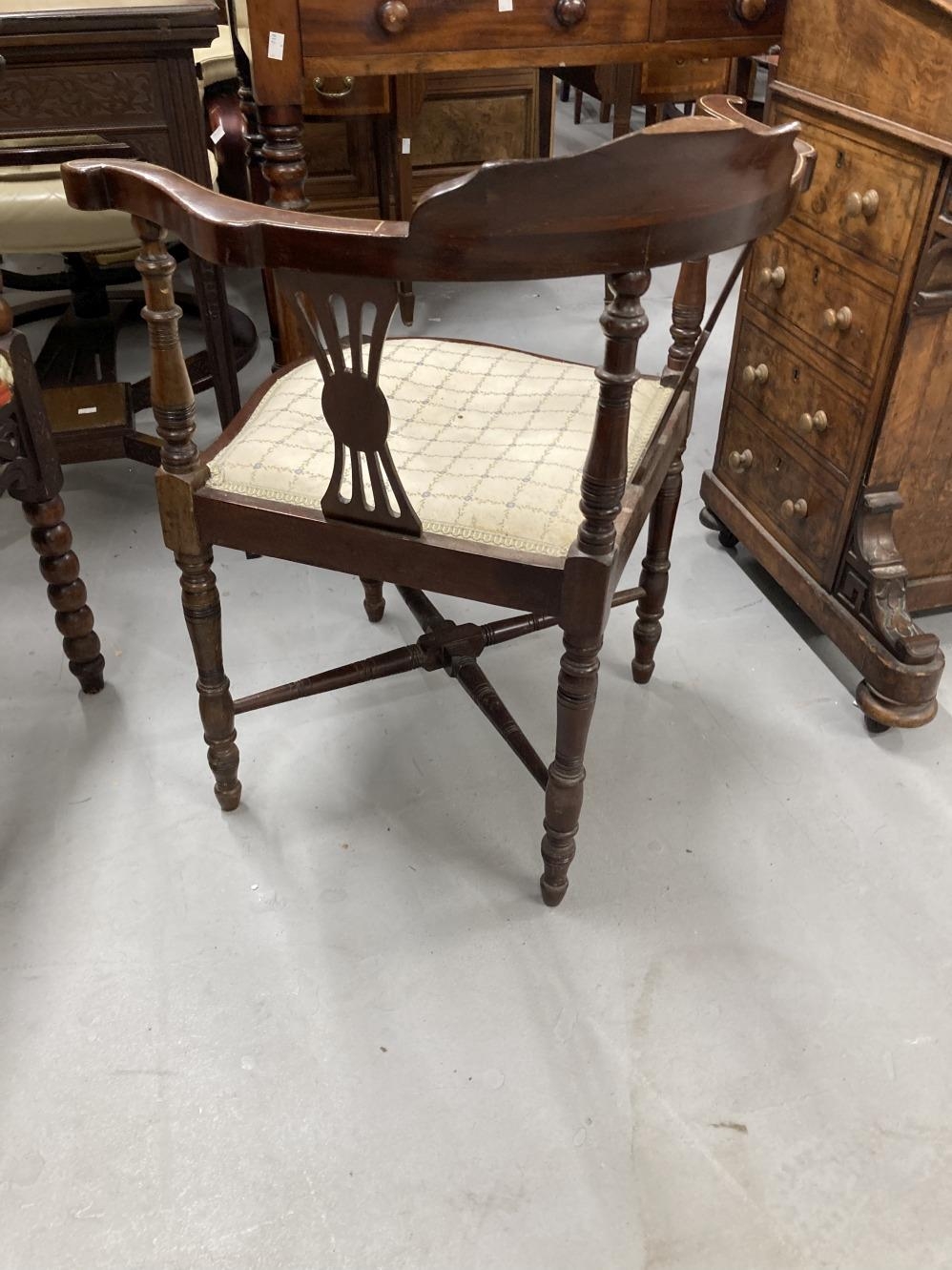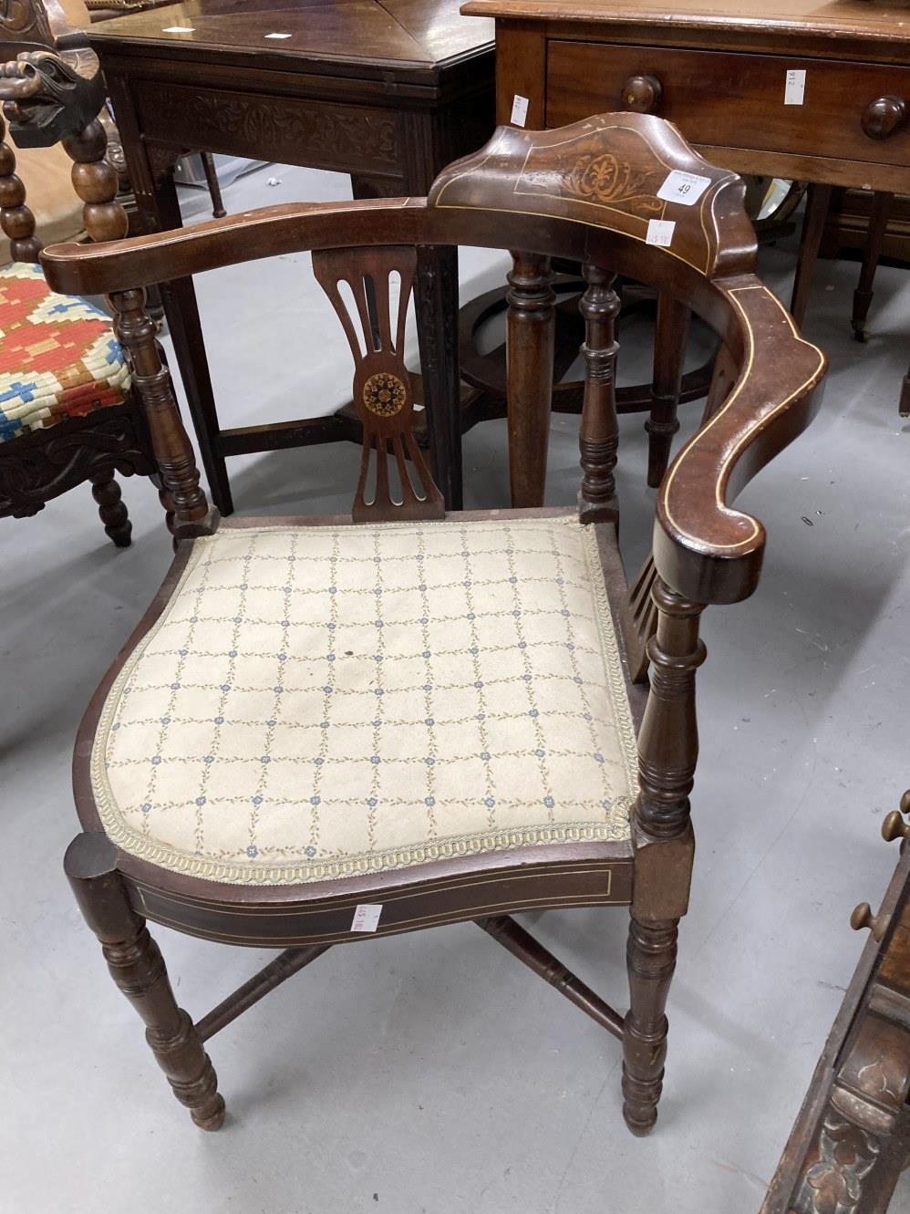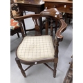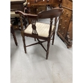 Edwardian inlaid mahogany corner chair with cross stretchers.